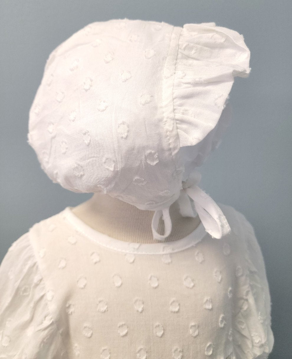The Adele romper has a fun, all over polka-dot design. It features a 3 button opening at the back, puff sleeves, and a matching polka-dot bonnet. Made from lightweight cotton, this romper is ideal for baby blessings, christenings, or just a casual summer outfit.