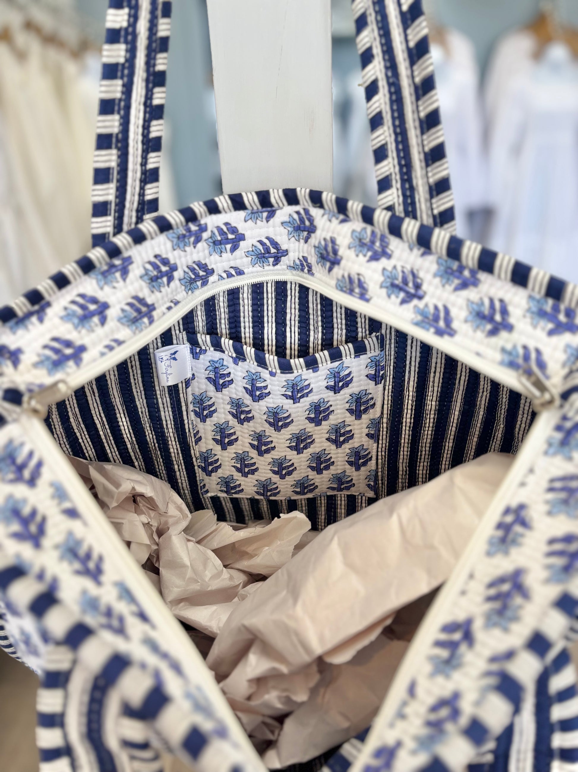 Big enough to hold everything you need, but still light-weight, this cotton quilted bag is perfect to take to the Temple and versatile enough to use it for any of your other outings. This bag has a zipper closure on top and an inside pouch pocket. This bag makes a great gift. Order one for yourself and one for a friend!