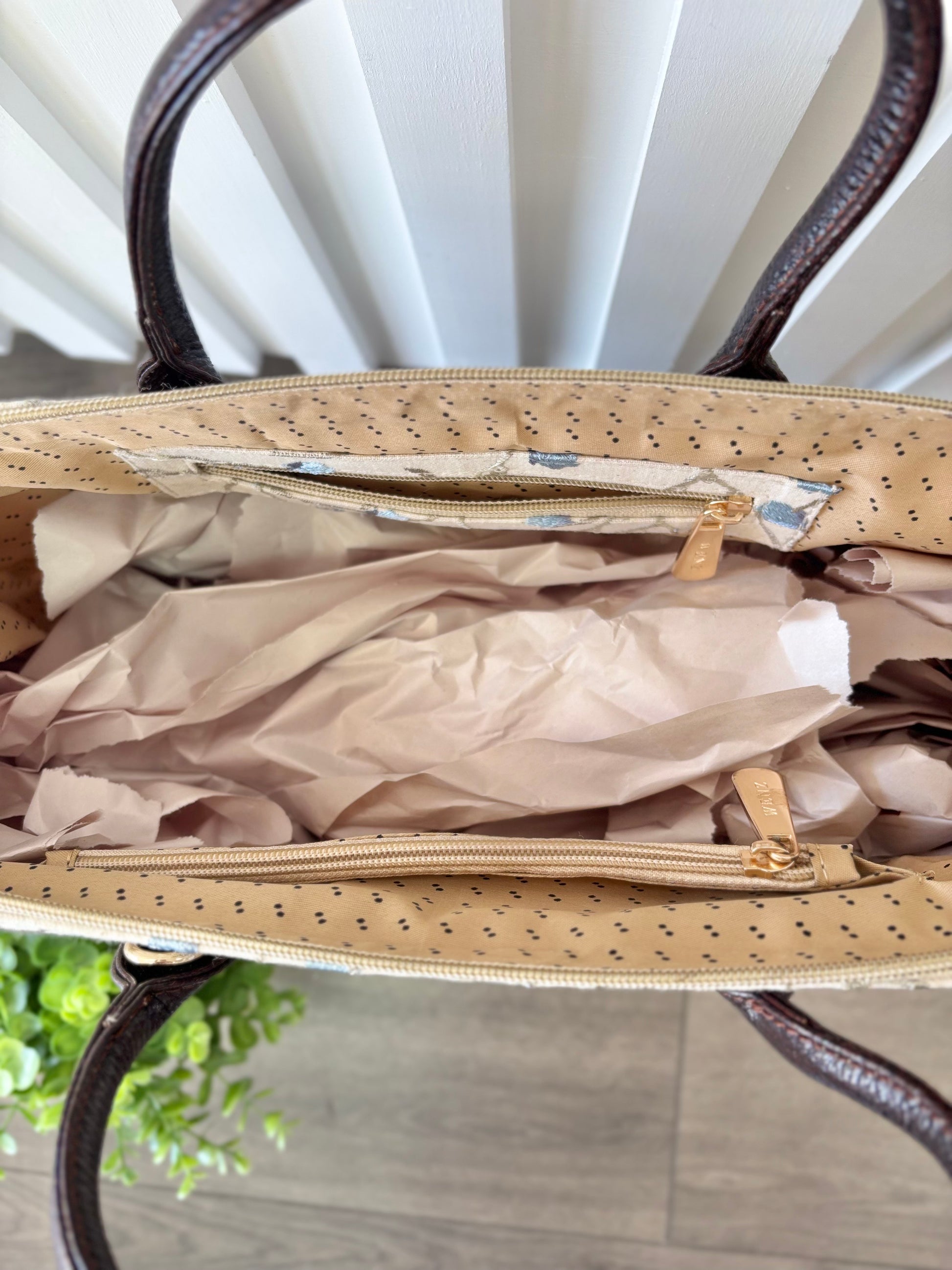 This bag is beautifully made with embroidered flower blossom fabric. The leather handles are attached to a sturdy top frame that will keep the bag open for easy access, or keep it closed with the double directional zipper. This bag has two inside zipper pockets and an inside pouch to keep everything organized.