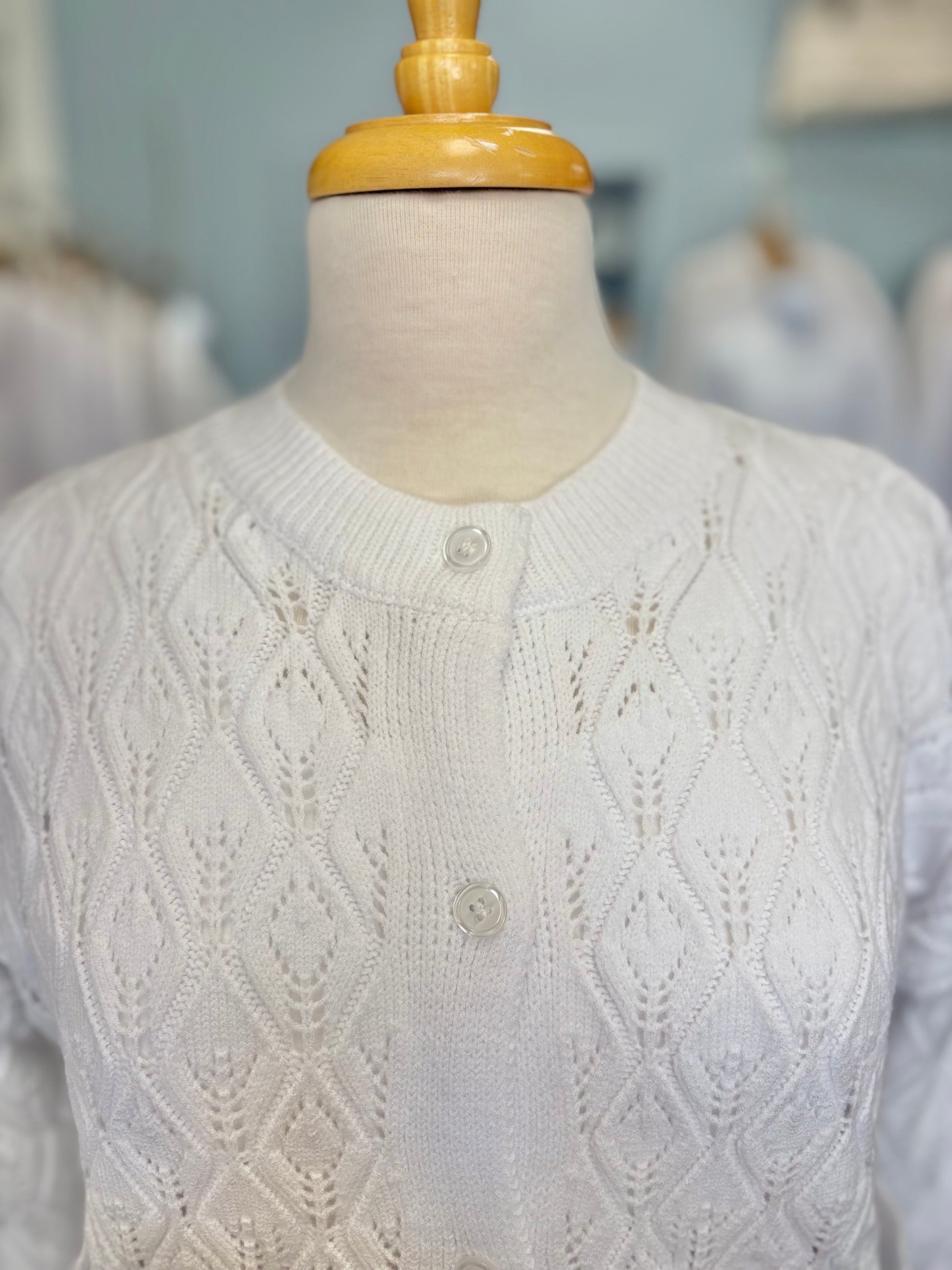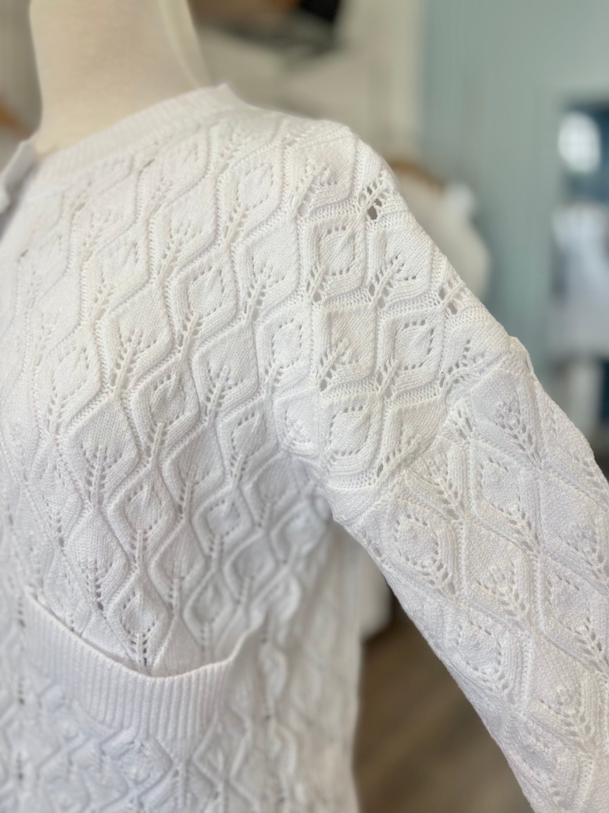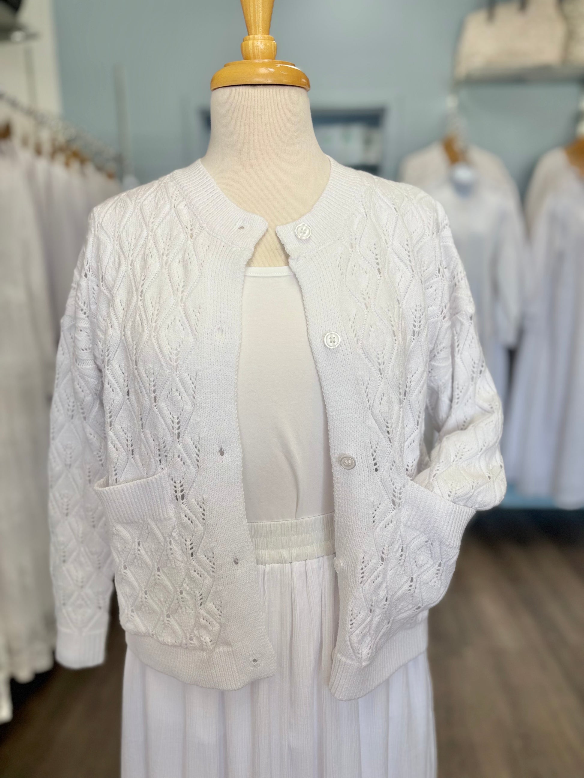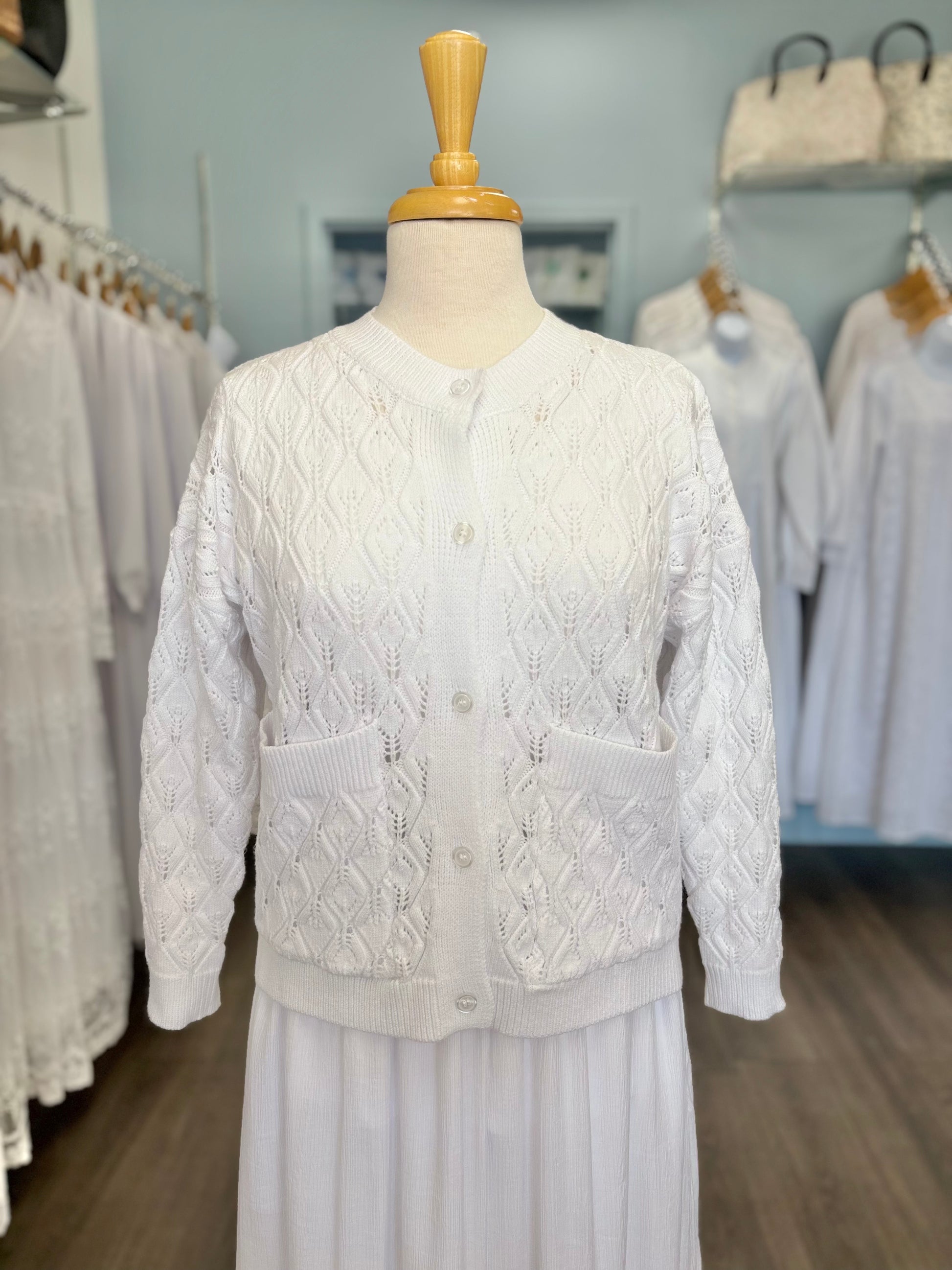 This white button up cardigan is the perfect addition to your temple clothing during the winter or any time of year. With a beautiful pattern and very soft fabric, it can be worn buttoned or open. There are two pockets on the outside and two additional pockets on the inside of this cardigan for added convenience.