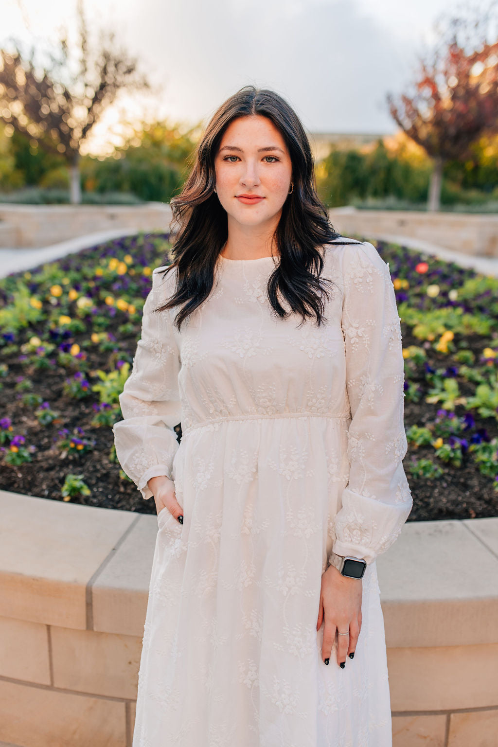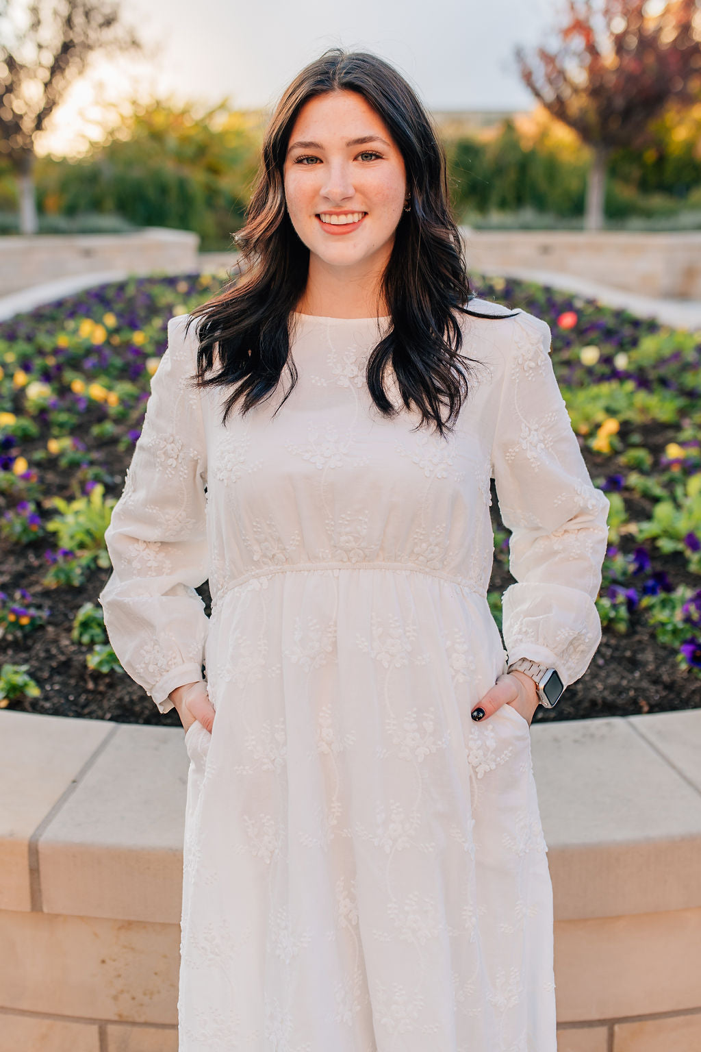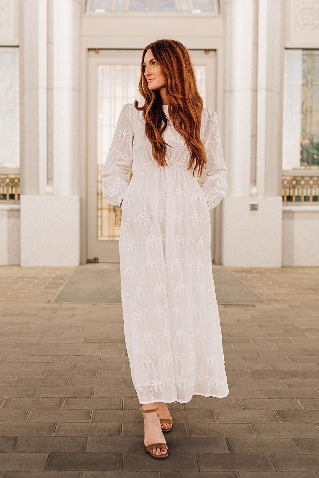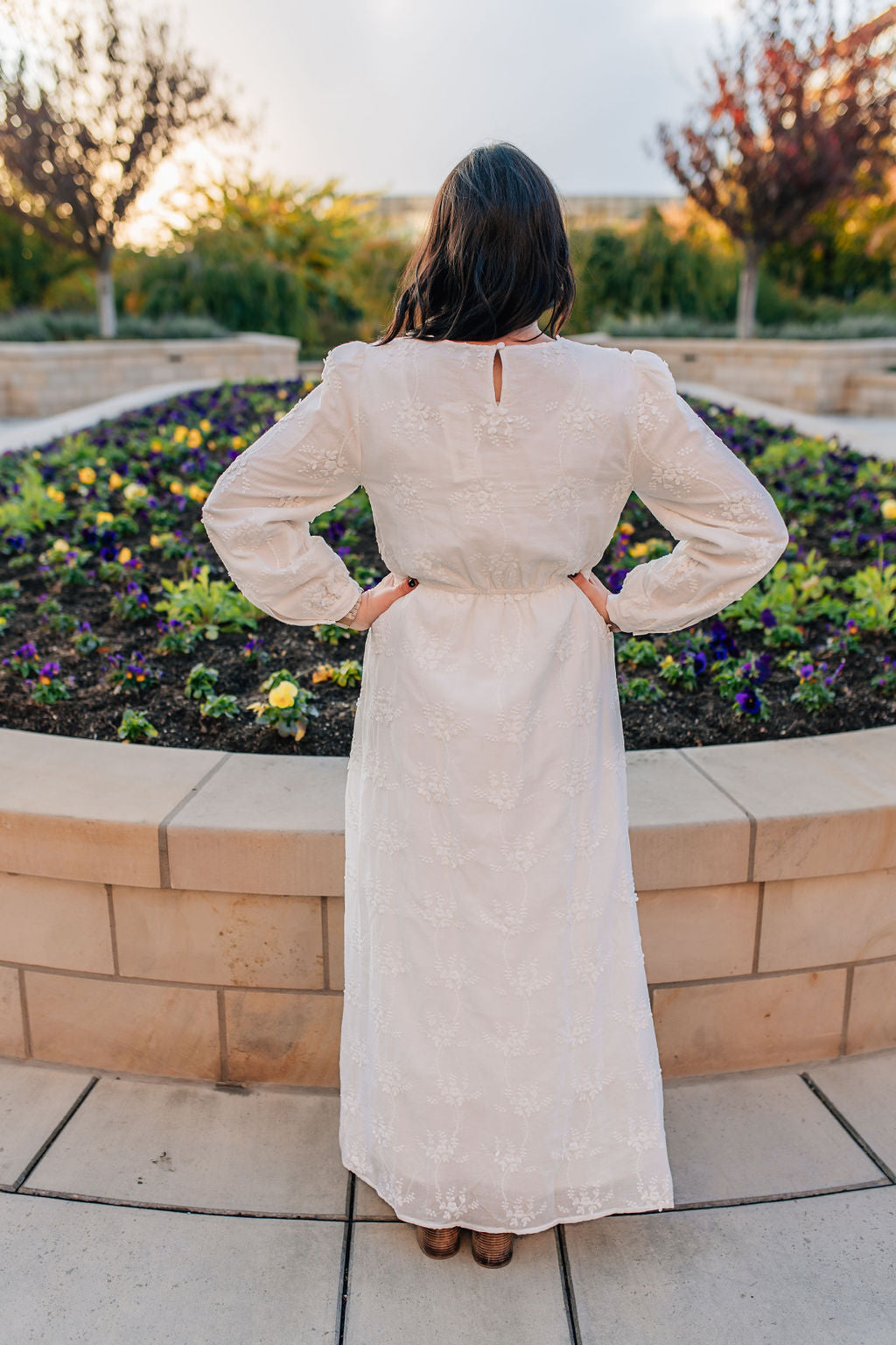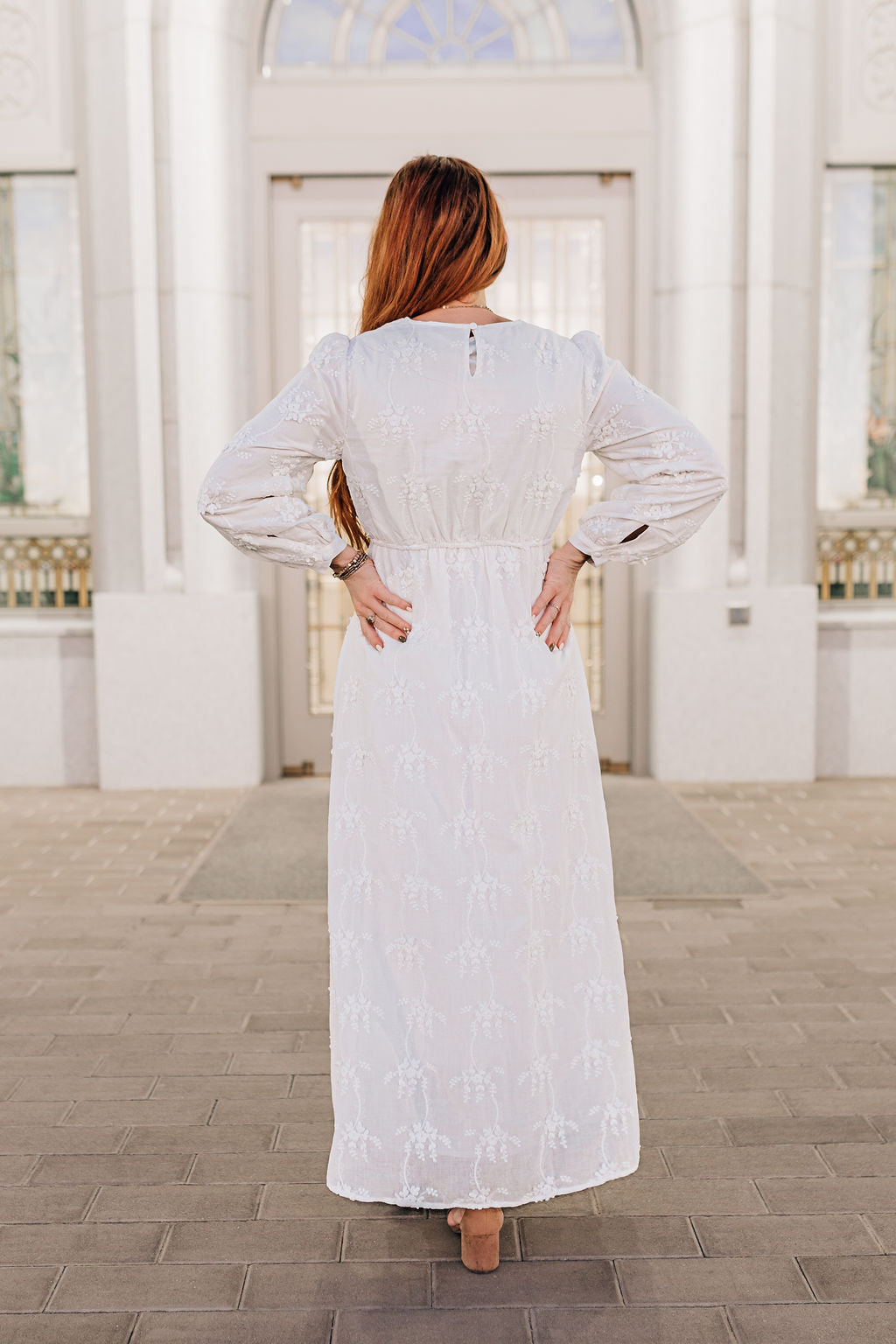 The Cassie dress is made from a beautiful floral designed fabric. The dress has elastic at the waist and a button cuff on the sleeves. There are two side pockets and a keyhole button closure in the back neckline. It is perfect for temple visits, weddings, or for casual wear. This dress is fully lined.