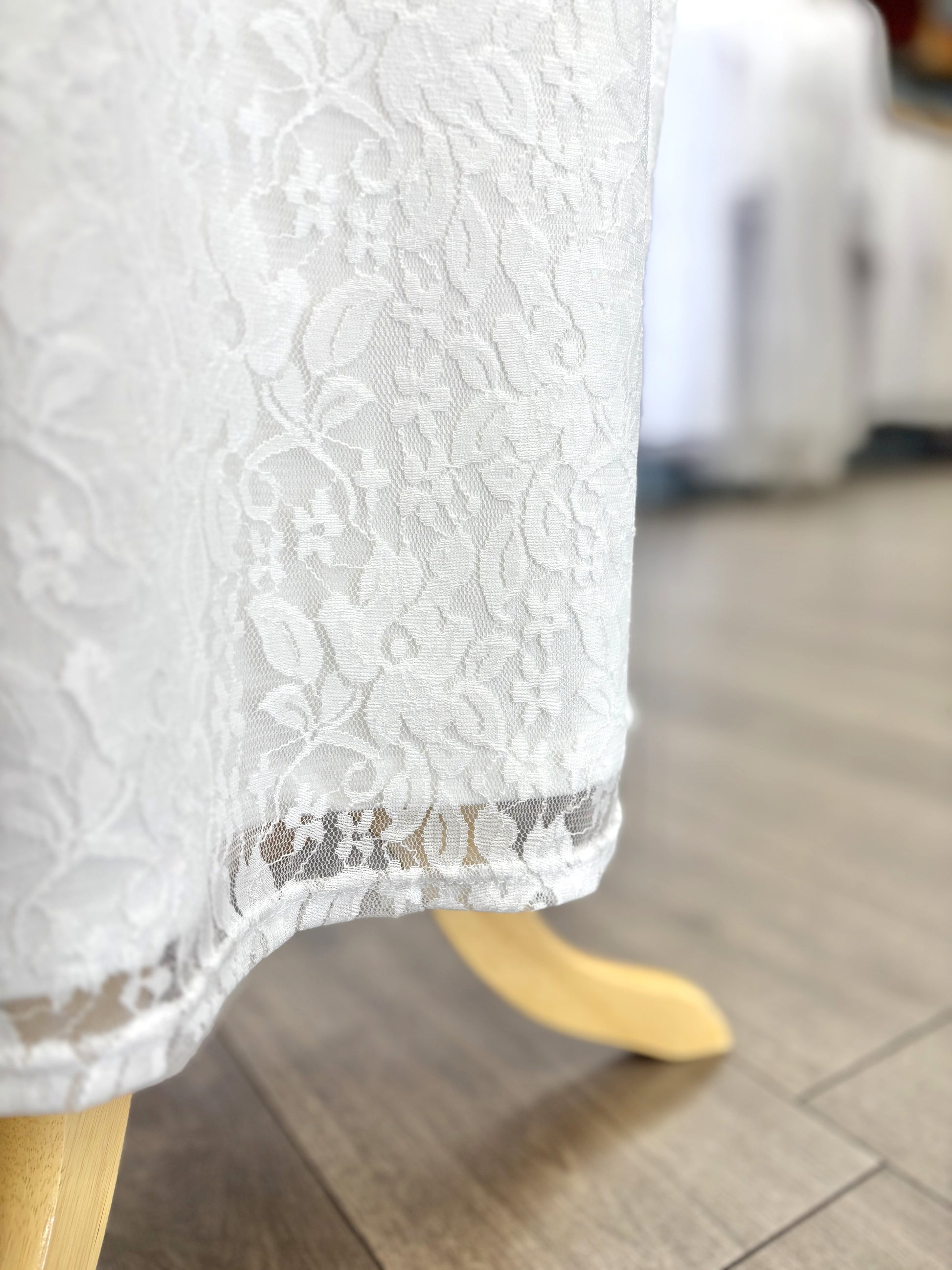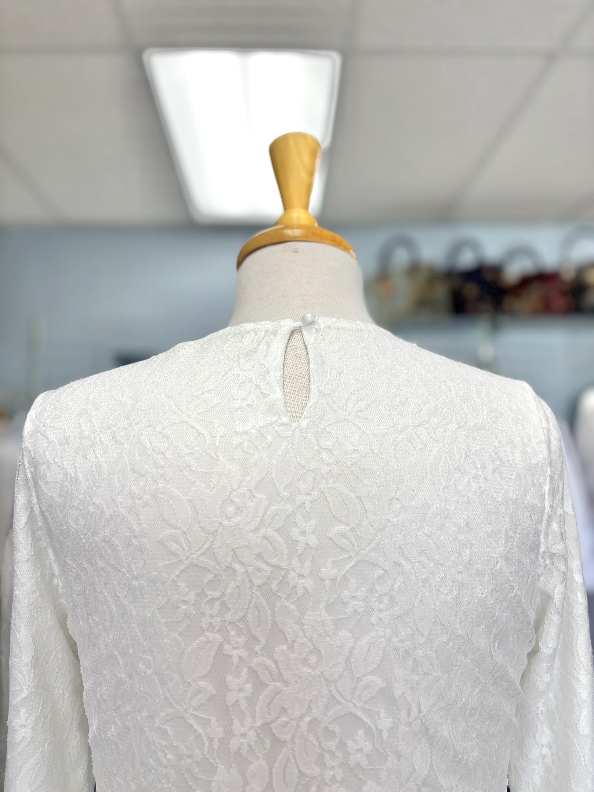 The unique lace dress is made to look like a skirt and top but it is all attached. The stretch lace is light and comfortable and fully lined. This dress has pockets in the skirt and a round neckline.