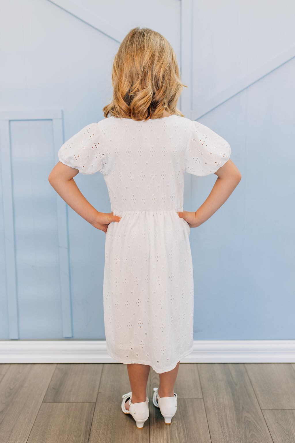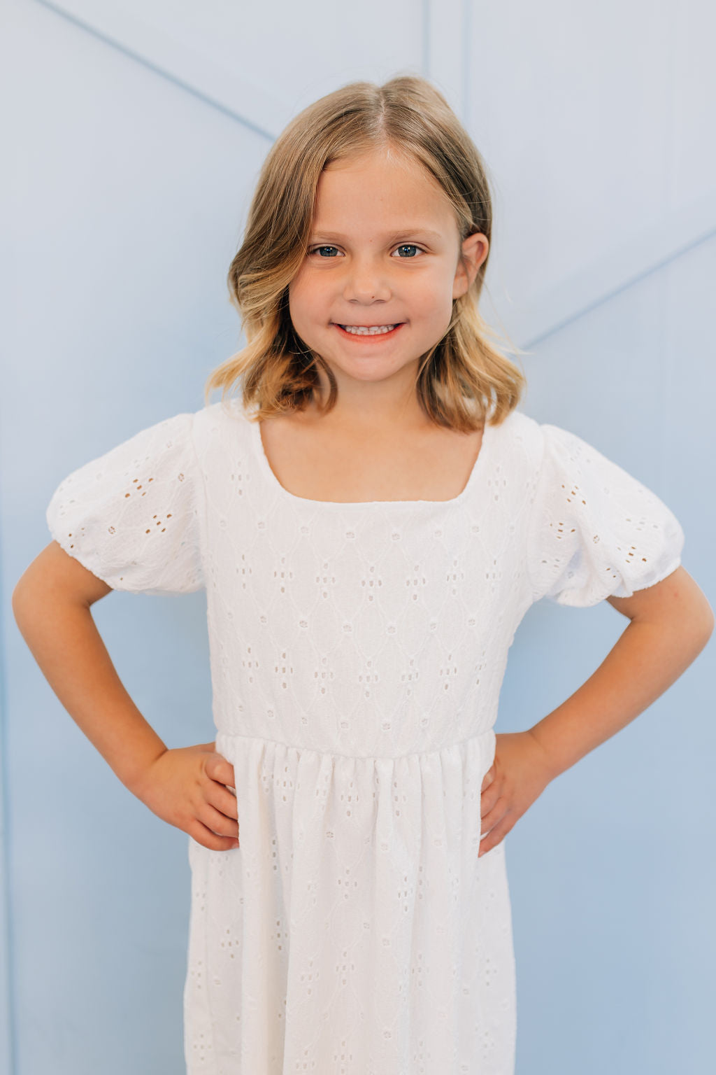 The Charlotte dress is made from a soft eyelet polyester with a beautiful sheen. The rounded square neckline is very flattering and modern. The slightly puff style sleeves gather at the bottom with a loose elastic fit. This dress is a wonderful choice for an LDS Baptism Dress, communion, casual wear, or flower girl. Made in the USA.
