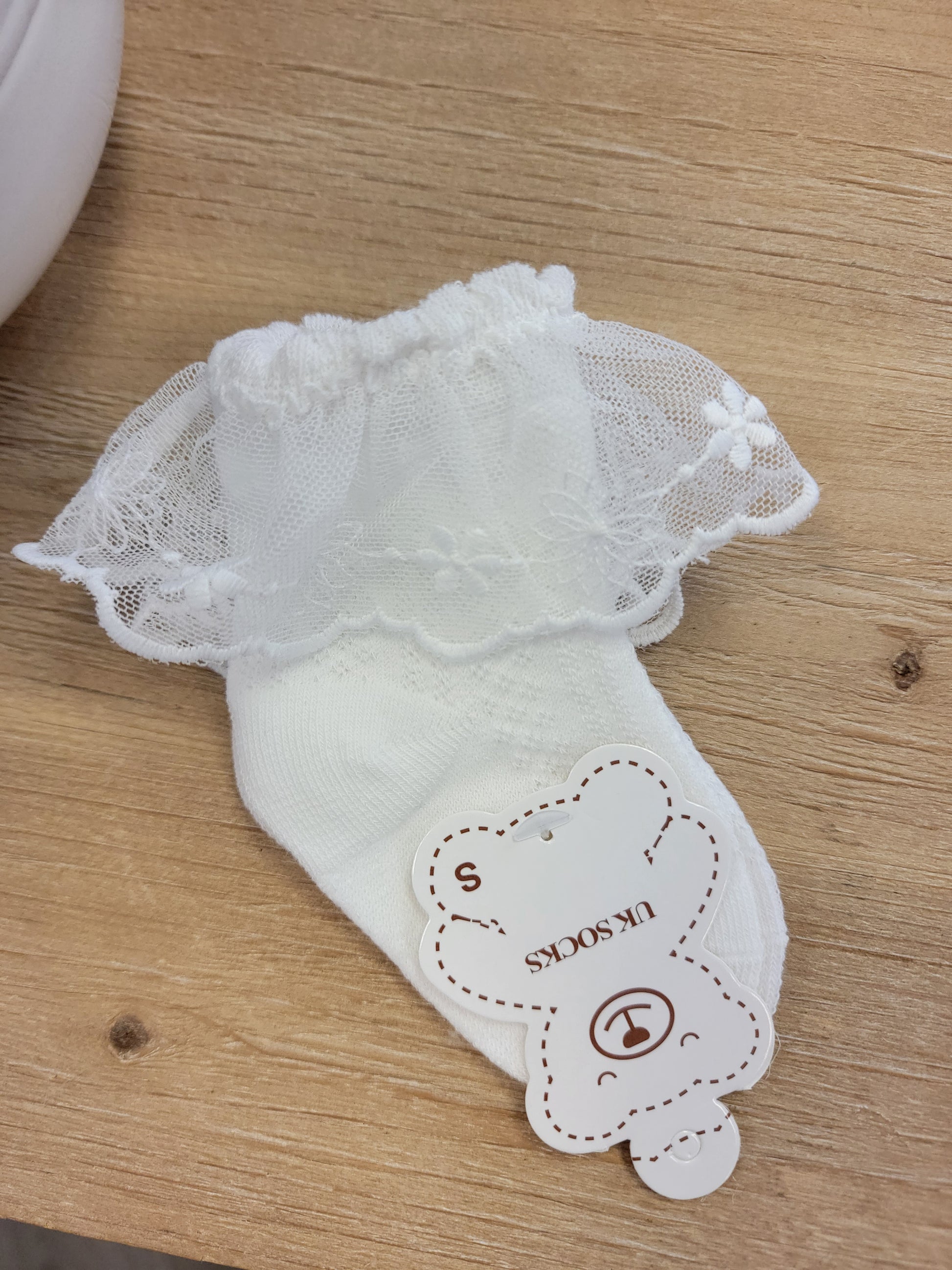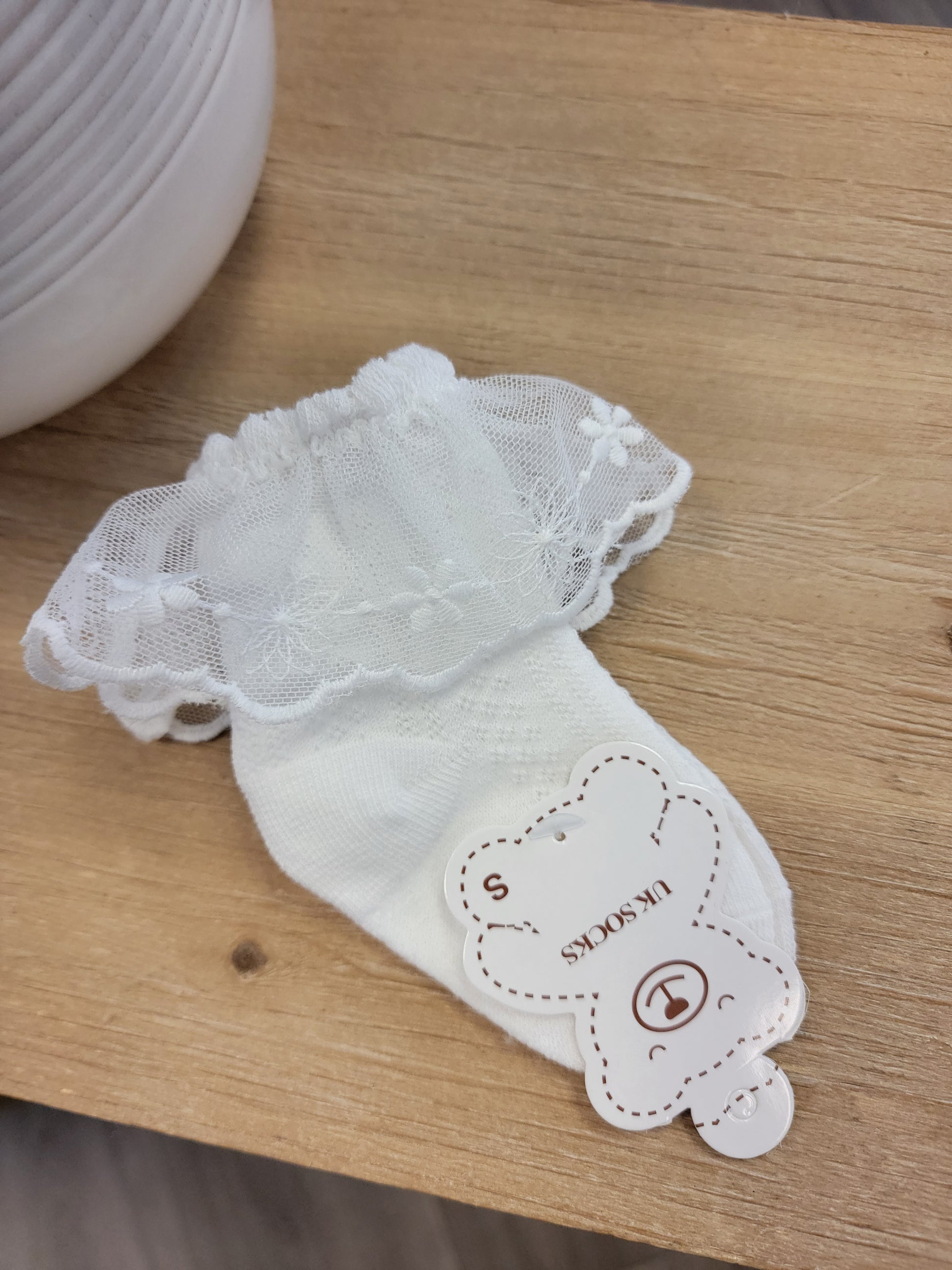 These stretchy baby socks have a cute cable pattern on the sock, and floral embroidery and lace on the fold down ruffle top. They pair perfect with any dress and shoes, and work for any occasion.