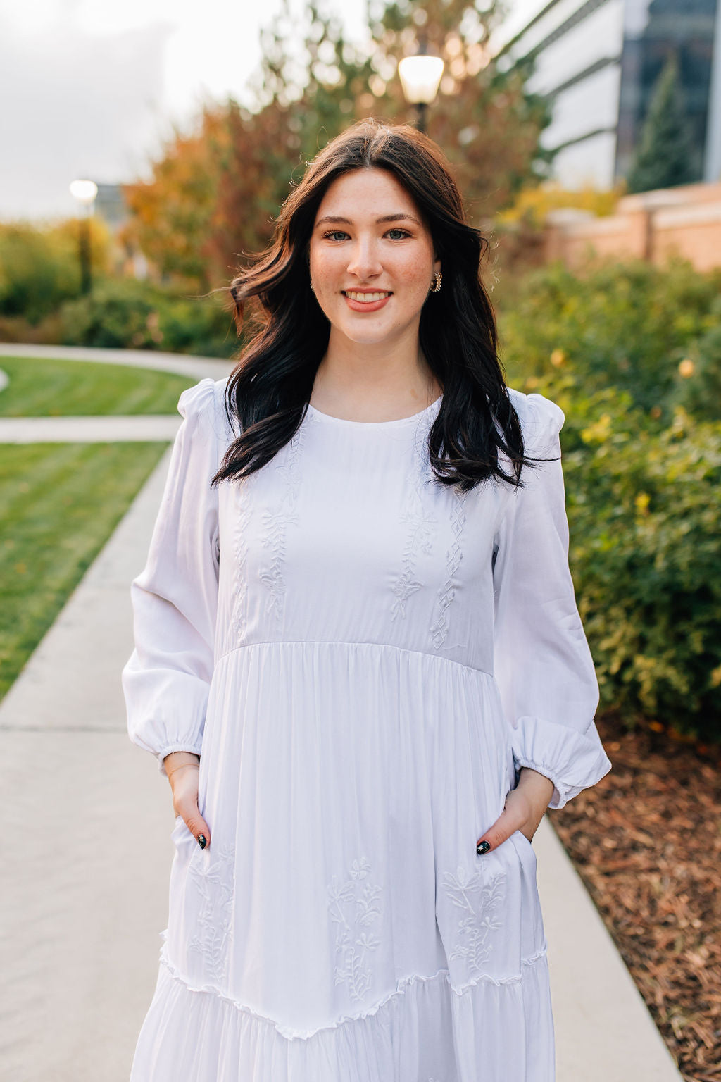 This temple dress is simple yet elegant with beautiful embroidery work on the bodice and spaced through the skirt. The bishop style sleeves are loose and comfortable with elastic on the cuff. Fully lined with pockets and a keyhole button in the back makes it easy to put on.