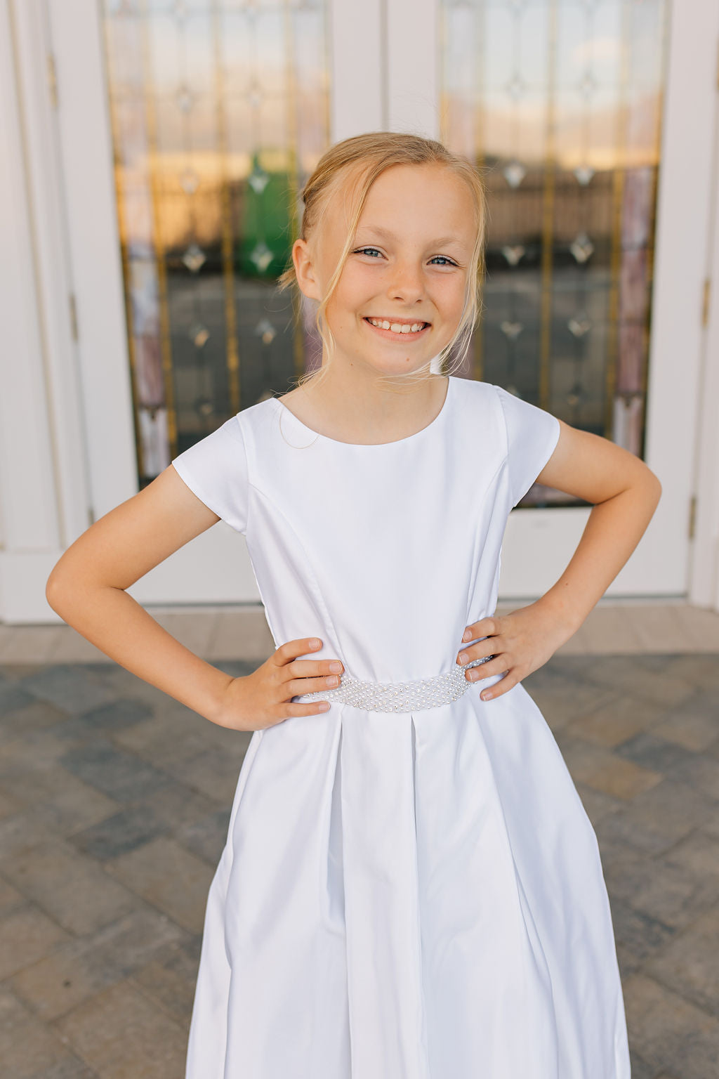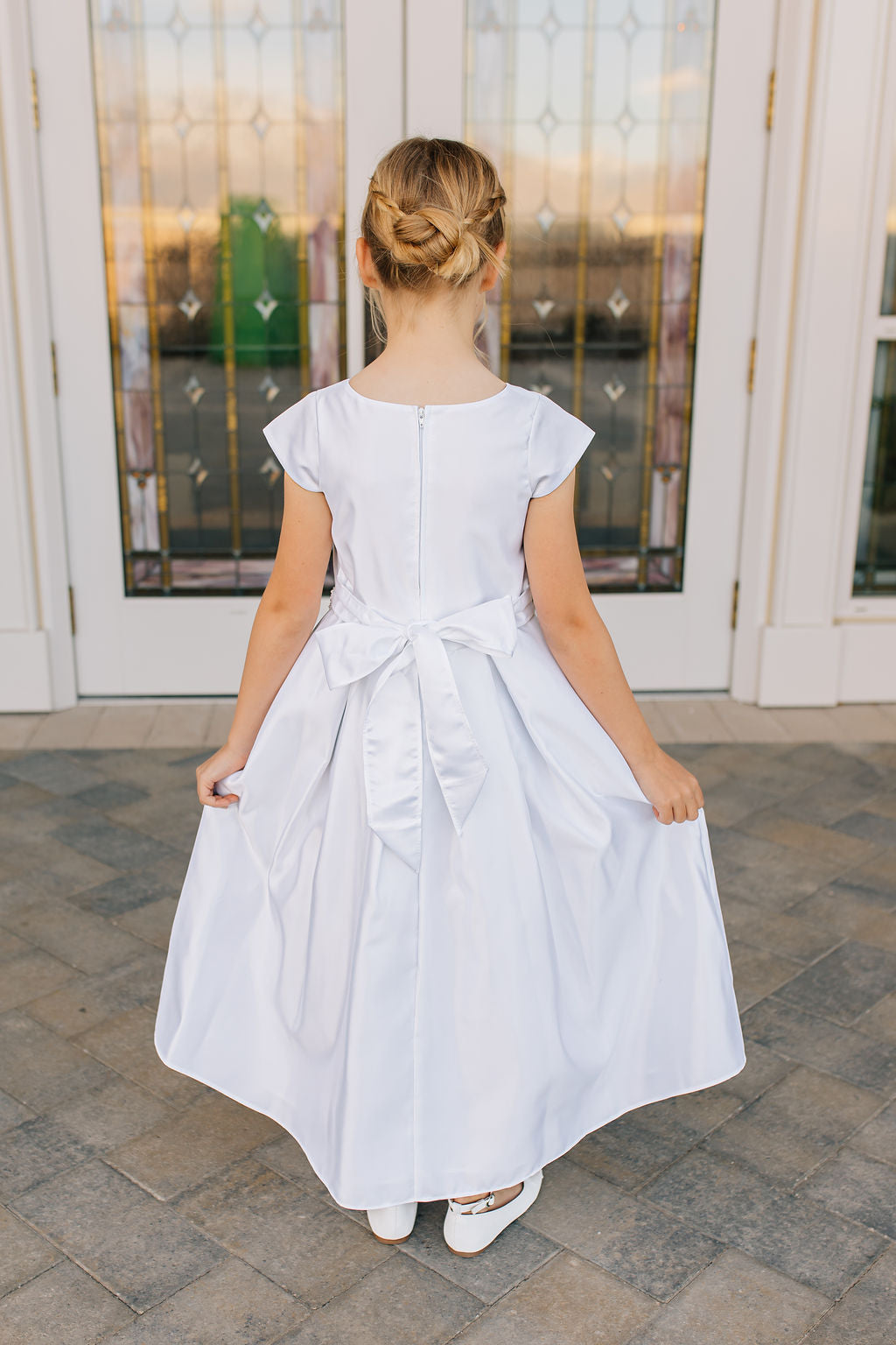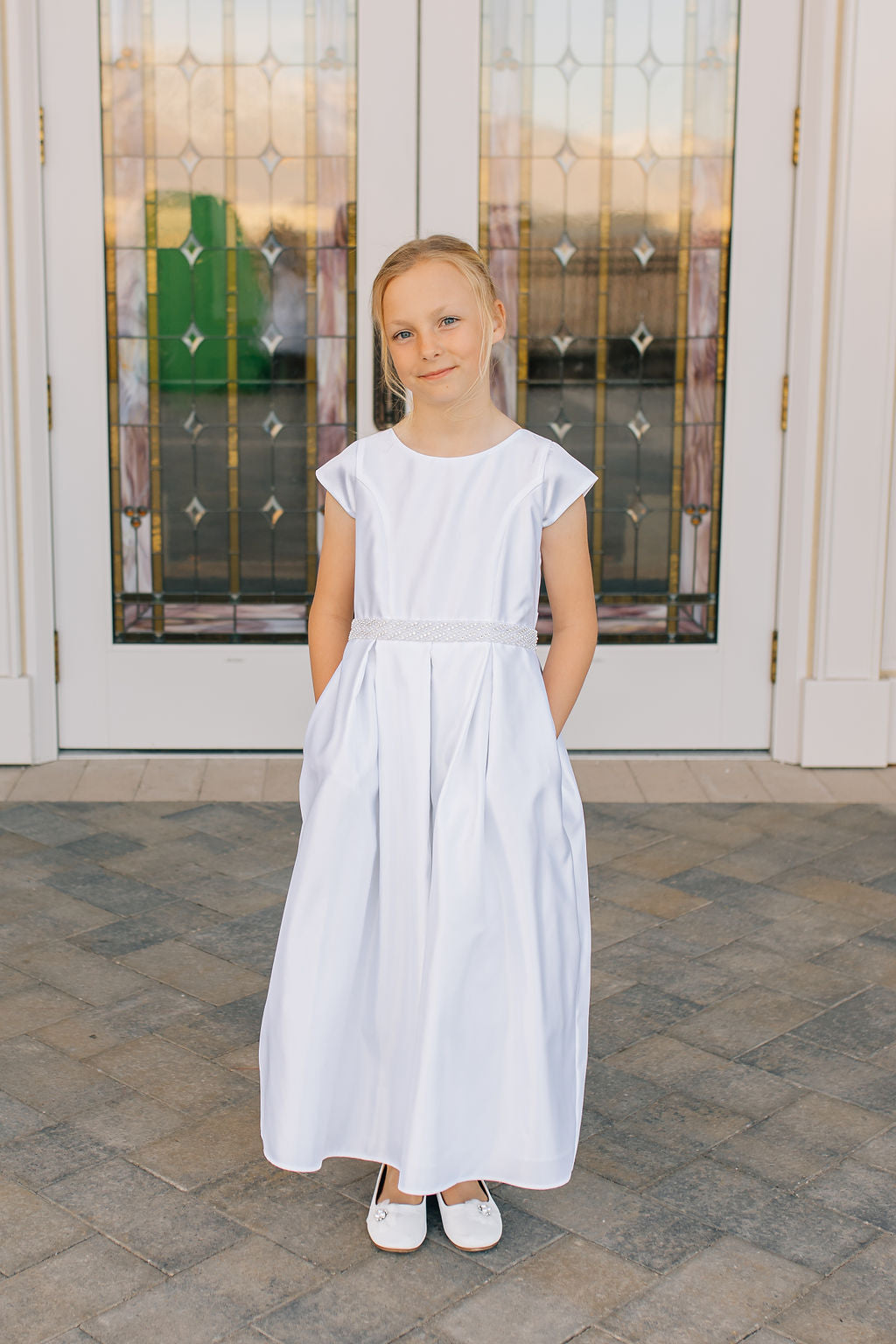 The Cora dress has a classic and timeless look. With an ankle length pleated skirt, cap sleeves, and a pearl and rhinestone belt, its perfect for a baptism, communion, or any special event! This dress zips up the back and has a tie waist for extra security.