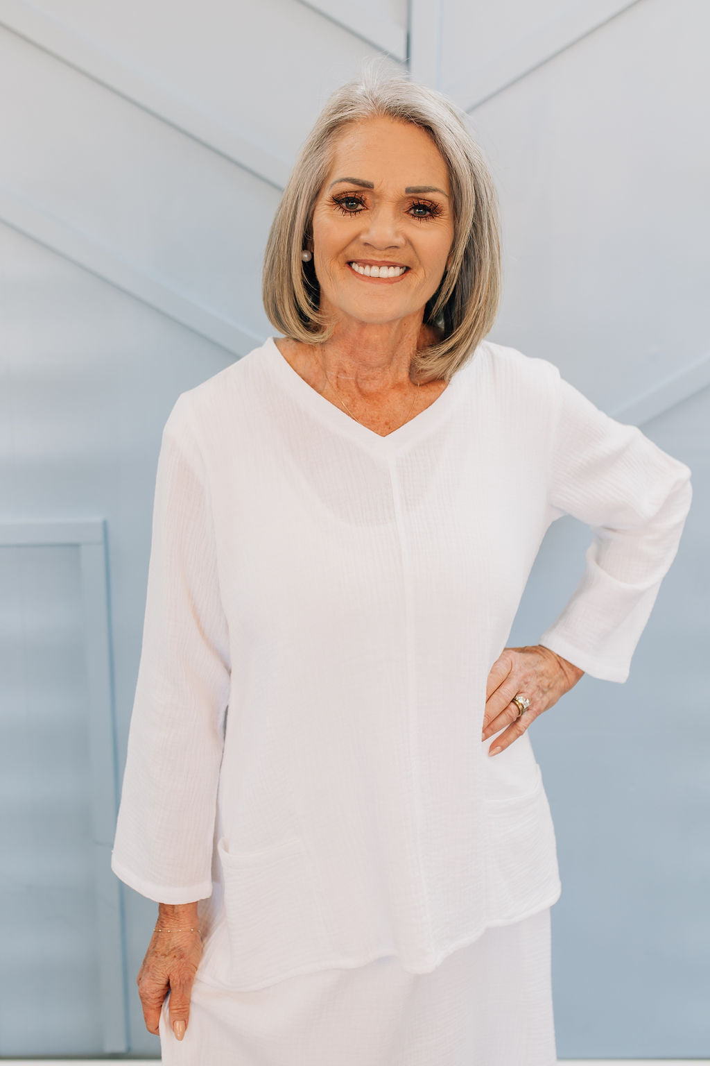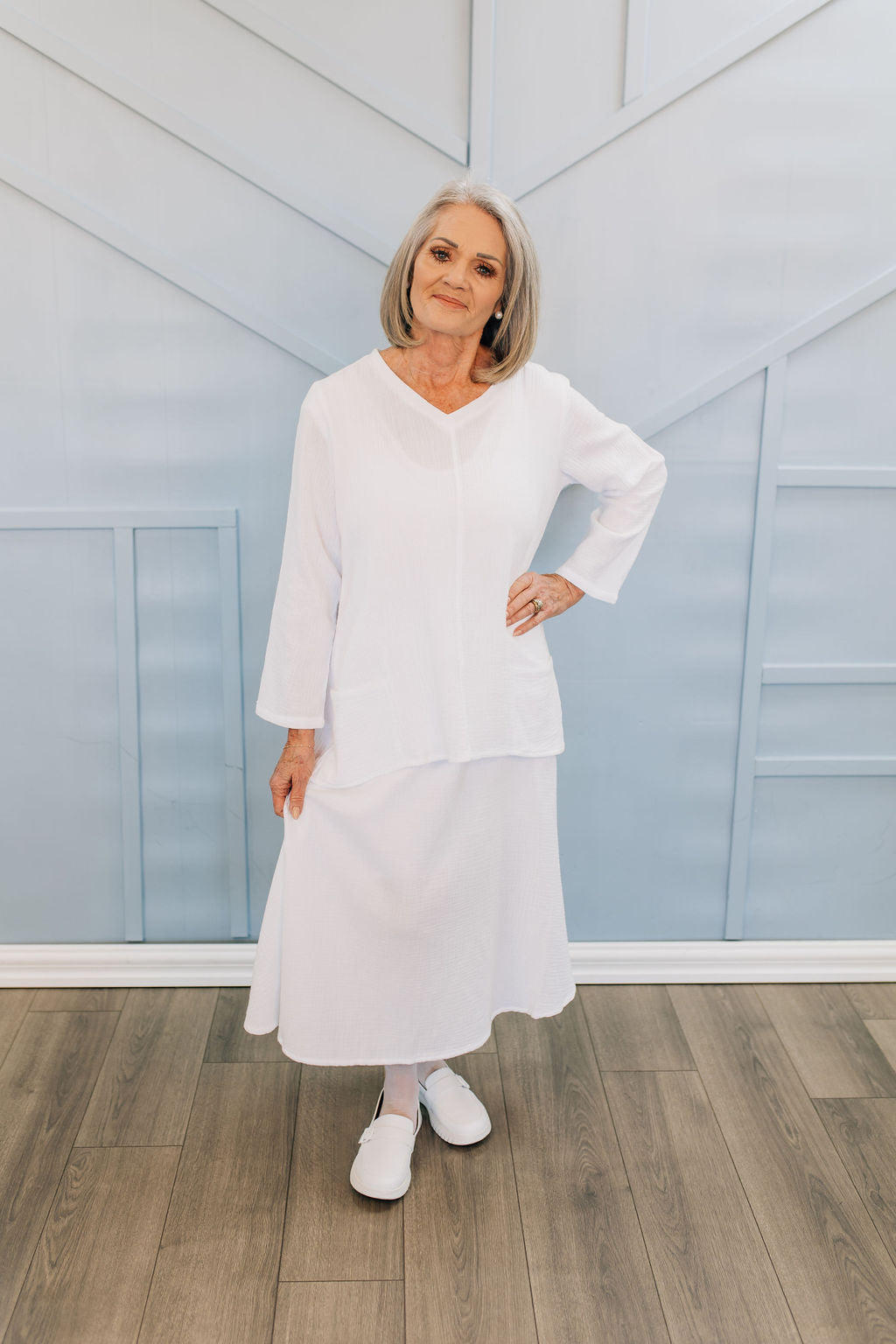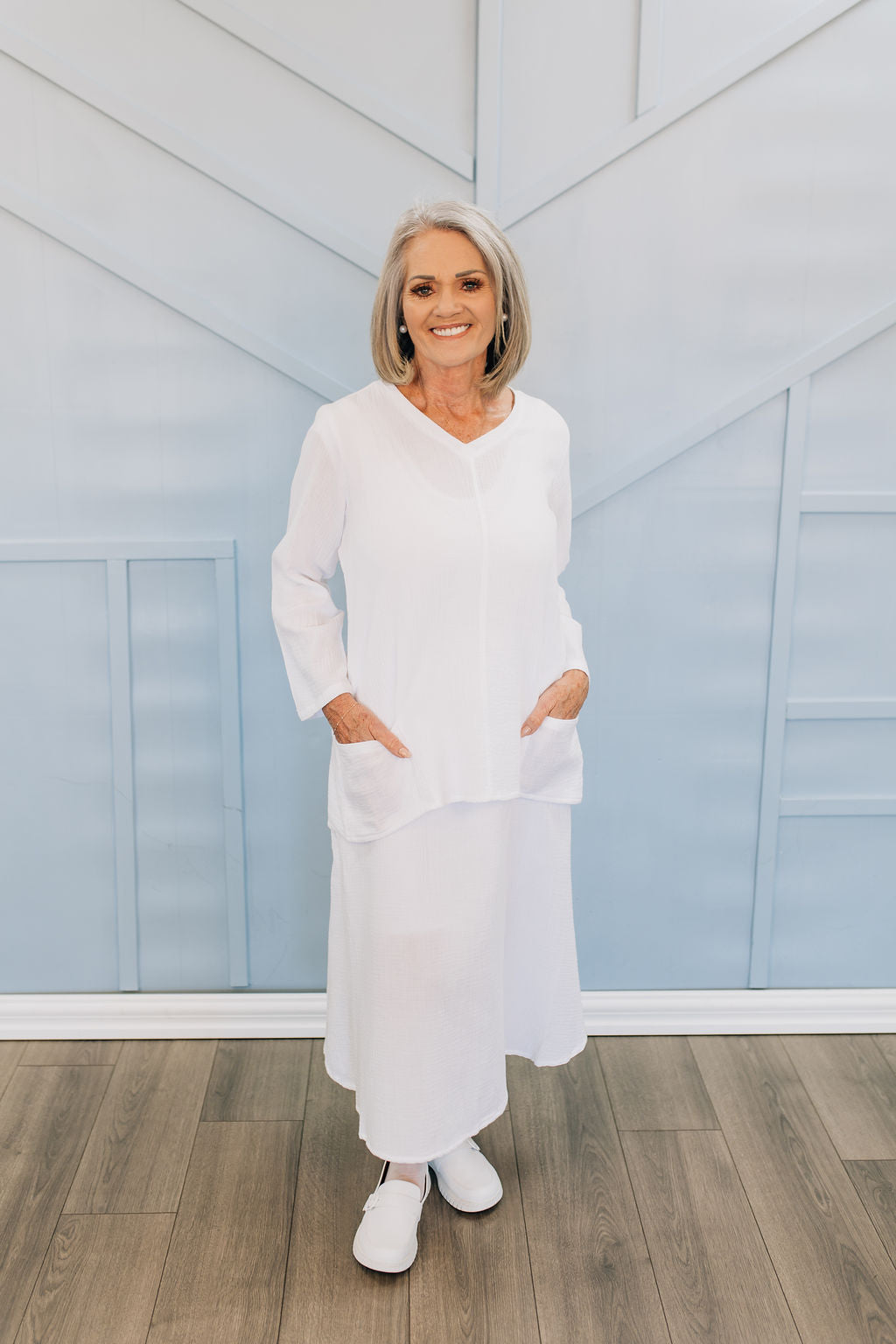 You will love the feel and fit of this 100% cotton Top. This top is soft and easy to wear, and has a slight texture. Features two front pockets and a modest v-neckline. Pairs as a set with our 100% Cotton Skirt. Bright white. This shirt is designed to have shorter sleeves, making it a great petite option.