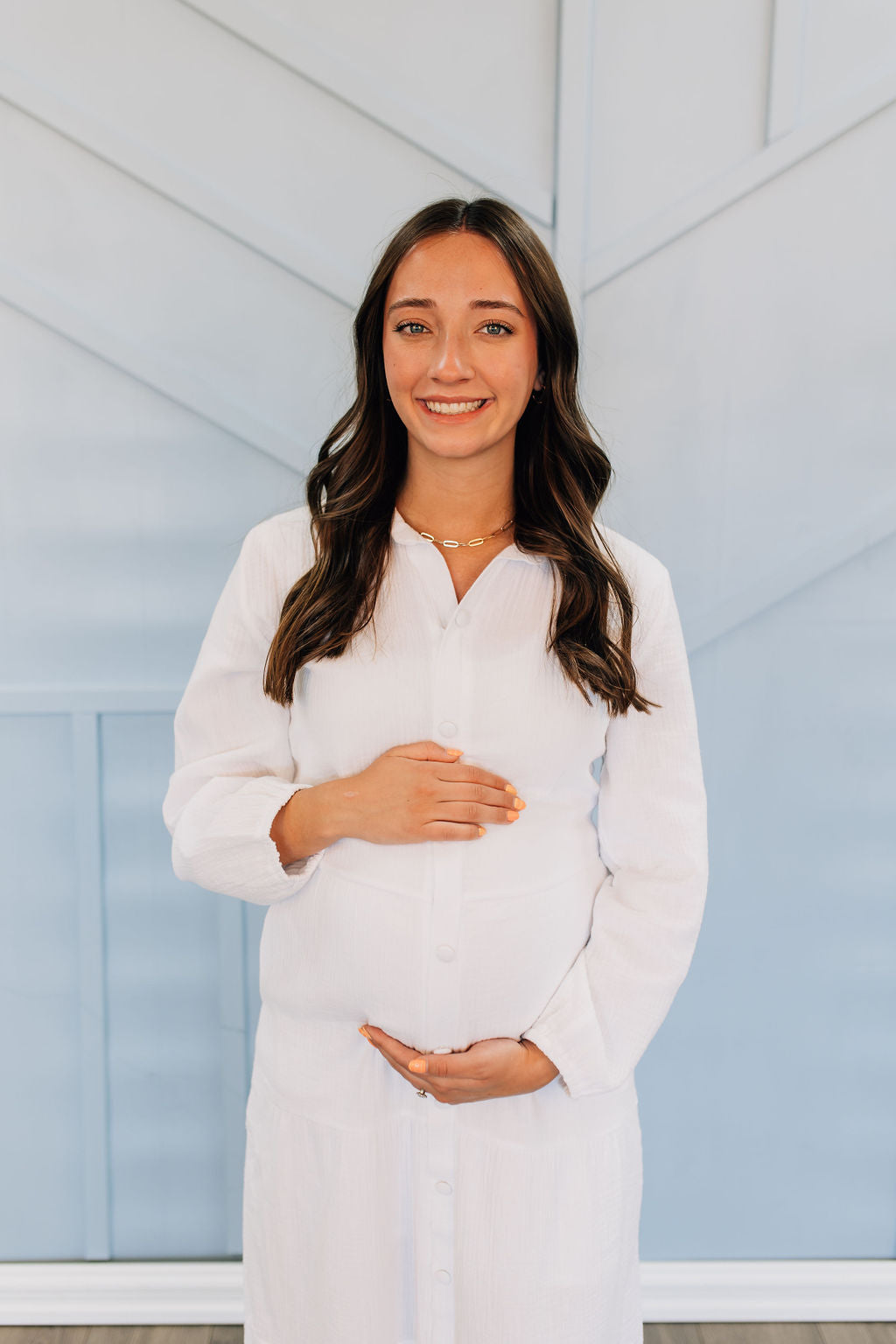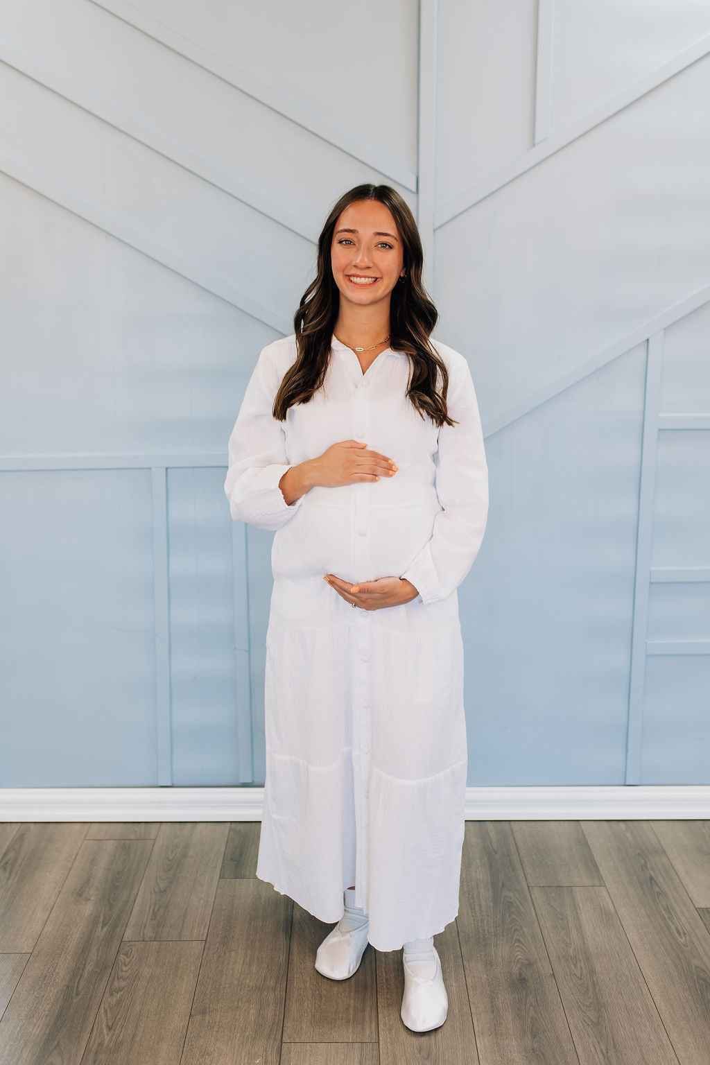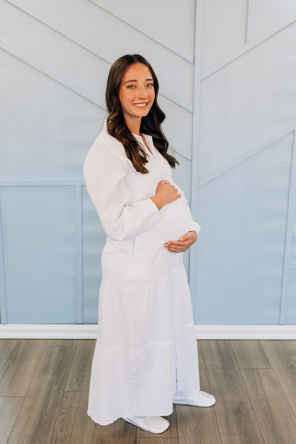 This Cotton Zipper dress is the perfect thing to wear to the temple, whether you are working there or visiting. It is made from a wrinkle resistant, soft cotton gauze fabric that is light and easy to wear. It features a combination front of half zipper, half button, with decorative buttons covering the zipper. This dress has a fold over collar, bishop sleeves with elastic at the cuffs, two side pockets, and a tiered skirt.