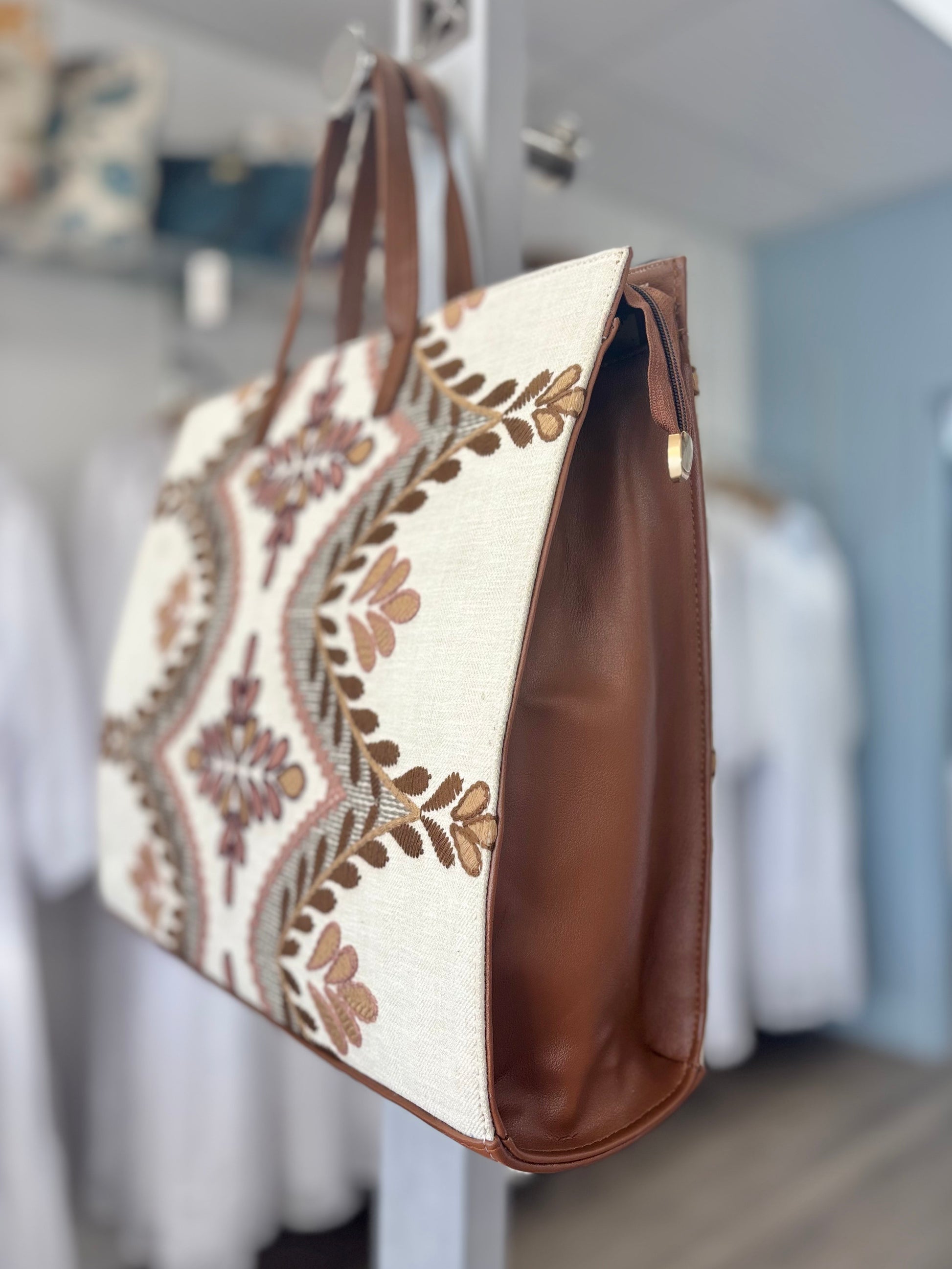 This bag is beautifully made with sturdy fabric, and butter soft faux leather. The cream background helps the pink and brown leaf pattern stand out beautifully. This bag has leather handles and features a wide zipper opening and two inside pockets for organizational needs.