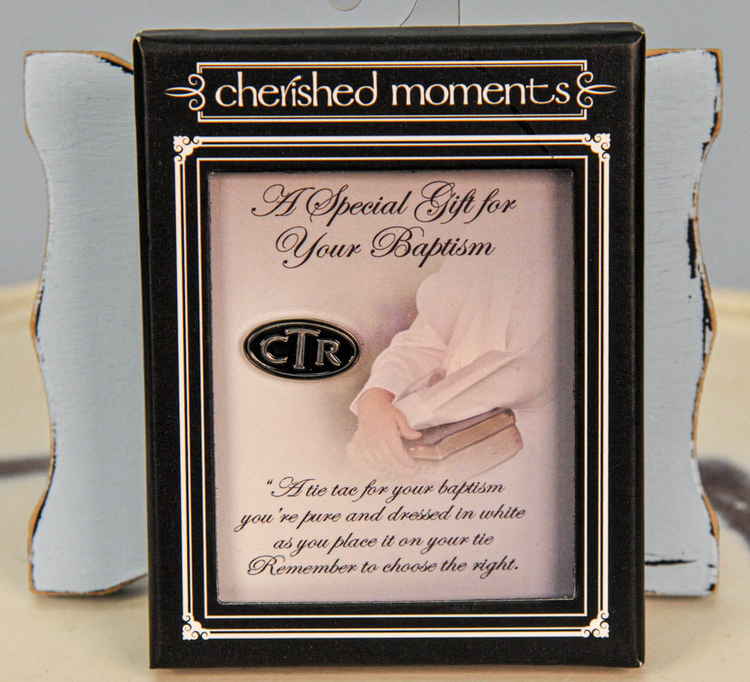 This tie tac is made by Cherished Moments. It is a simple pin with "CTR" on it, and can be given as a gift for boys and girls. Often purchased as a baptism gift, and given to sons to pin on their suit jackets or ties. It is perfect to remind any child of their special day. Imported.