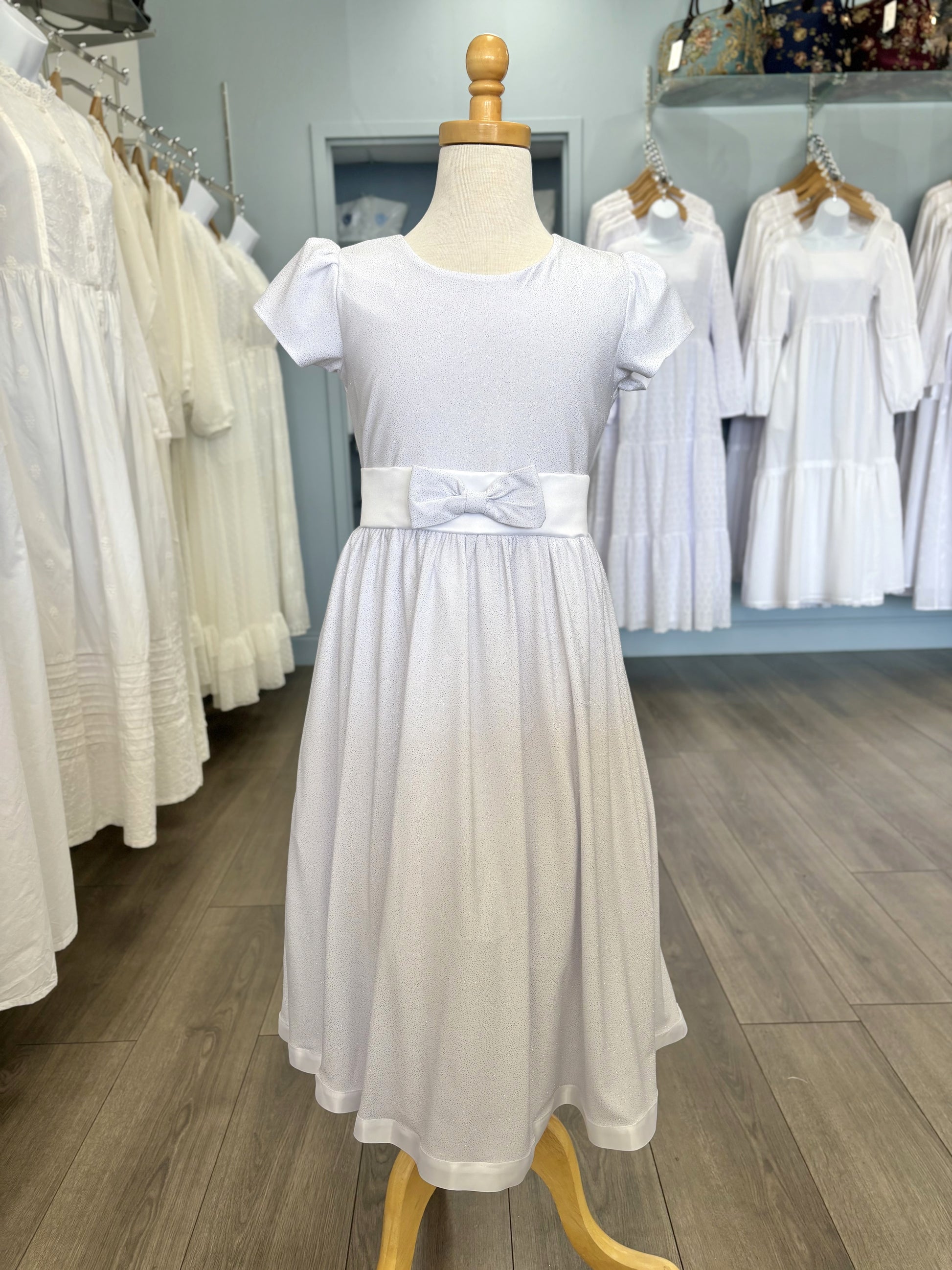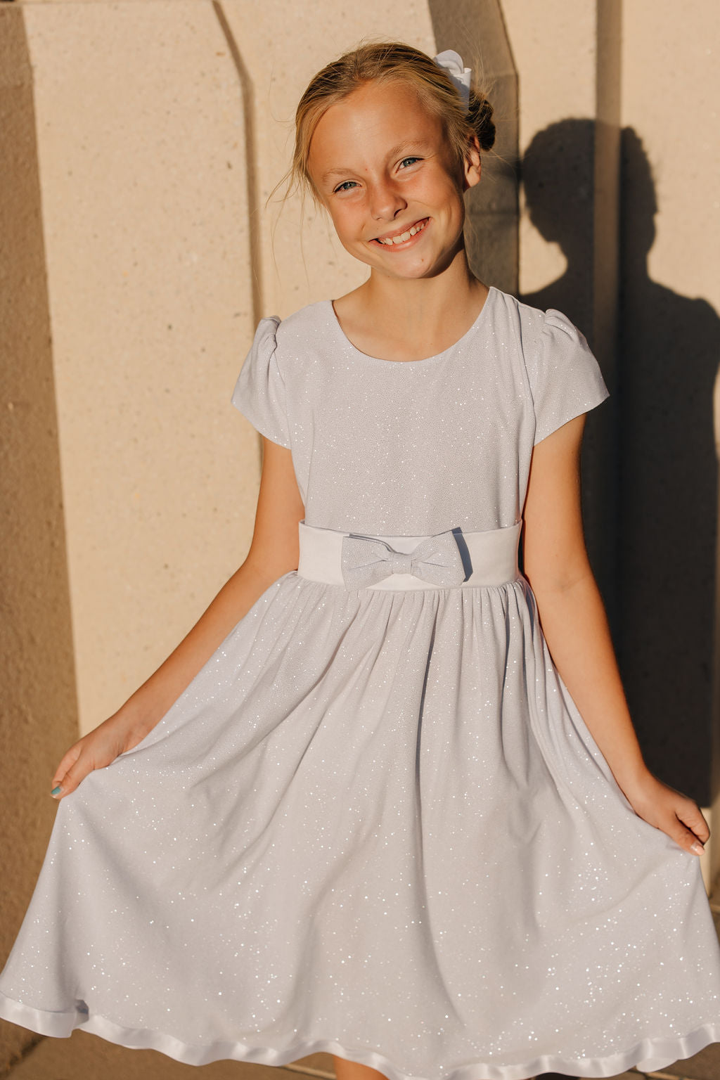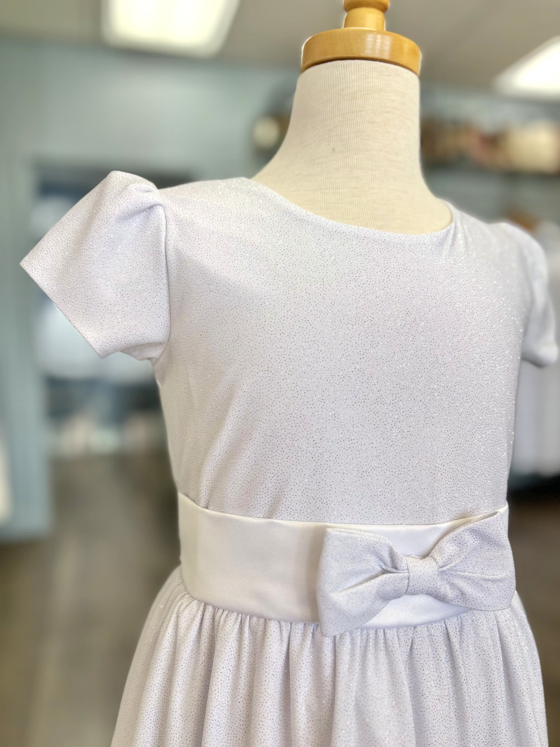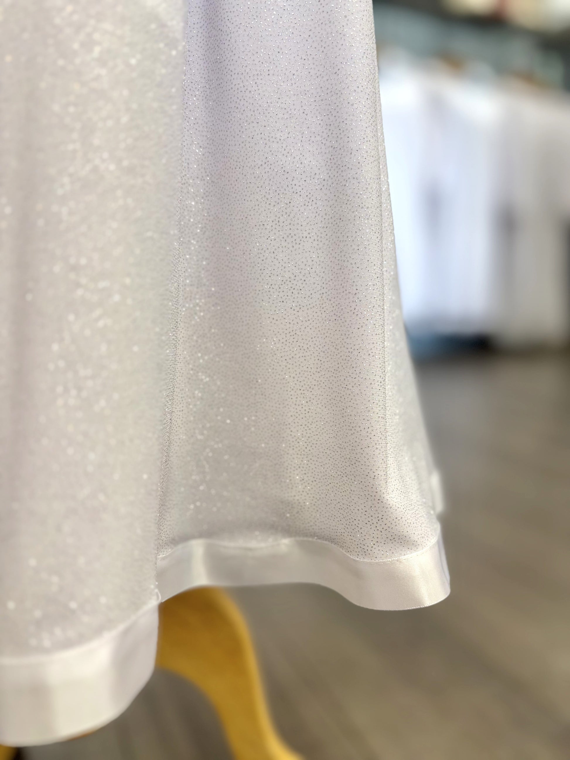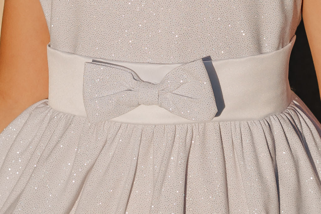The Elena dress is a fun and unique option for baptisms or other special occasions! It's made from beautiful sparkly fabric, has a satin band around the waist, a sparkly bow at the front, and has a hem that is lined with soft ribbon. This dress has a tie waist and zipper at the back. Made in the U.S.A.