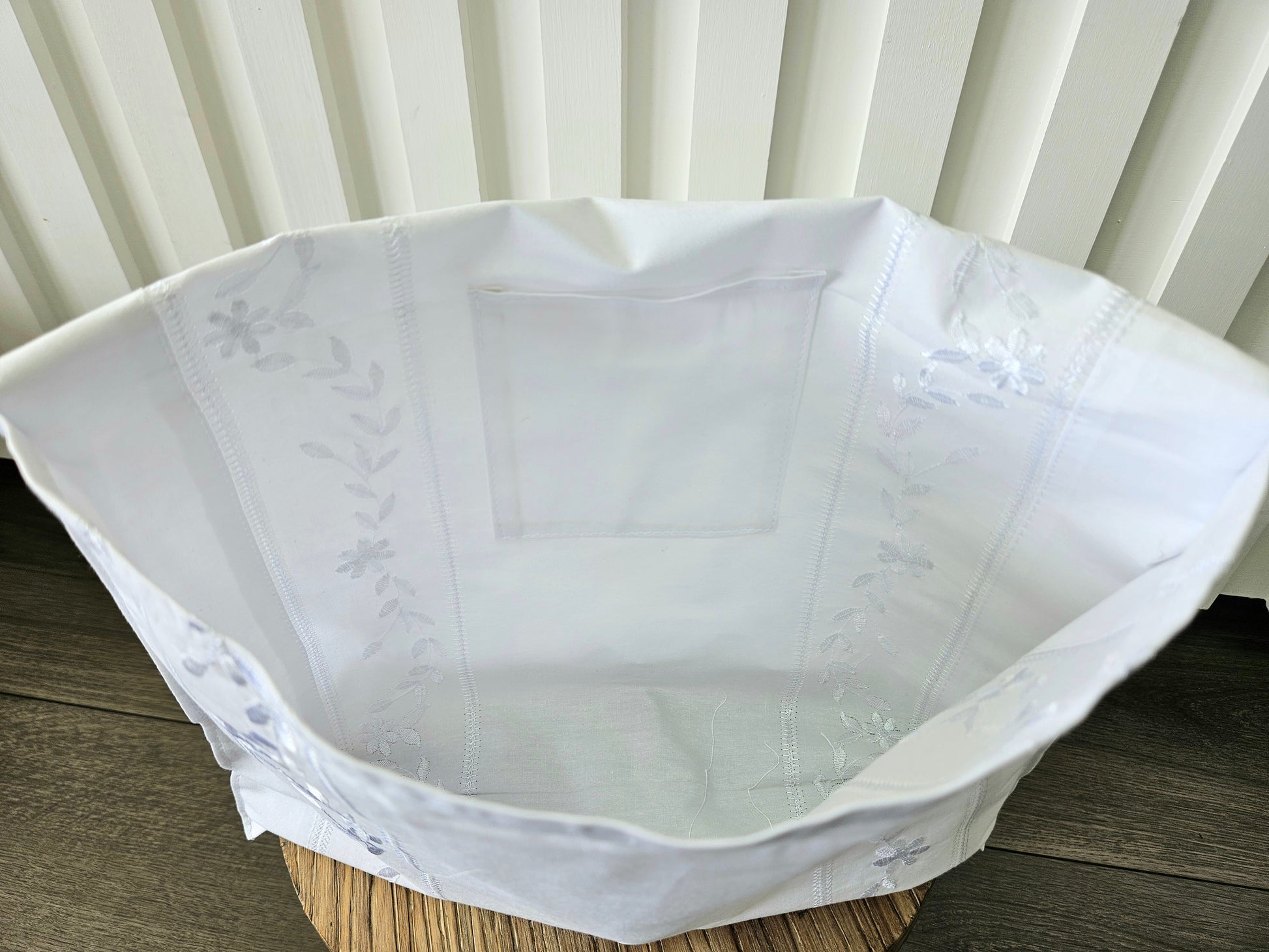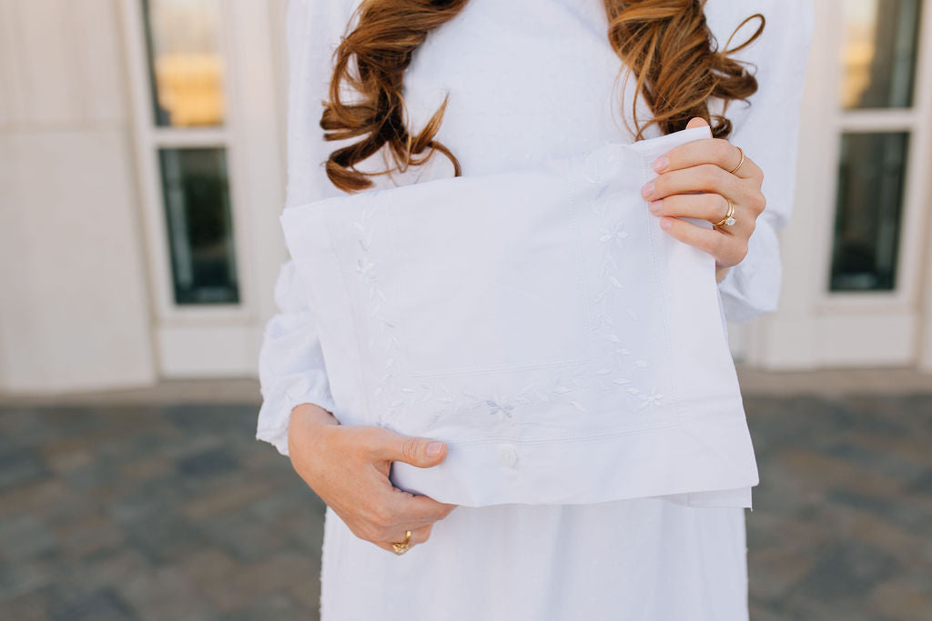 The Garden Envelope is made of 100% cotton and has a beautiful stitched boarder vines and flowers. This envelope has a top flap that buttons closed and an inside pocket. This Temple Envelope measures approximately 13.25" x 10.75" Inside pocket measures approximately 4"wide by 4.25" tall.