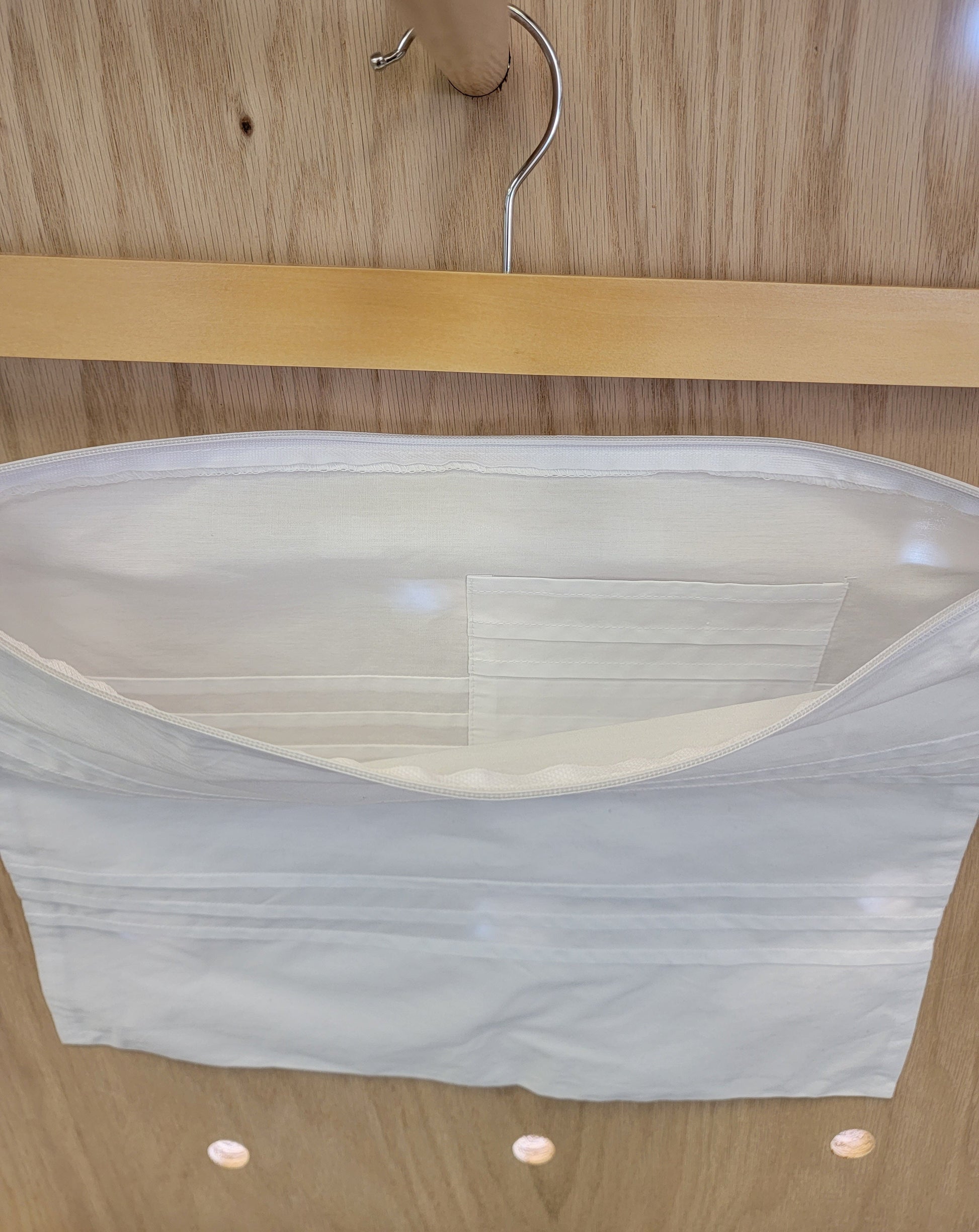 The Zipper Envelope can be used by either men or women. It is made of plain, soft 100% cotton with horizontal tuck designs across the surface with an inside pocket. Turn it upside down and nothing falls out. Approximately 11 x 14 inches.