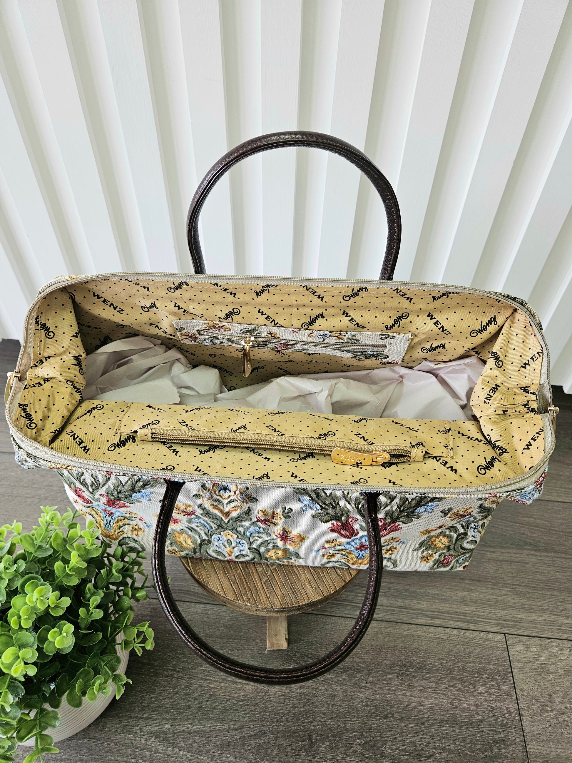 This bag is beautifully made with soft linen-like fabric in a gorgeous floral damask print in green, gold and rose. The leather handles are attached to a sturdy top frame that will keep the bag open for easy access, or keep it closed with the double directional zipper. This bag has two inside zipper pockets and an inside pouch to keep everything organized.