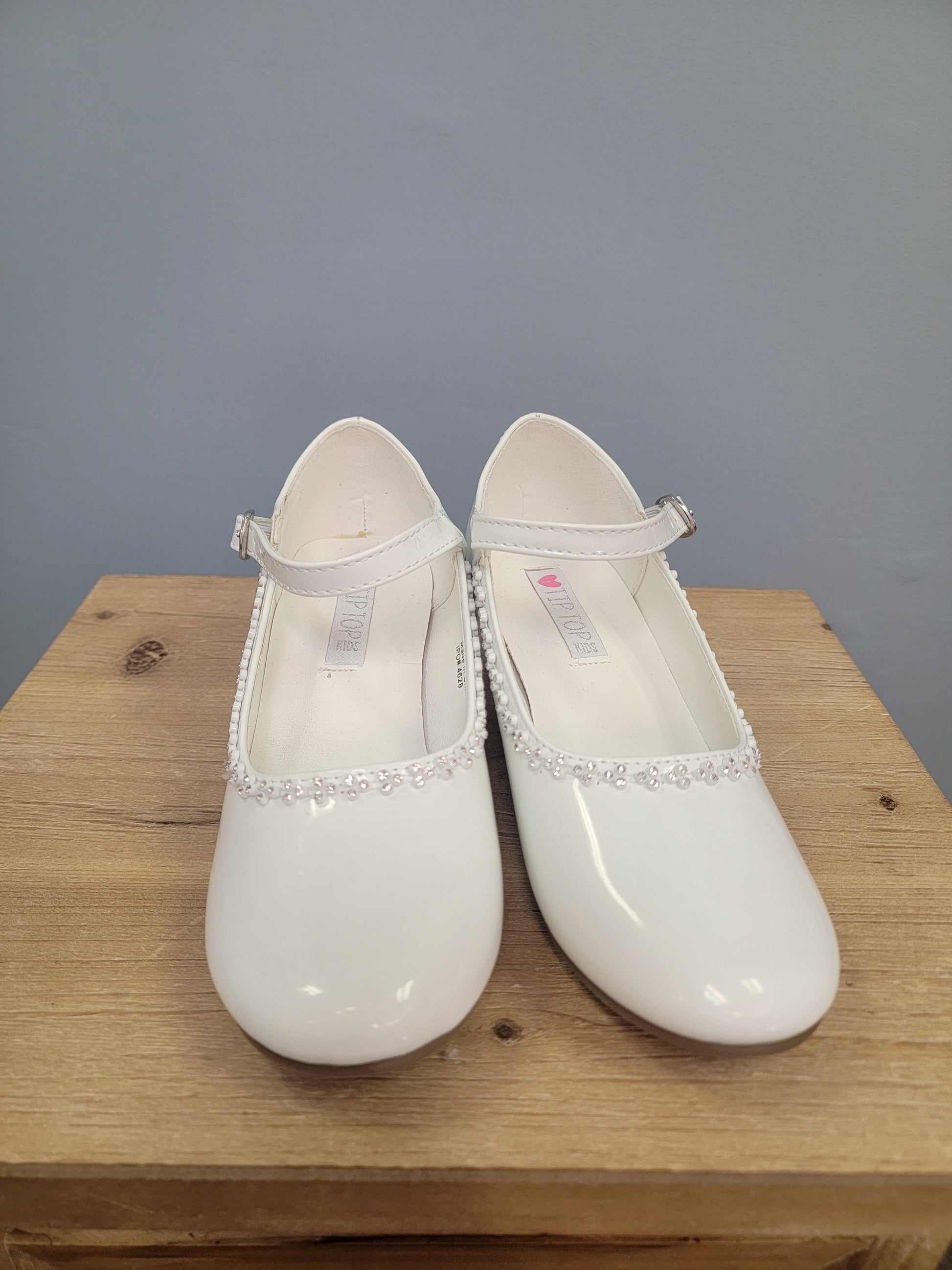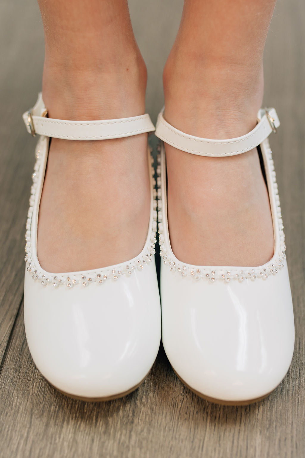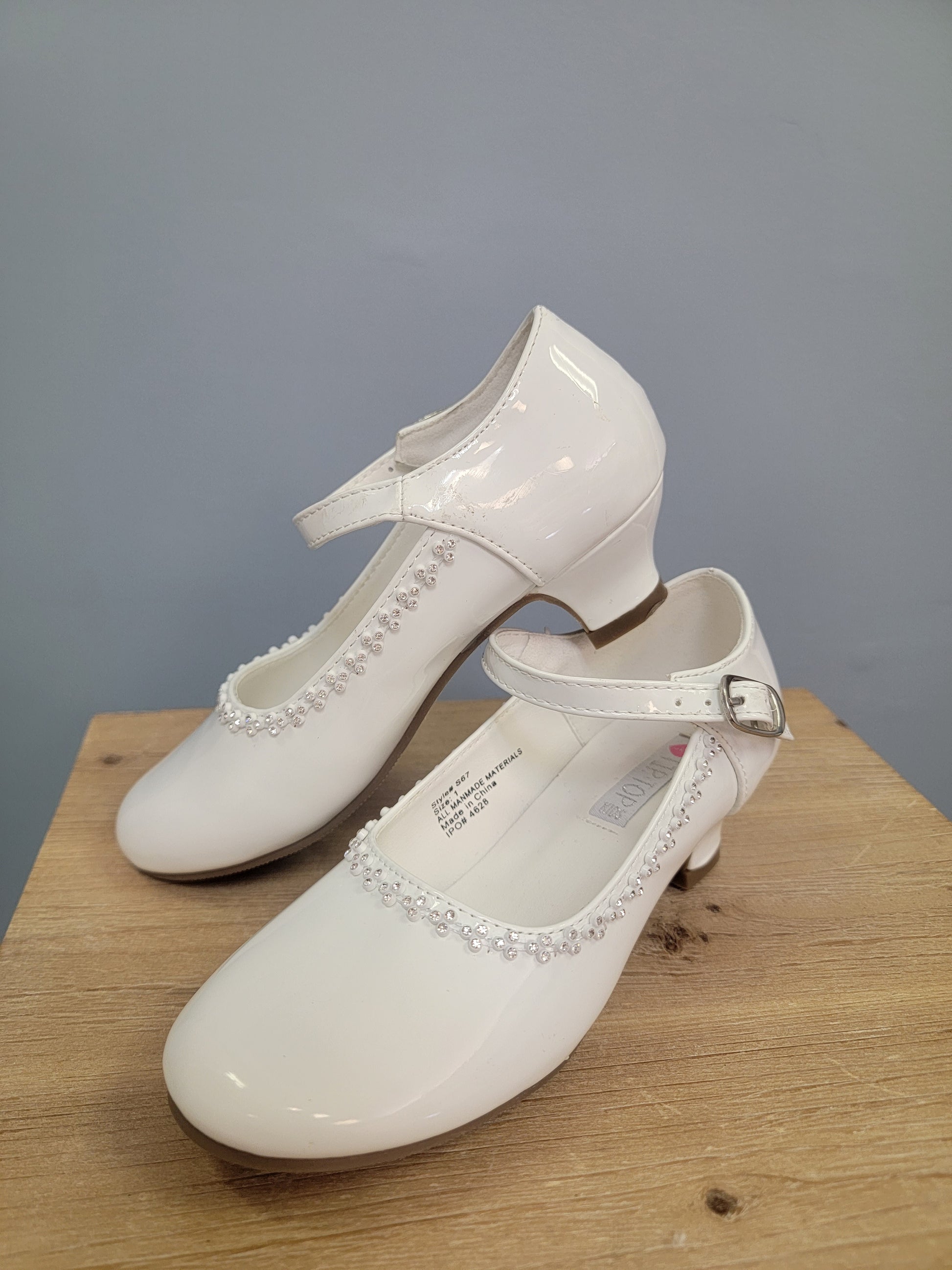 The Georgie shoe features a small 1 inch heel, sparkle detailing around the front, and an adjustable strap for a secure fit. These shoes are the ideal choice for any girl who wants a nice elegant look. Perfect for baptisms, communions, and special occasions.