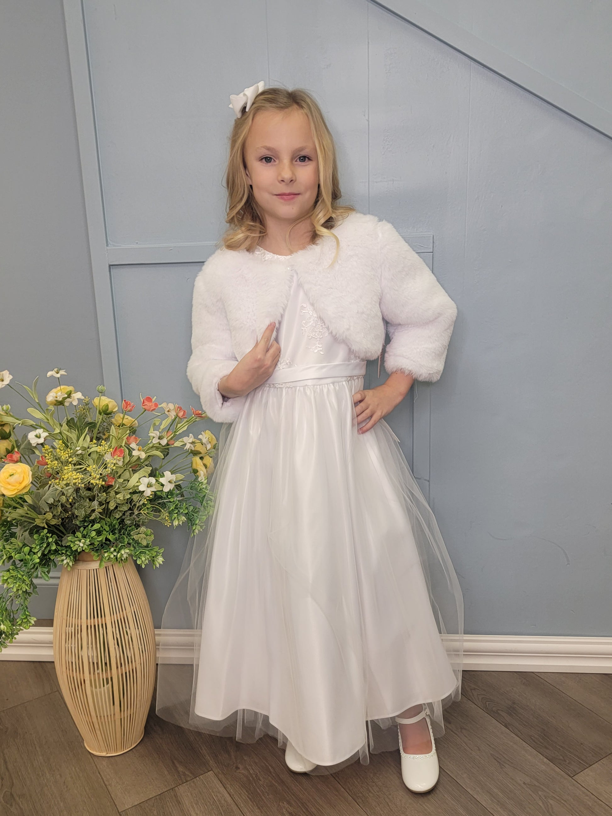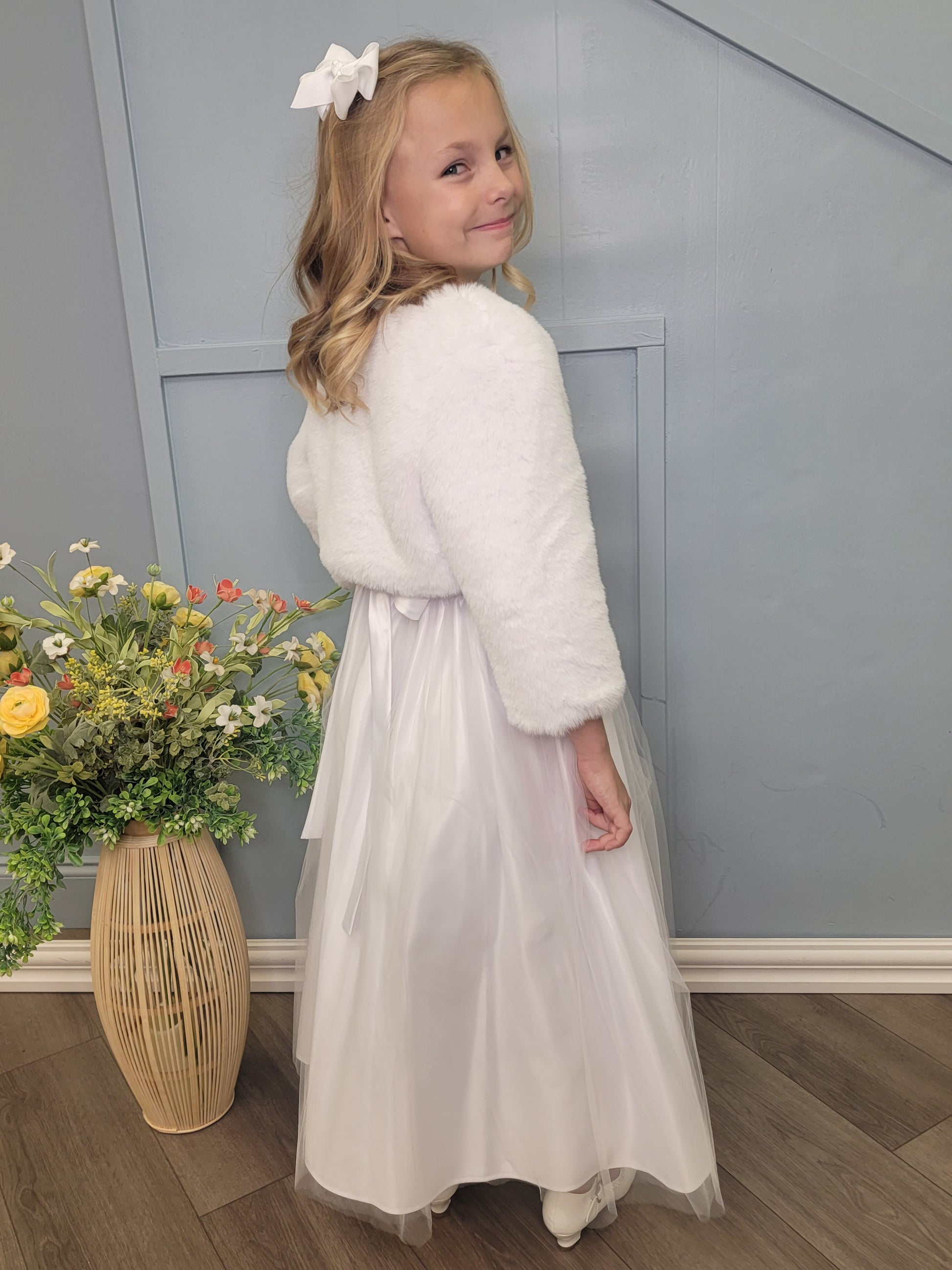 This soft faux fur jacket is the perfect addition to your special occasion wear. The ultra-plush fur is soft and luxurious. This coat and will make any little girl feel like royalty while keeping her warm. Perfect addition to any LDS Baptism or communion dress. Made in the USA.