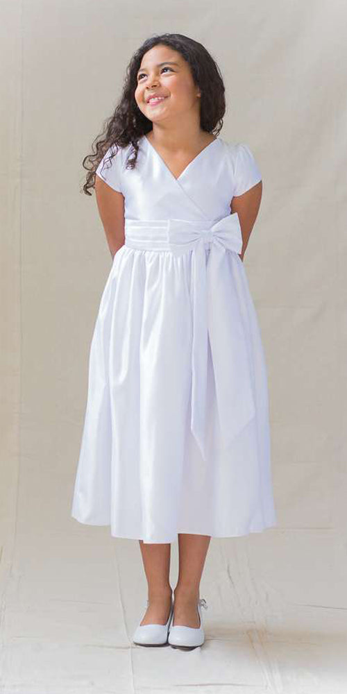 The Gretchen dress is simple but elegant. It is 100% Polyester fabric that is hand washable with a cross V neck bodice. This dress has a back sash and zipper. A beautiful option for your daughter's first communion, baptism, or flower girl occasion. Made in the USA.