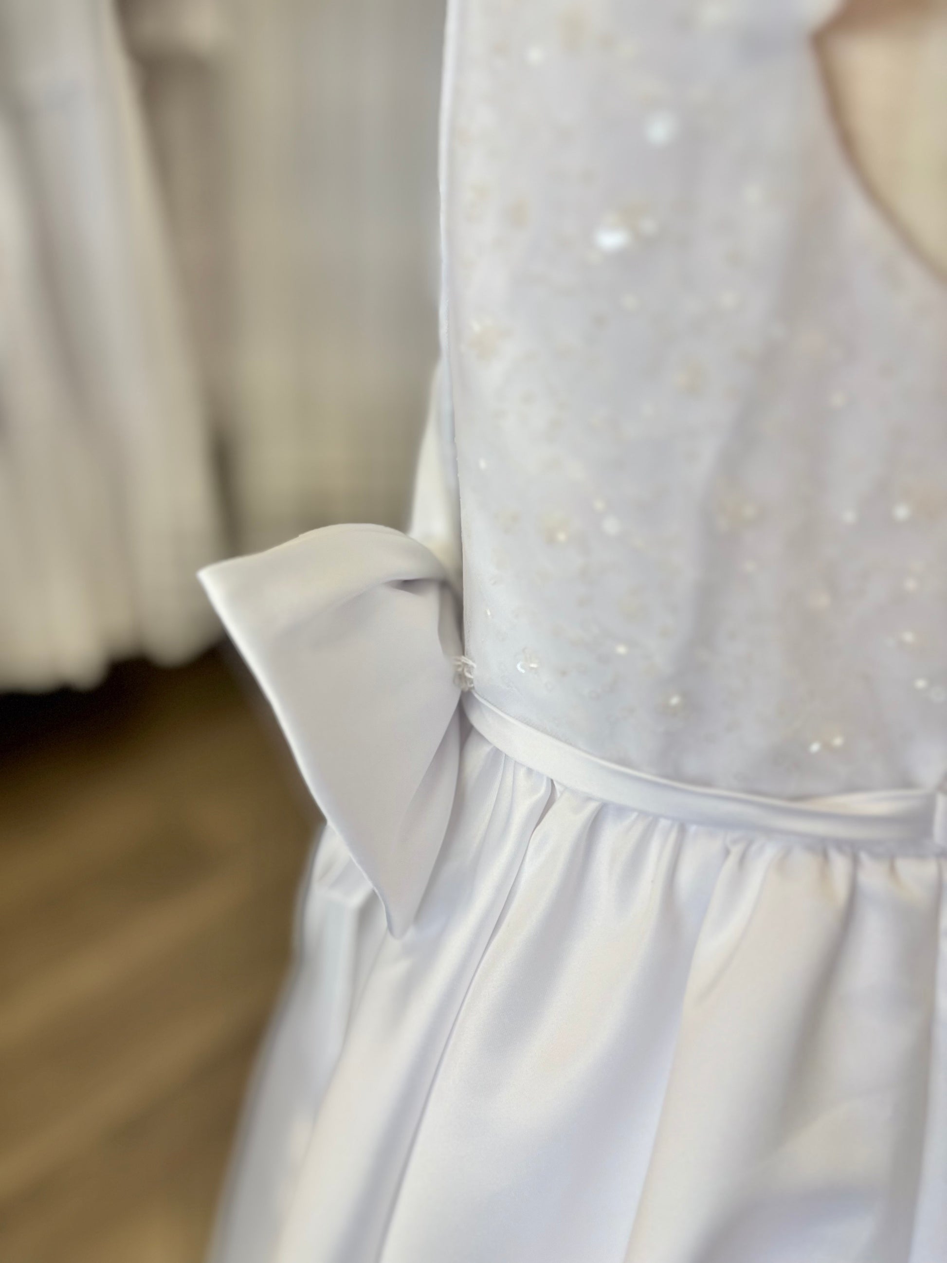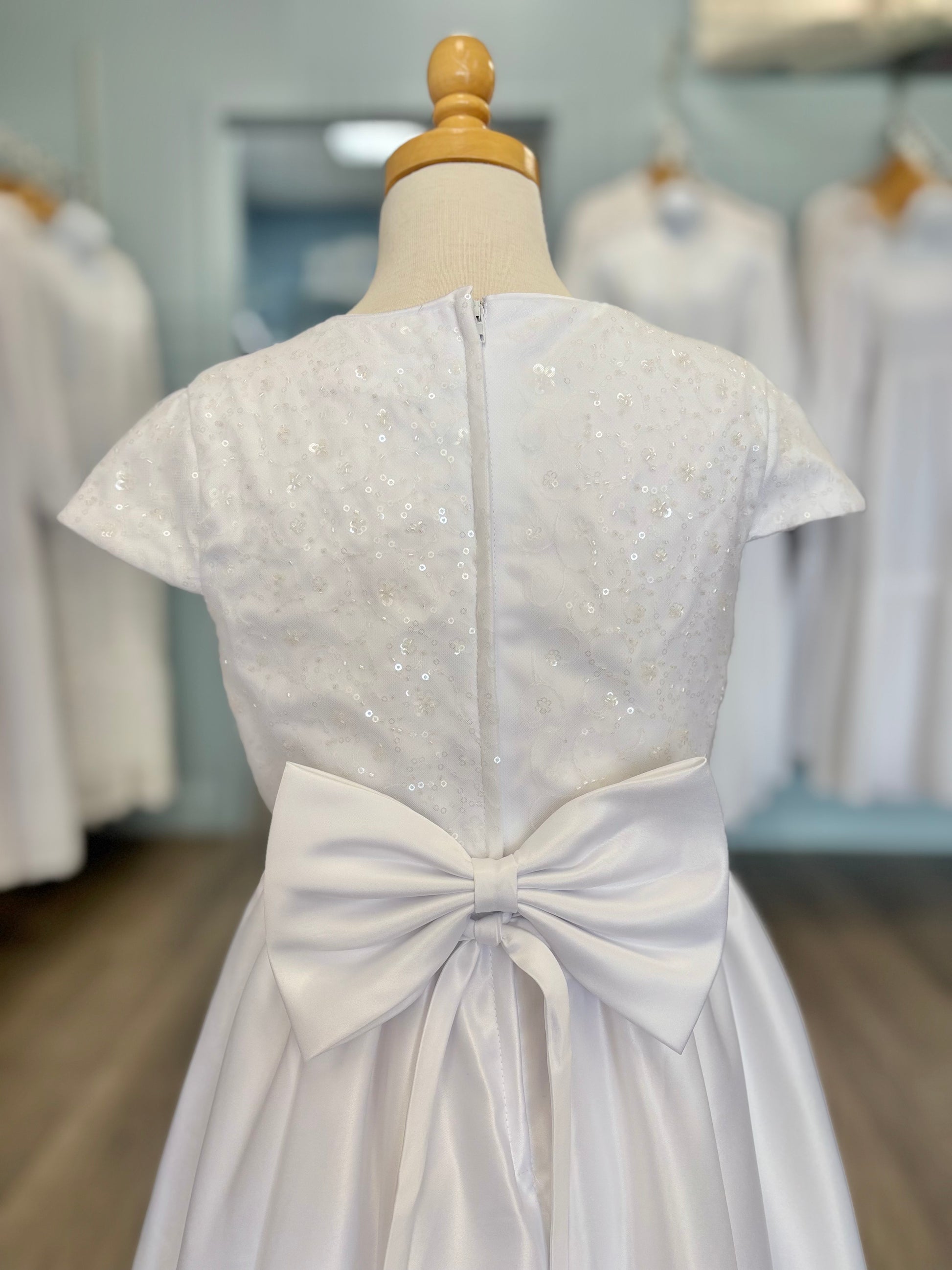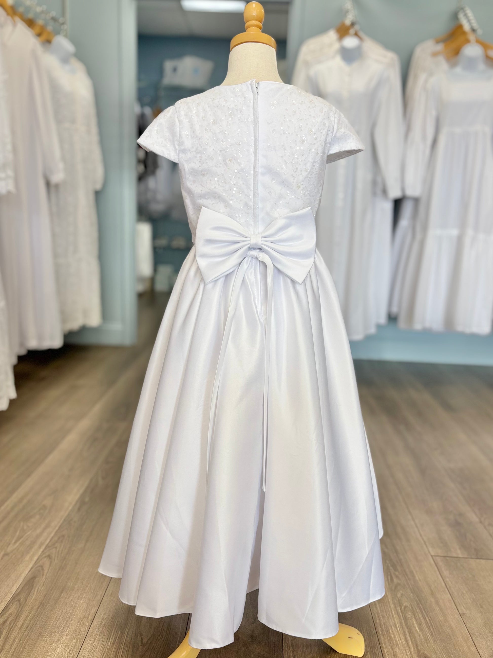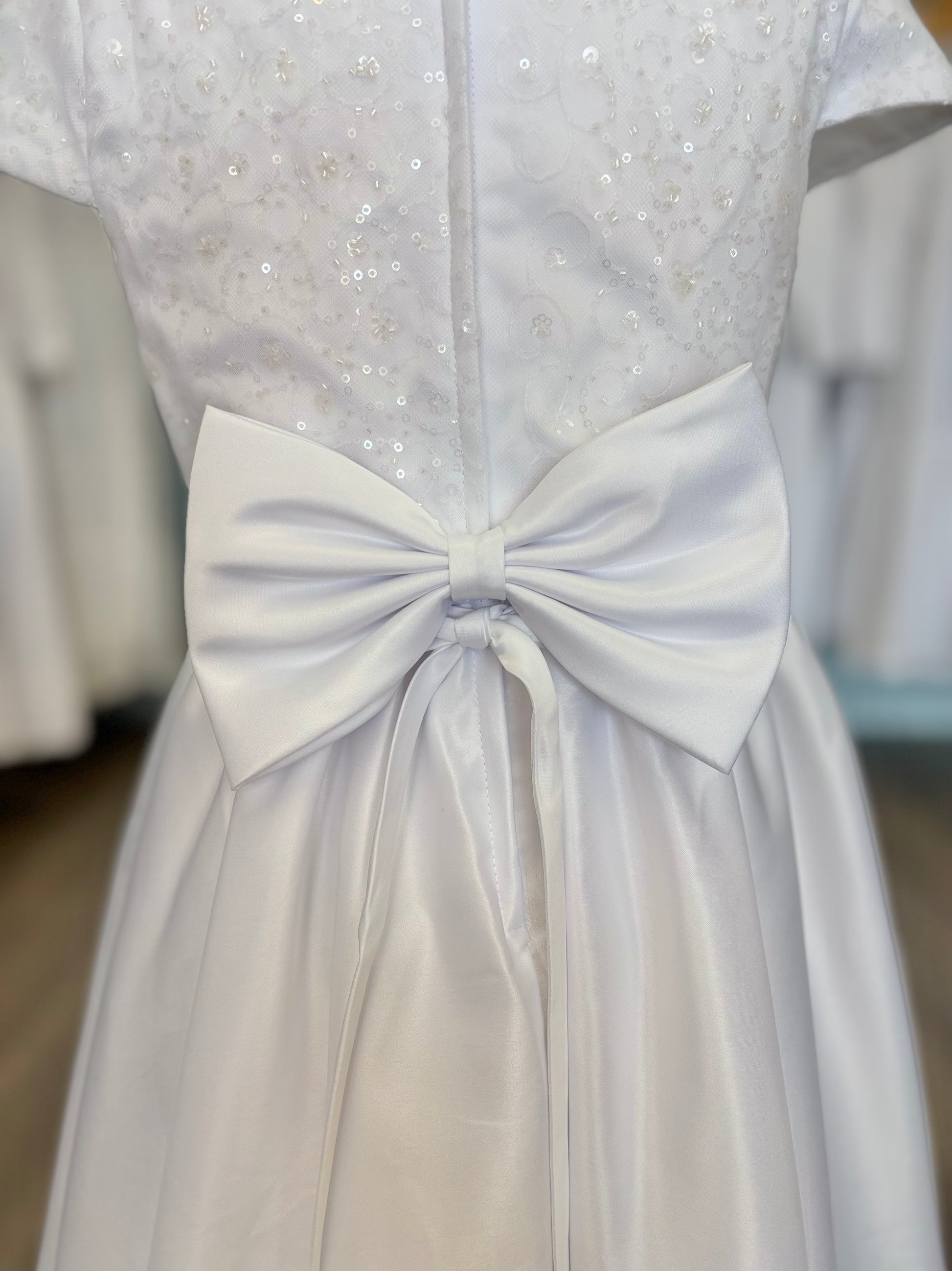 The Ivie dress is simple but beautiful. With a satin line skirt, sequin bodice, and decorative bow at the waist, this dress is perfect for a baptism, communion, or special event. This dress zips up the back, has a tie waist, and has a big decorative bow attached at the back!