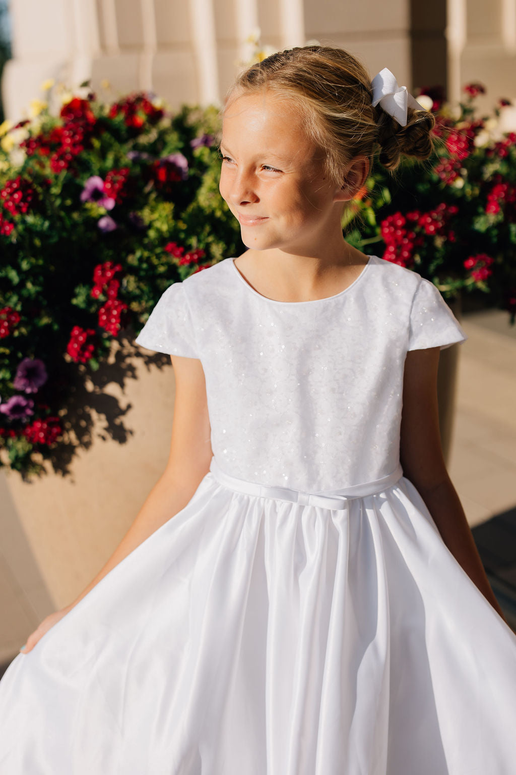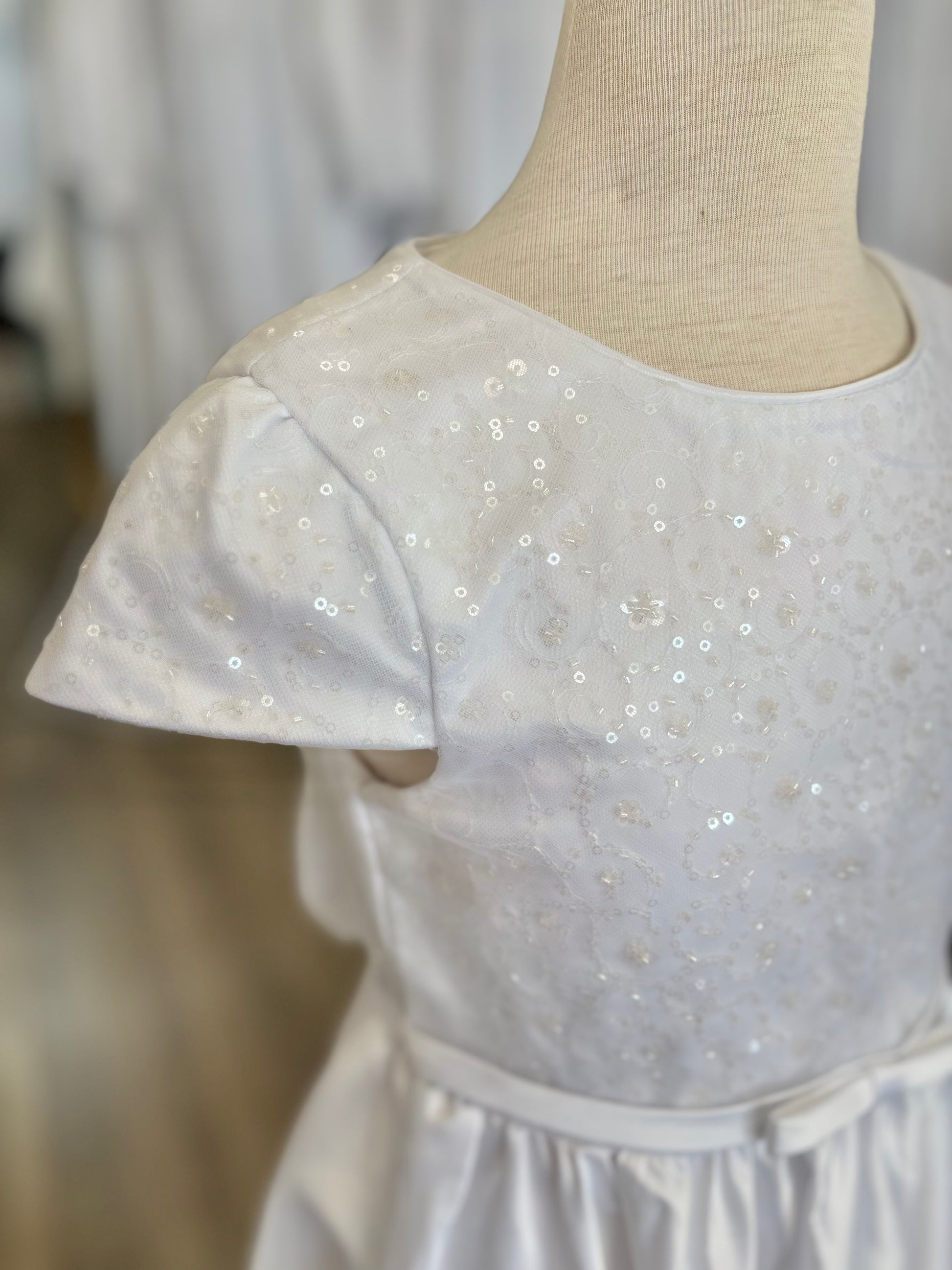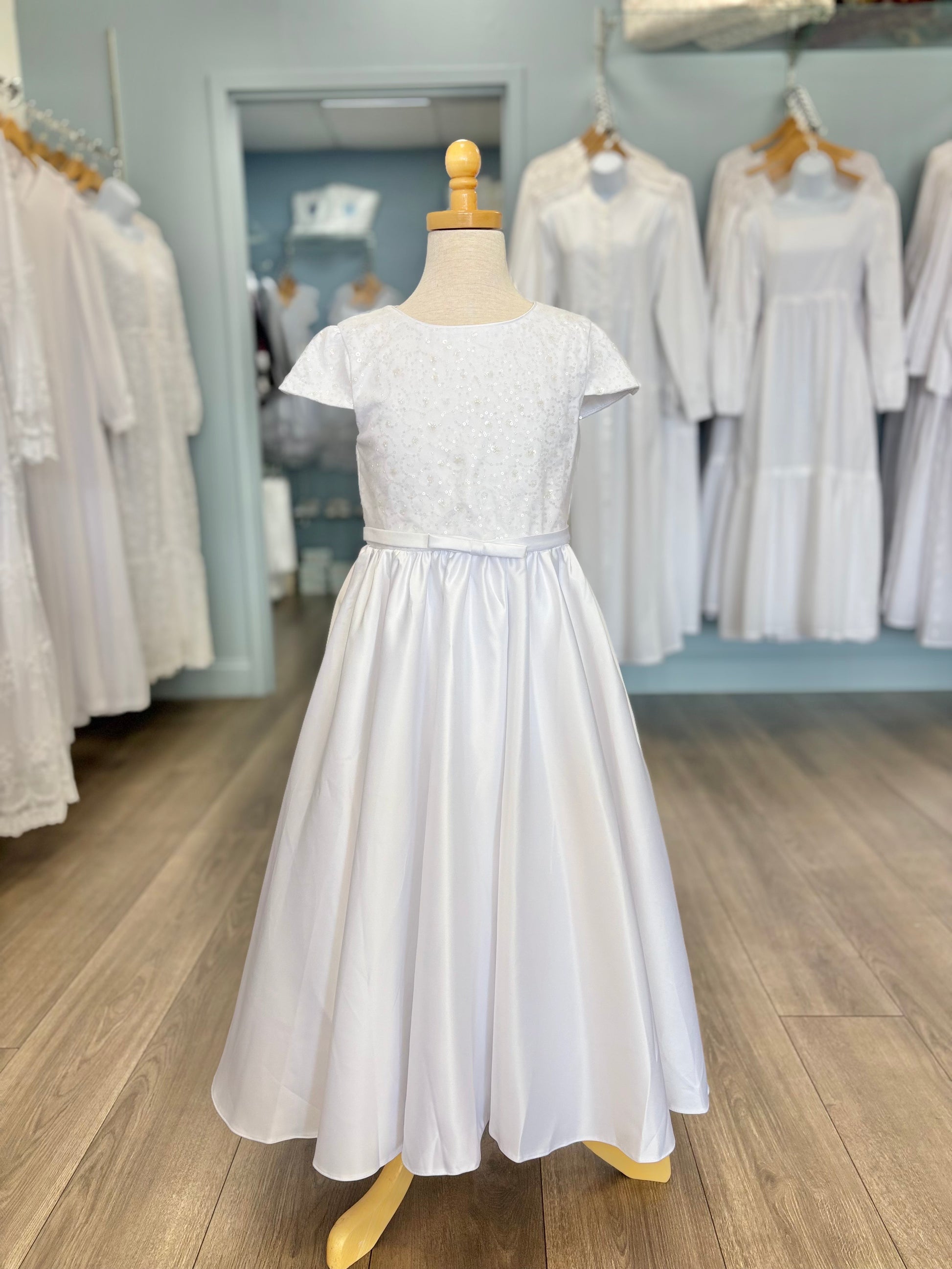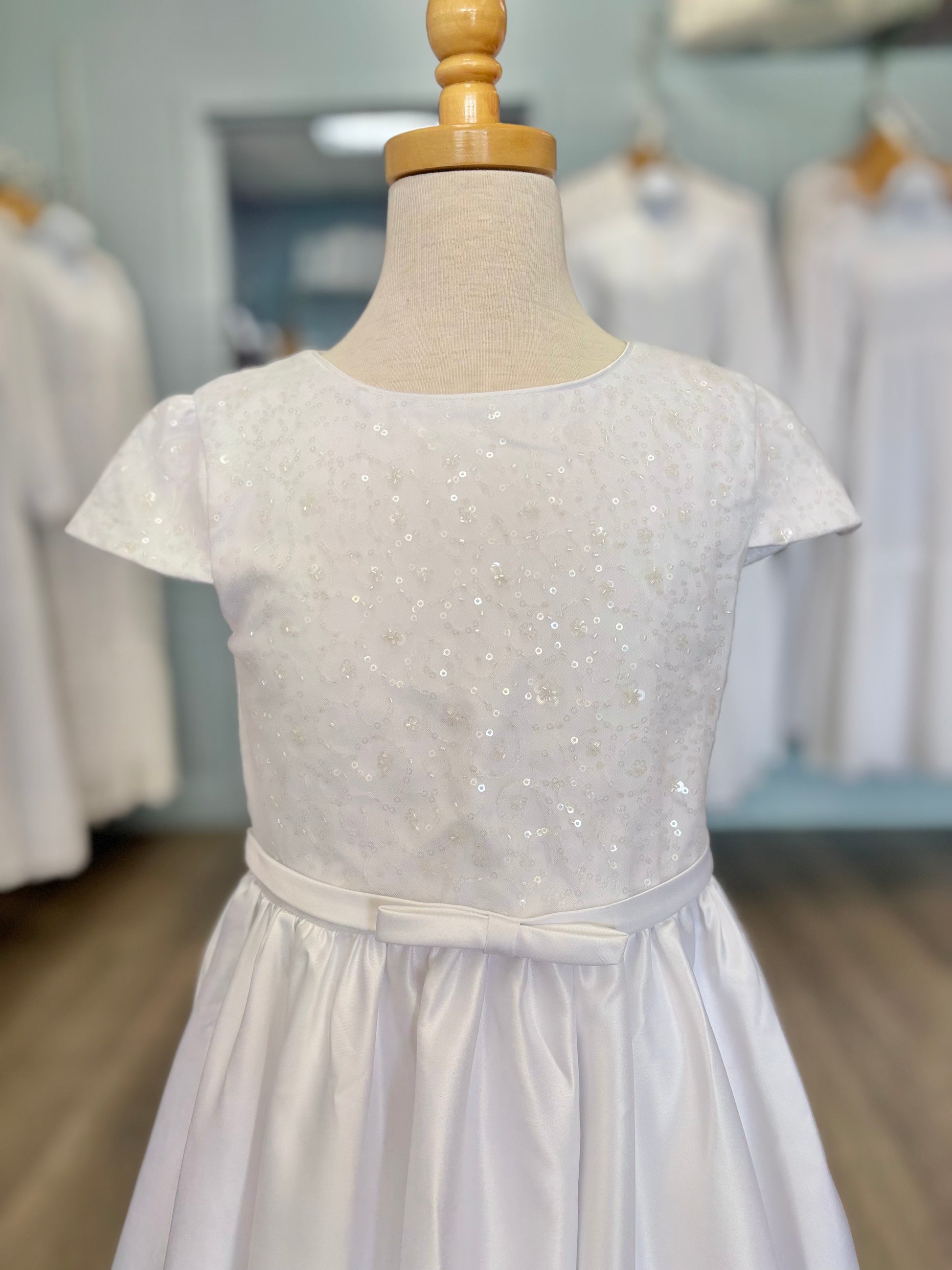 The Ivie dress is simple but beautiful. With a satin line skirt, sequin bodice, and decorative bow at the waist, this dress is perfect for a baptism, communion, or special event. This dress zips up the back, has a tie waist, and has a big decorative bow attached at the back!