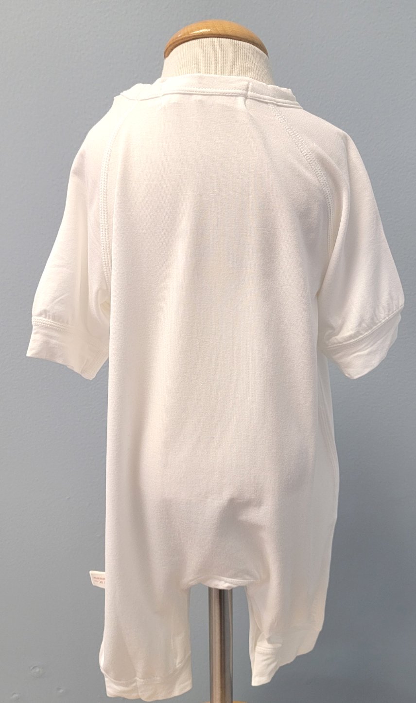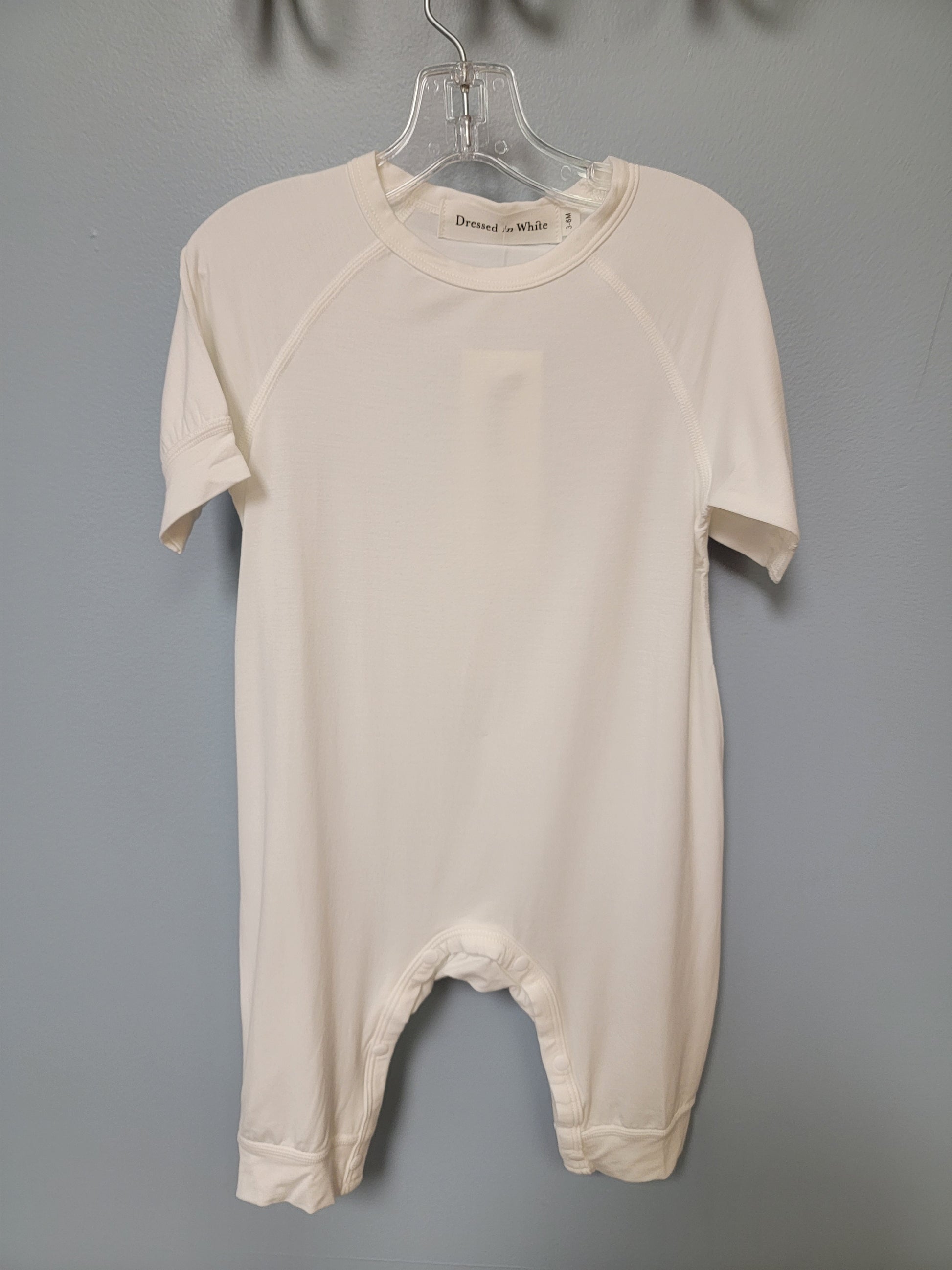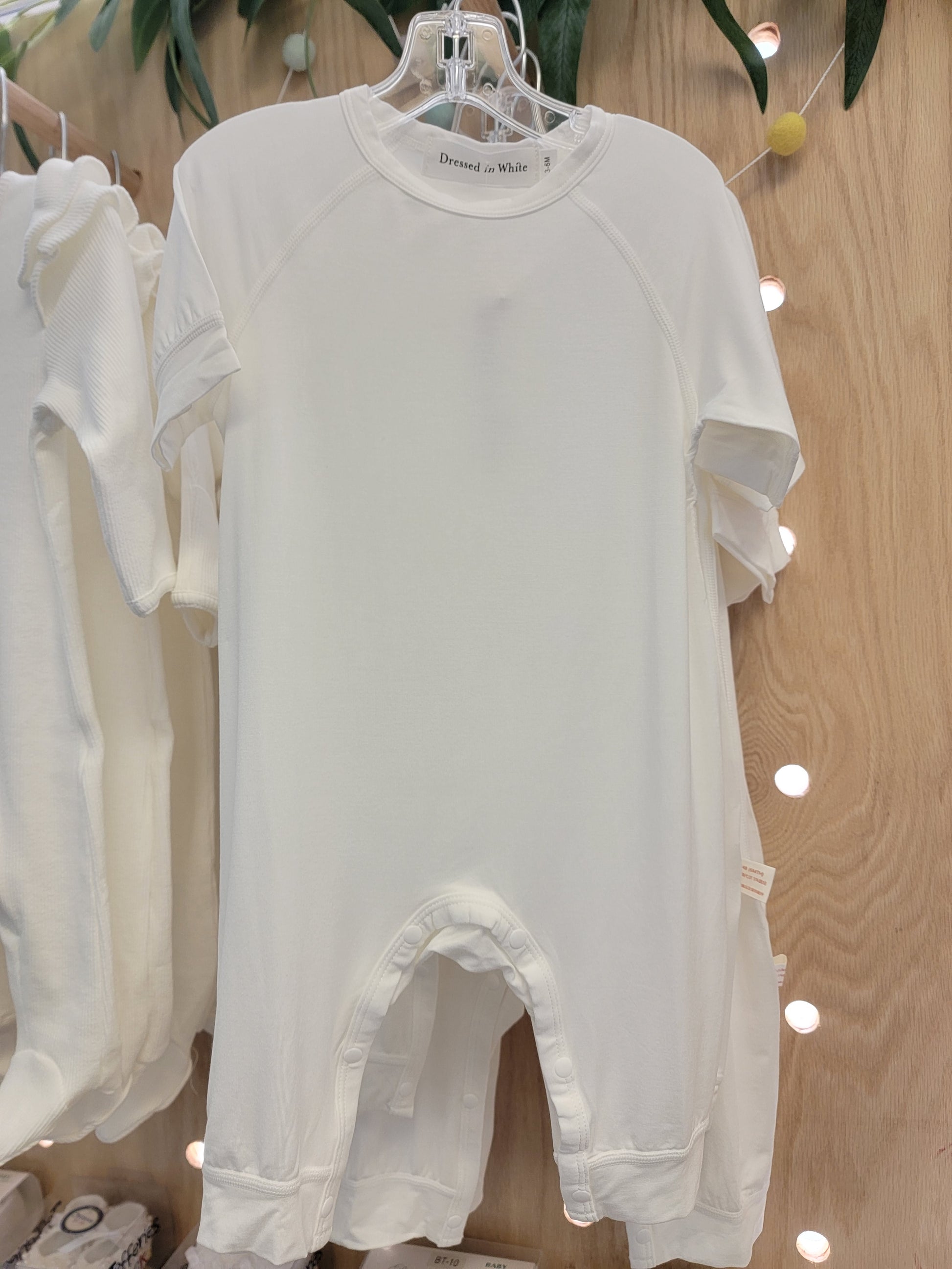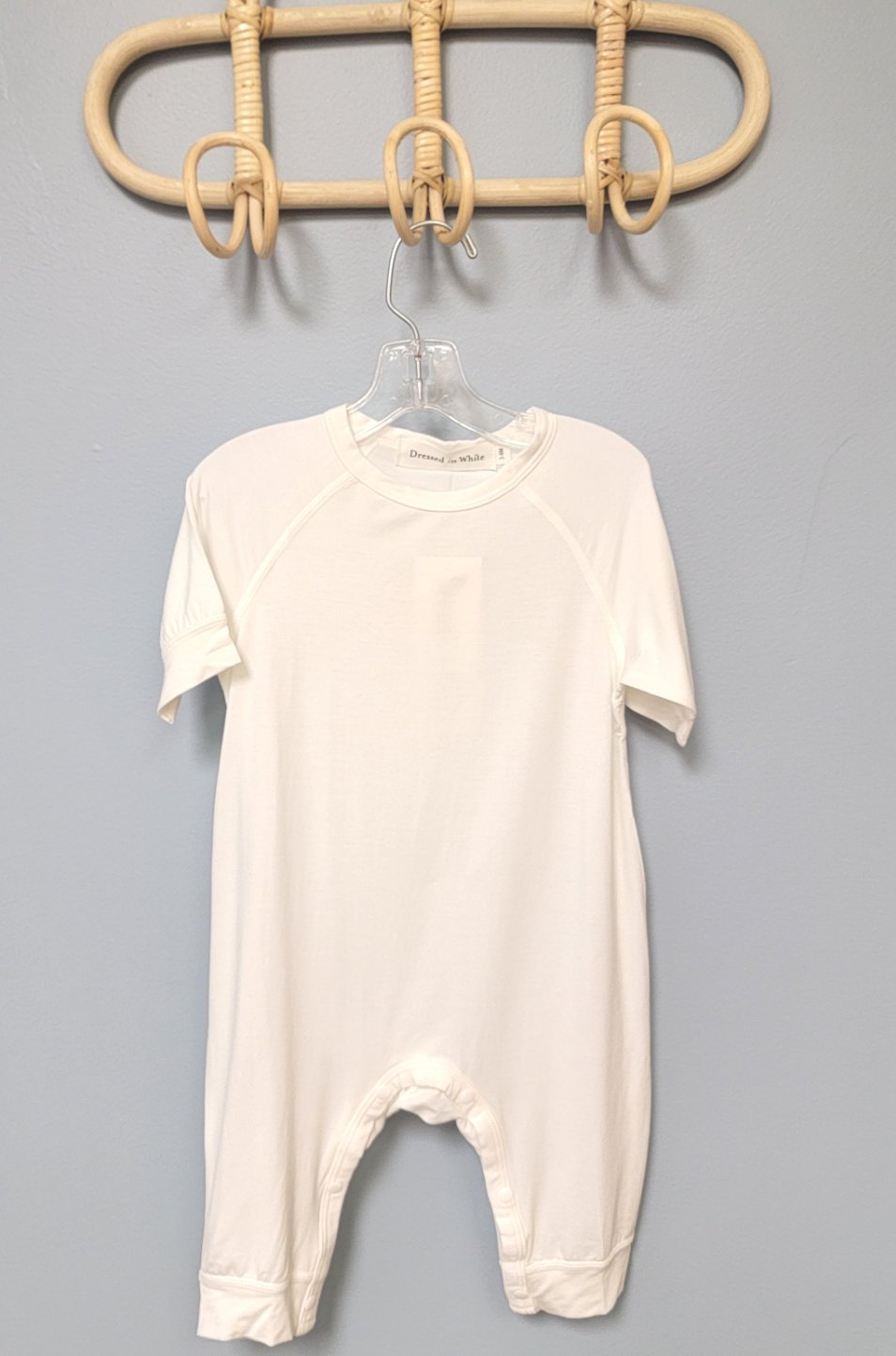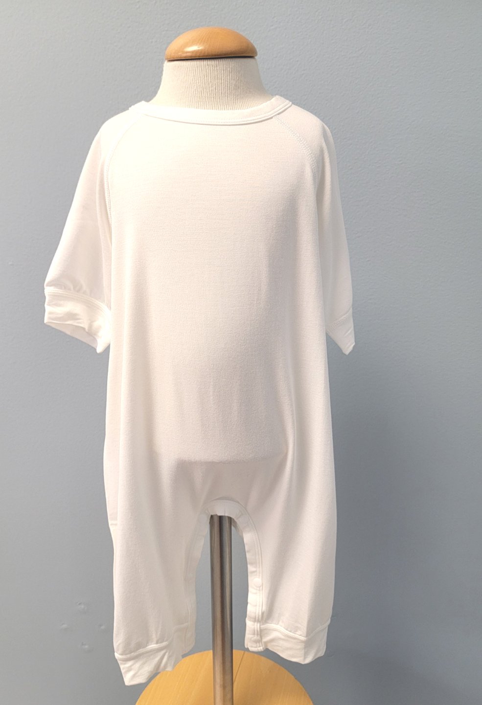 The Johnny Romper has a solid white stretchy design over the entire surface. It has 6 buttons that open in the inner legs, soft short sleeves, and open foot holes. This cute white Romper is perfect to be worn for a special occasion or for everyday wear.