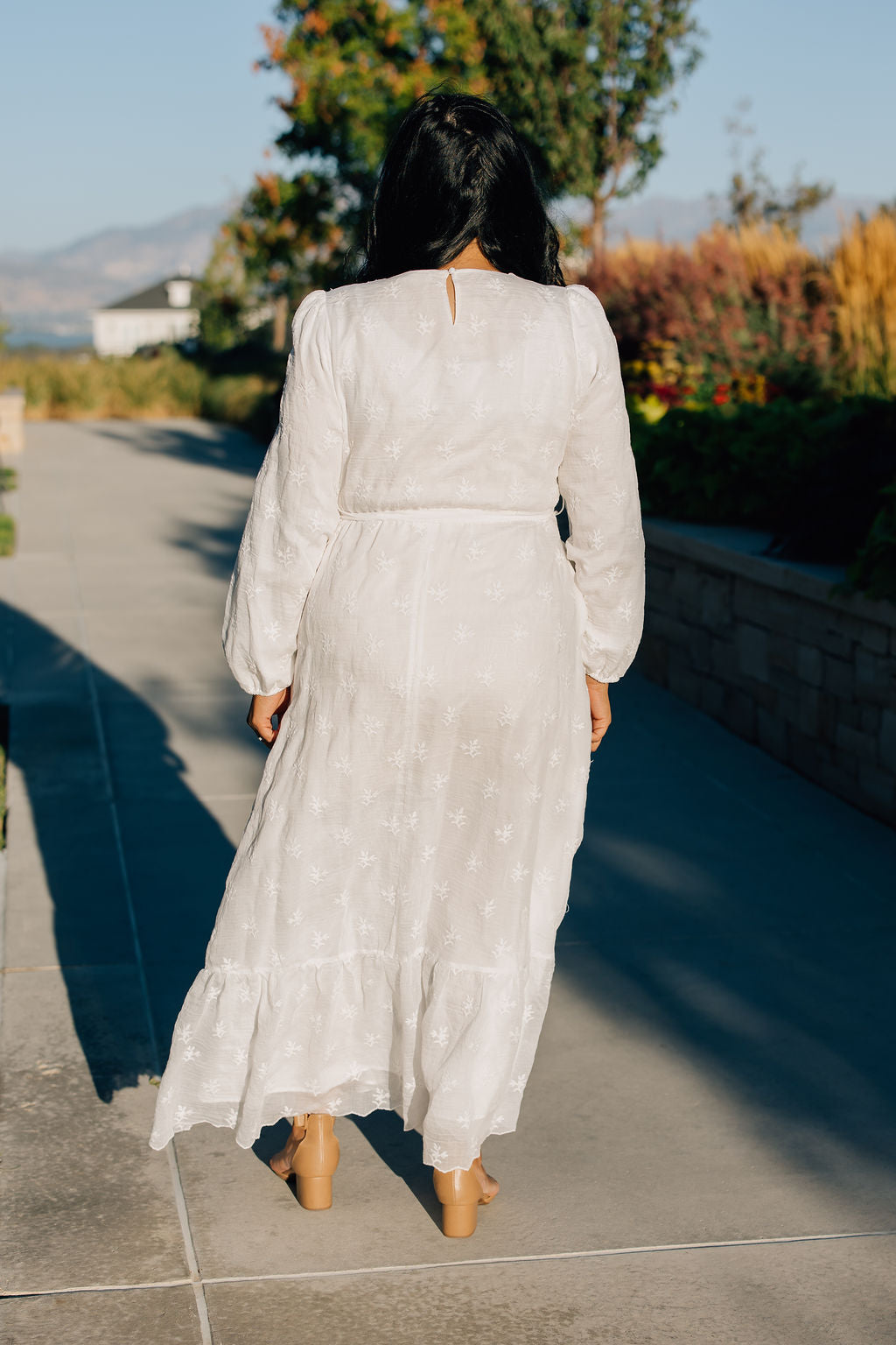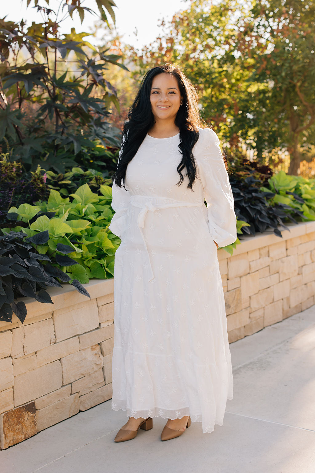 The Kara Dress combines lightweight cotton and Tencel for breathable comfort and a soft feel. Featuring delicate embroidered details and an elastic waist with detachable tie belt, it offers a flattering fit with ease. The keyhole back neckline makes it easy to wear, while the long sleeves and convenient pockets enhance practicality. Designed with modesty and style in mind, this dress is an ideal choice for LDS temple wear.