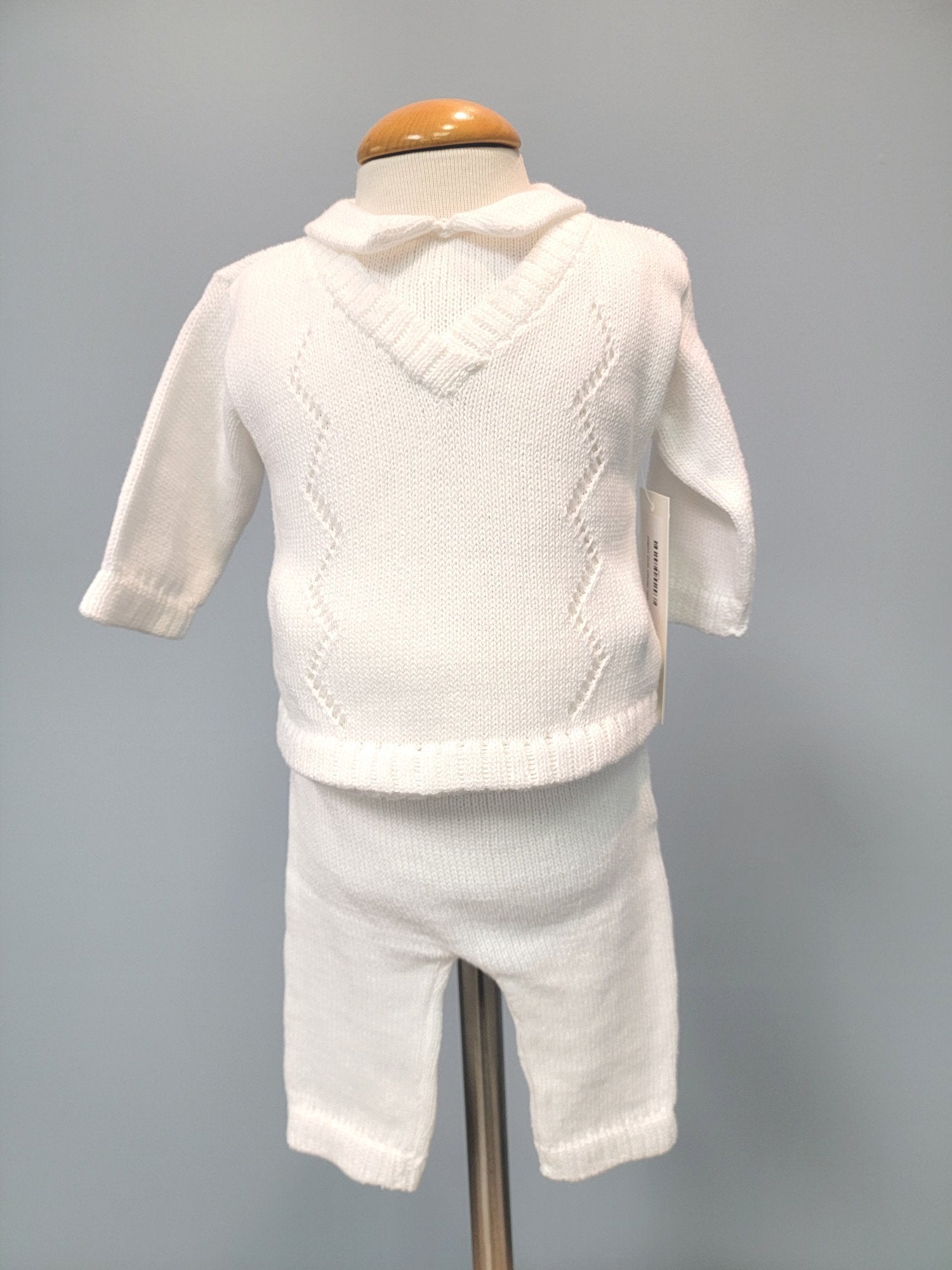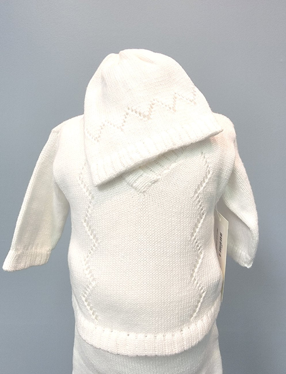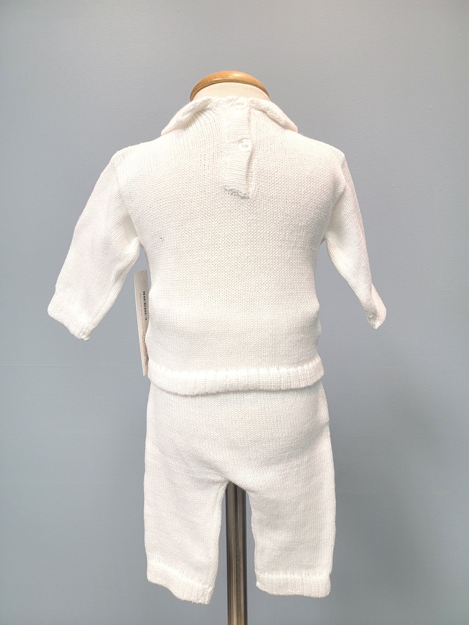 This baby boy outfit includes 3 pieces: a pullover long sleeve top with two buttons at the back, long pants with an elastic waist, and a beanie cap. The vest front is sewn into the shirt for ease. The vest and beanie feature a simple zigzag design. Perfect for a baby blessing or christening.
