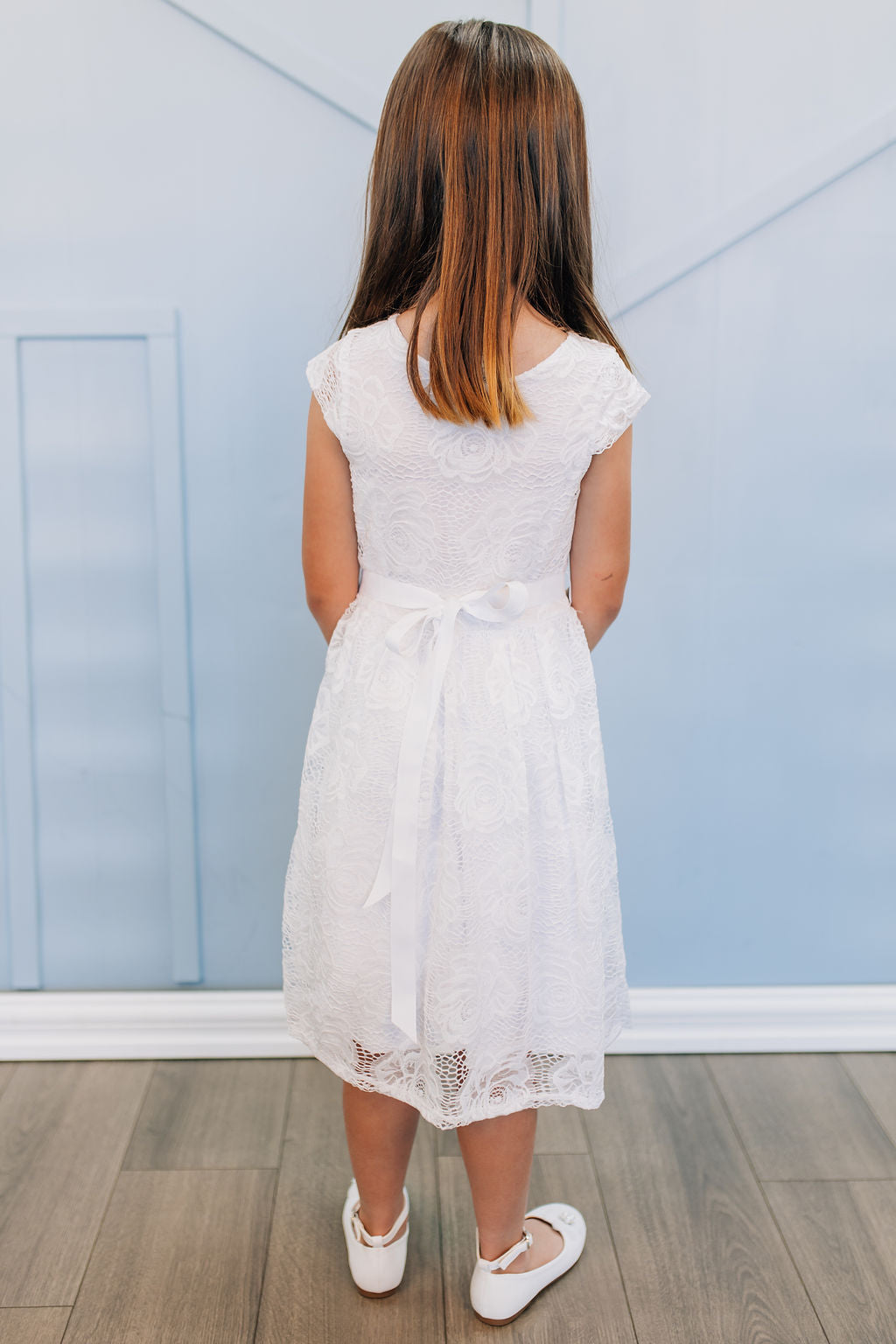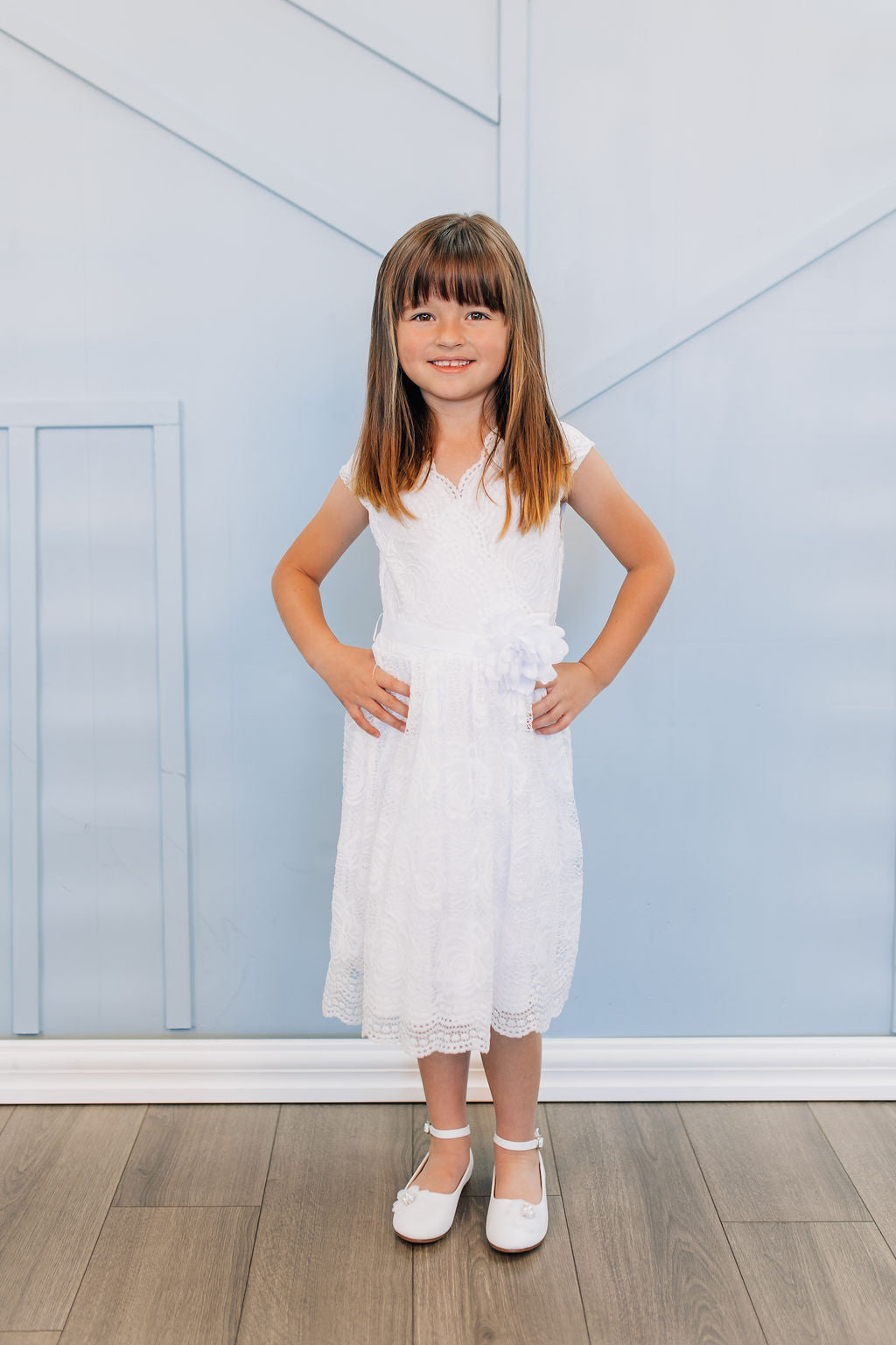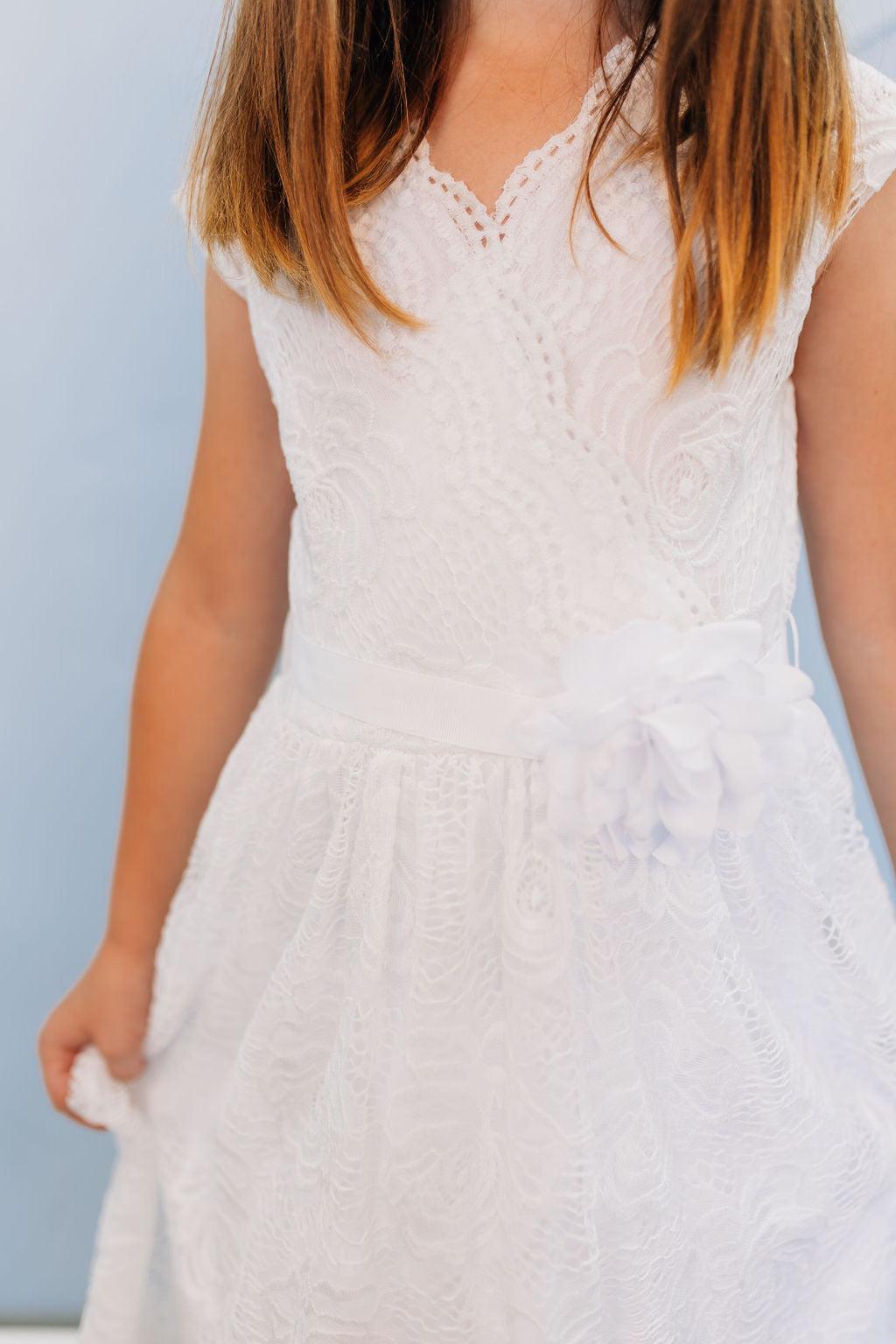 The Malia dress is made from a soft lace with an elegant sheen to it. It features a v-neckline with scallop trim, a wrap style bodice, cap sleeves and a ribbon bow at the waist with a removable flower pin. This dress is a wonderful choice for an LDS Baptism Dress, communion or flower girl. Made in the USA.
