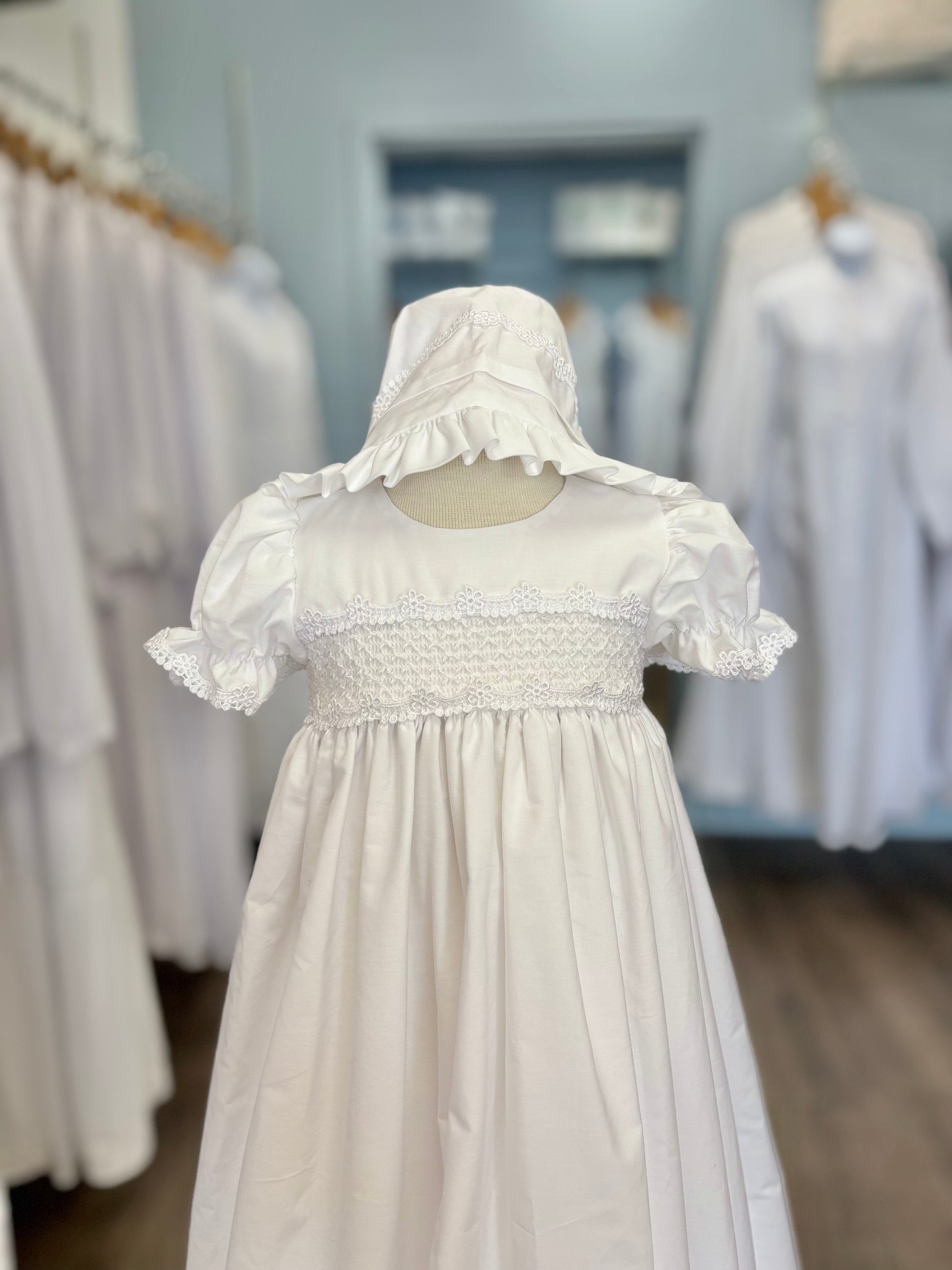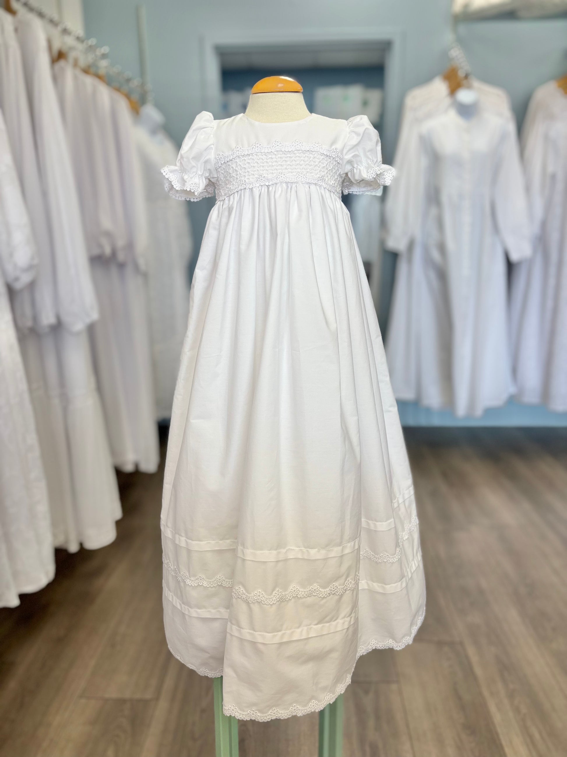 This baby dress is made of soft, comfortable cotton, and is a great option for summer. It has a simple, but elegant design. With a long skirt, cinched in puffed sleeves, and details at the waist and hem of the dress. This dress is fully lined and has buttons at the back and a tie waist. Comes with a matching bonnet. It is the perfect choice for baby blessings and christenings. Made in the USA.