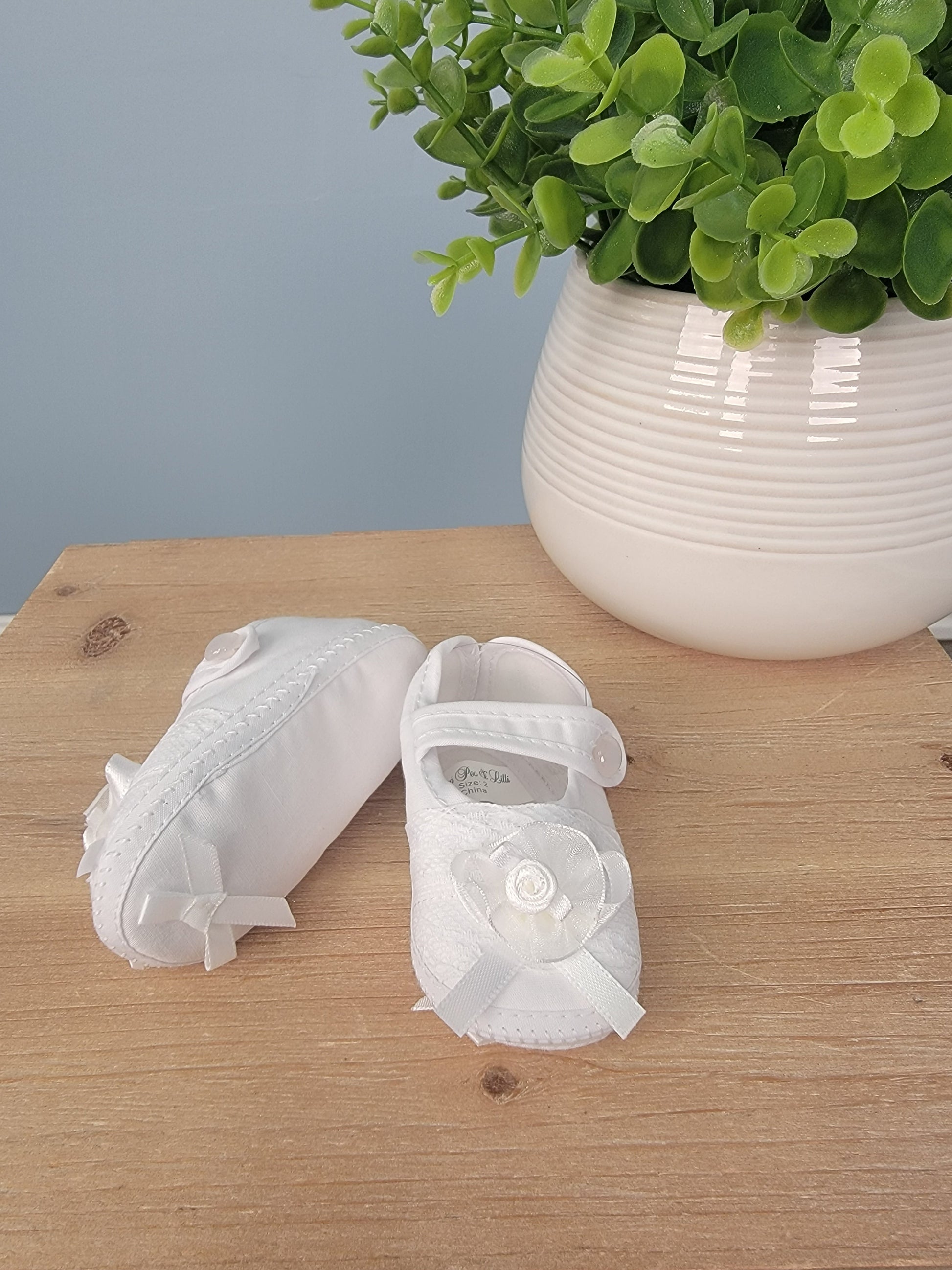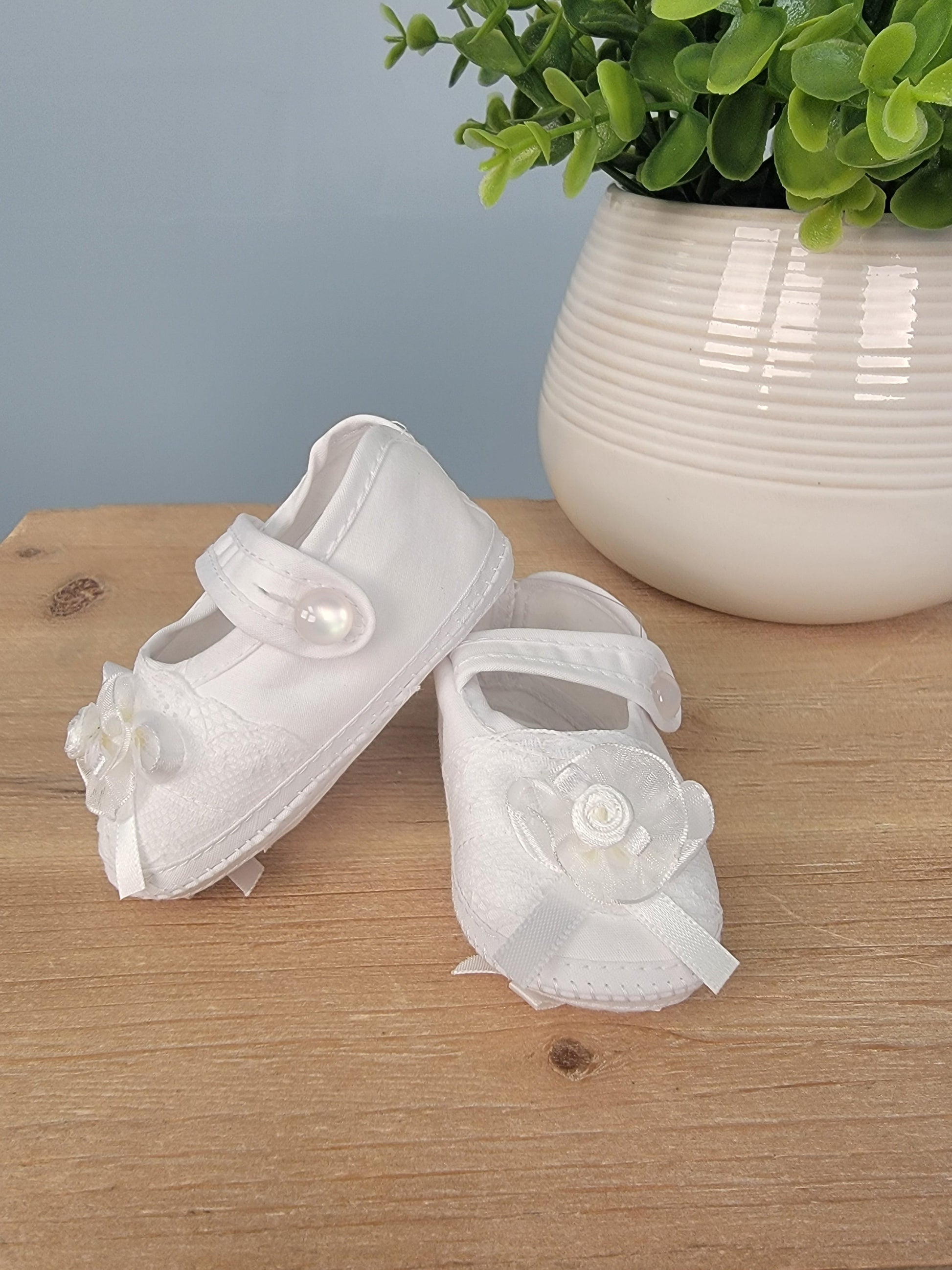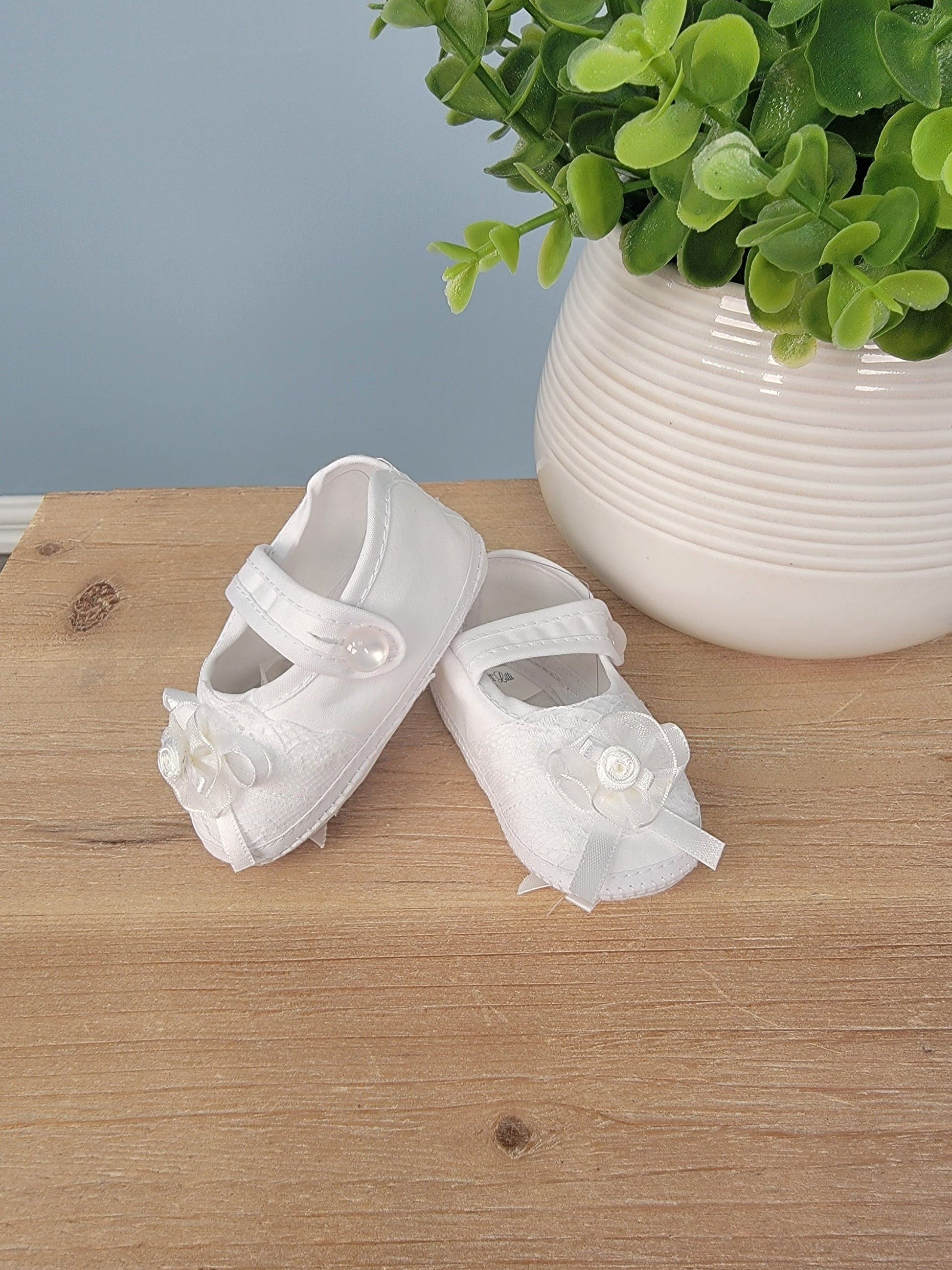 These Mary Jane style booties are made from comfortable cotton. They feature a button secured strap across the top, lace along the front of the shoe, with a small ribbon on the bottom of the shoes, along with one on the top with a rosette detail. These baby girls shoes are elegant and will go with any blessing or christening dress. Imported.