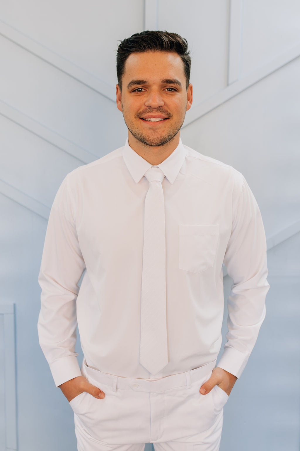 This 4-way stretch shirt is wrinkle free, breathable and lightweight, moisture wicking and has a collar shield to prevent yellowing. The fabric is made from recycled material and is liquid and stain repellent and machine washable. This shirt has been tested in our suit and tuxedo store and has been getting a lot of praise. As added features, this shirt has button holes for cufflinks and a left chest pocket.