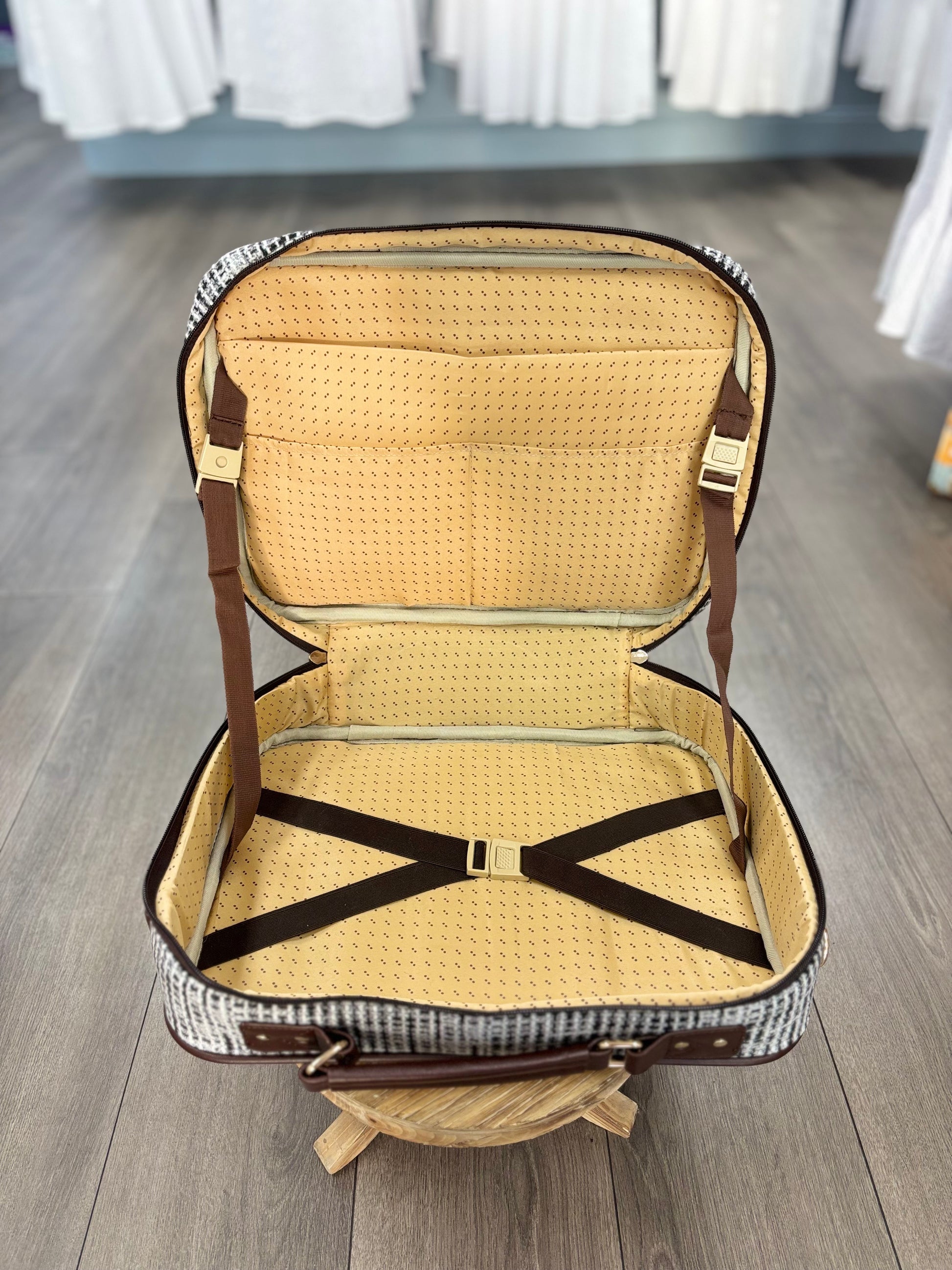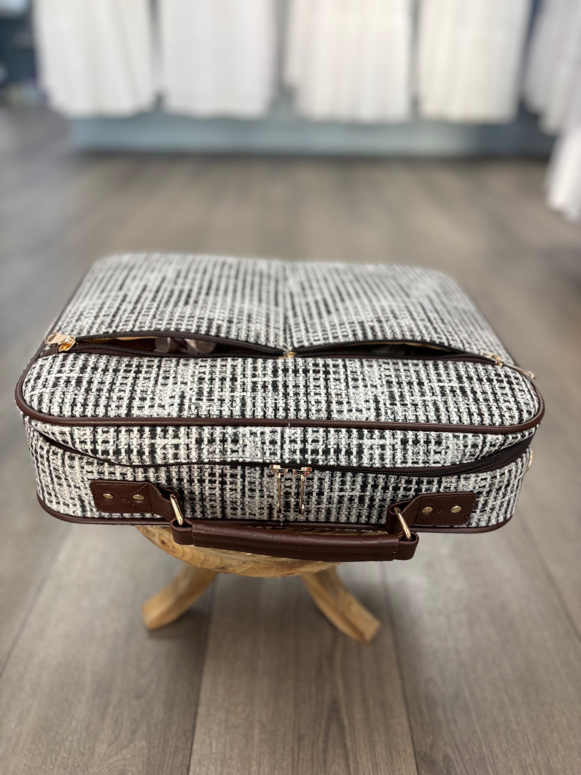 This suitcase style bag is the perfect option for Temple trips. This bag zips closed and has adjustable straps on the inside to control how much the bag opens up. It has two outer zipper pockets, three inside pockets, and elastic straps with a buckle to keep everything in place during travel. A classic houndstooth pattern covers the outside, and is complete with brown leather and gold accents. Big enough to fit shoes or slippers, a dress or pants and a shirt, an envelope, hankie, fan, and any other necessities you need, this bag is ideal for anyone!