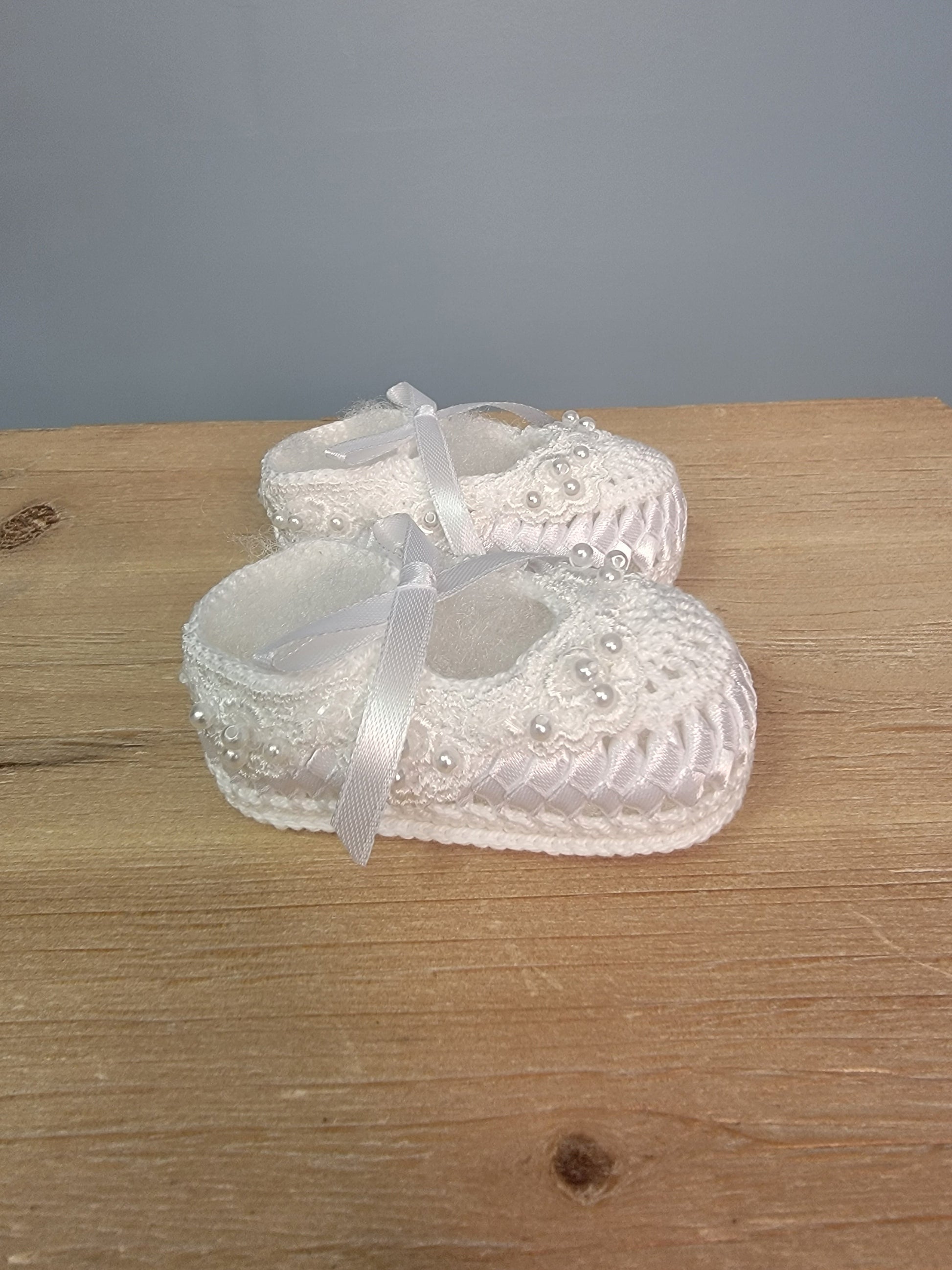 These baby girl shoes are crocheted from cotton yarn and satin ribbon. They feature intricate details such as small pearls and sequins, and a ribbon tie on the tops of the shoes to secure these on your baby's feet. Ideal for christenings and baby blessings, or perfect for a baby gift.