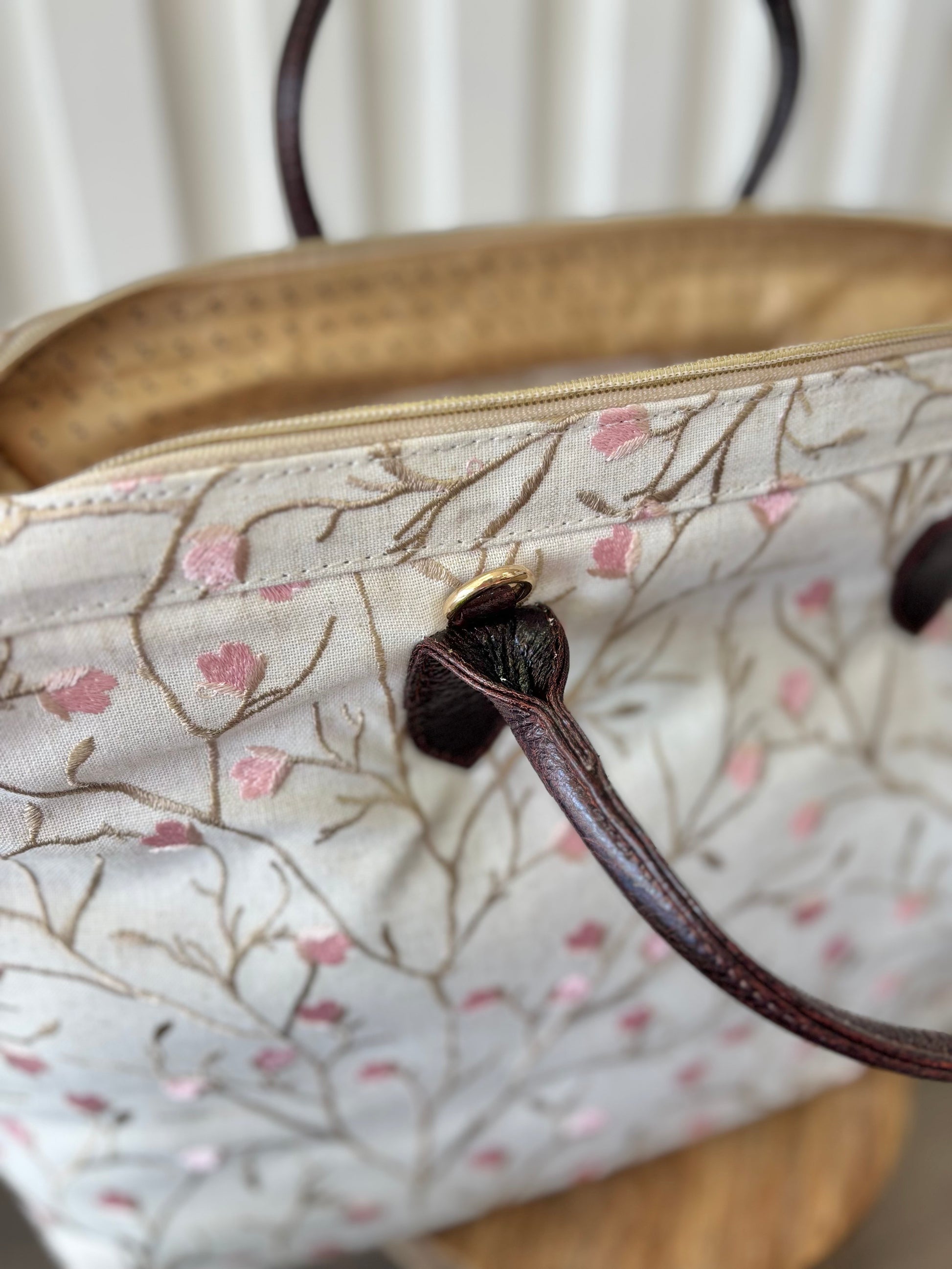 This bag is beautifully made with embroidered flower blossom fabric. The leather handles are attached to a sturdy top frame that will keep the bag open for easy access, or keep it closed with the double directional zipper. This bag has two inside zipper pockets and an inside pouch to keep everything organized.