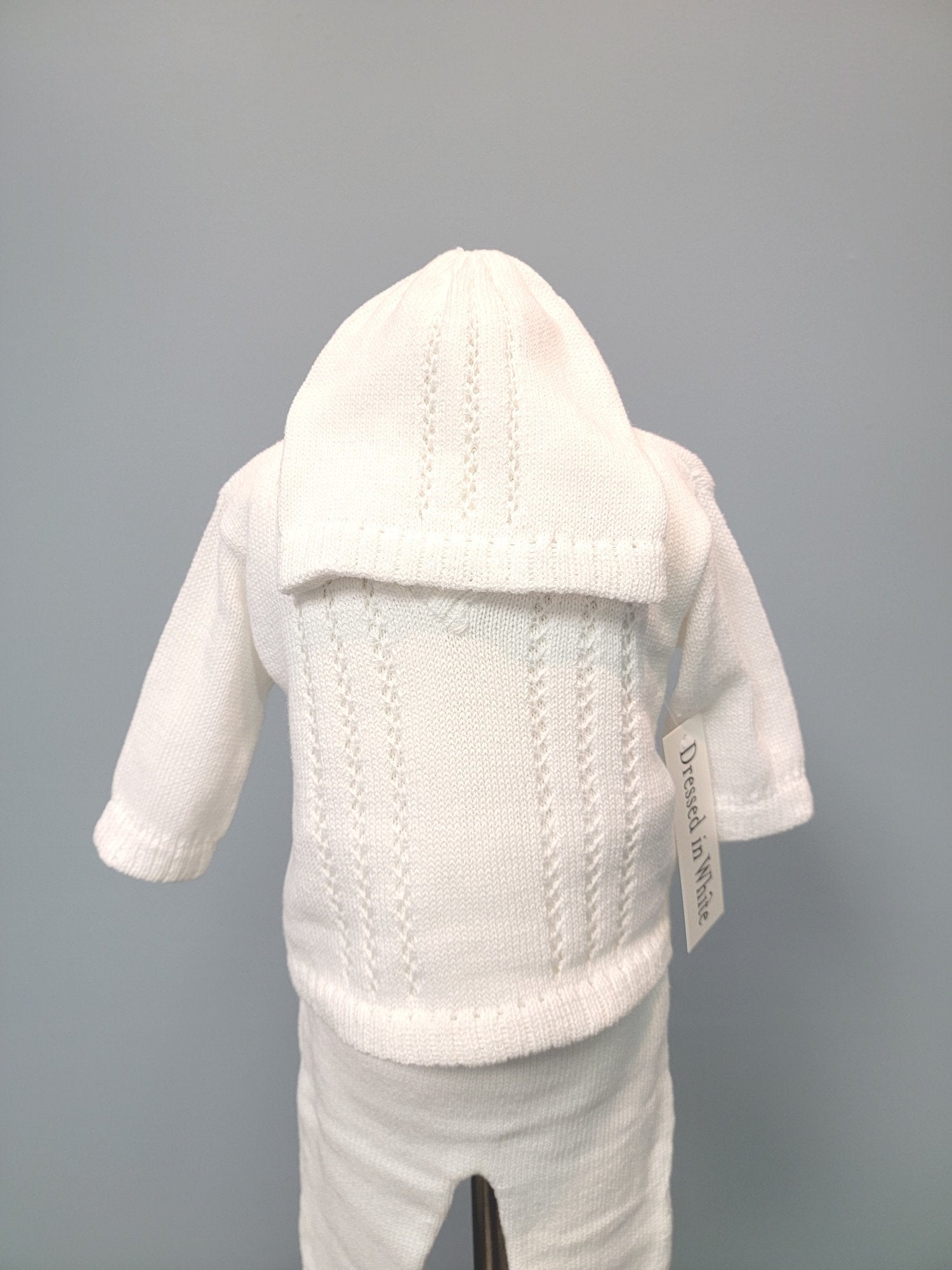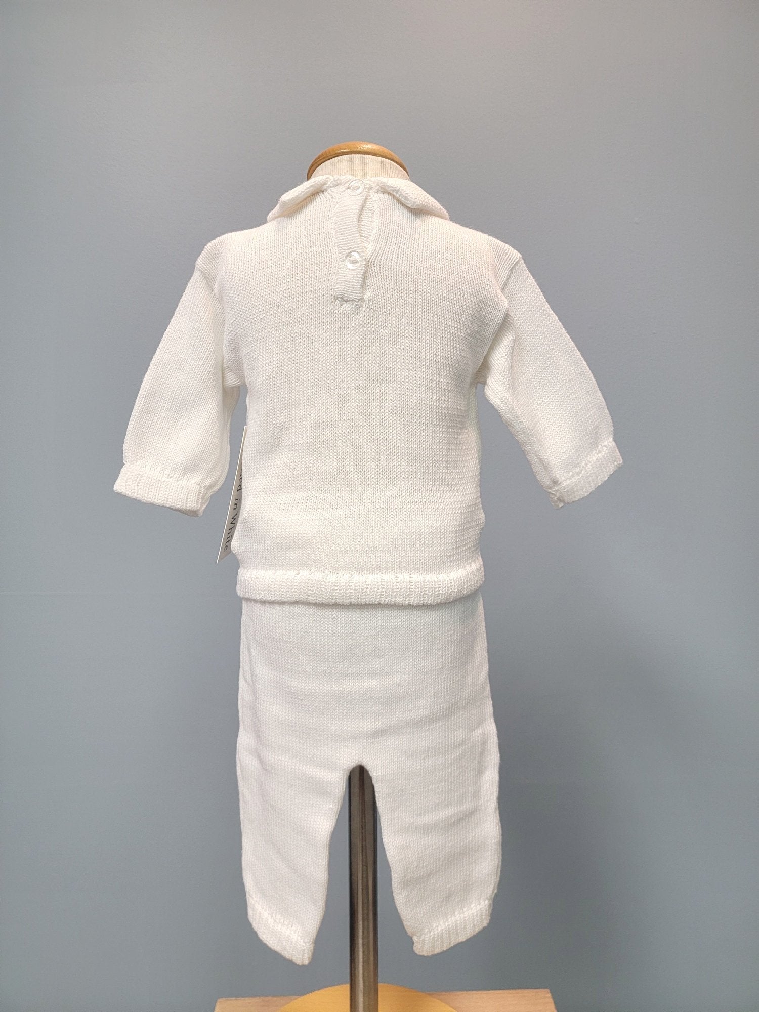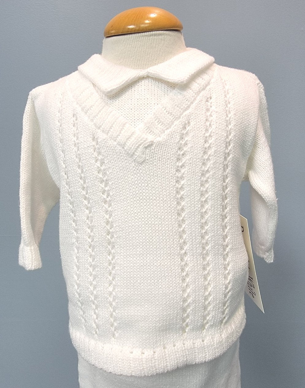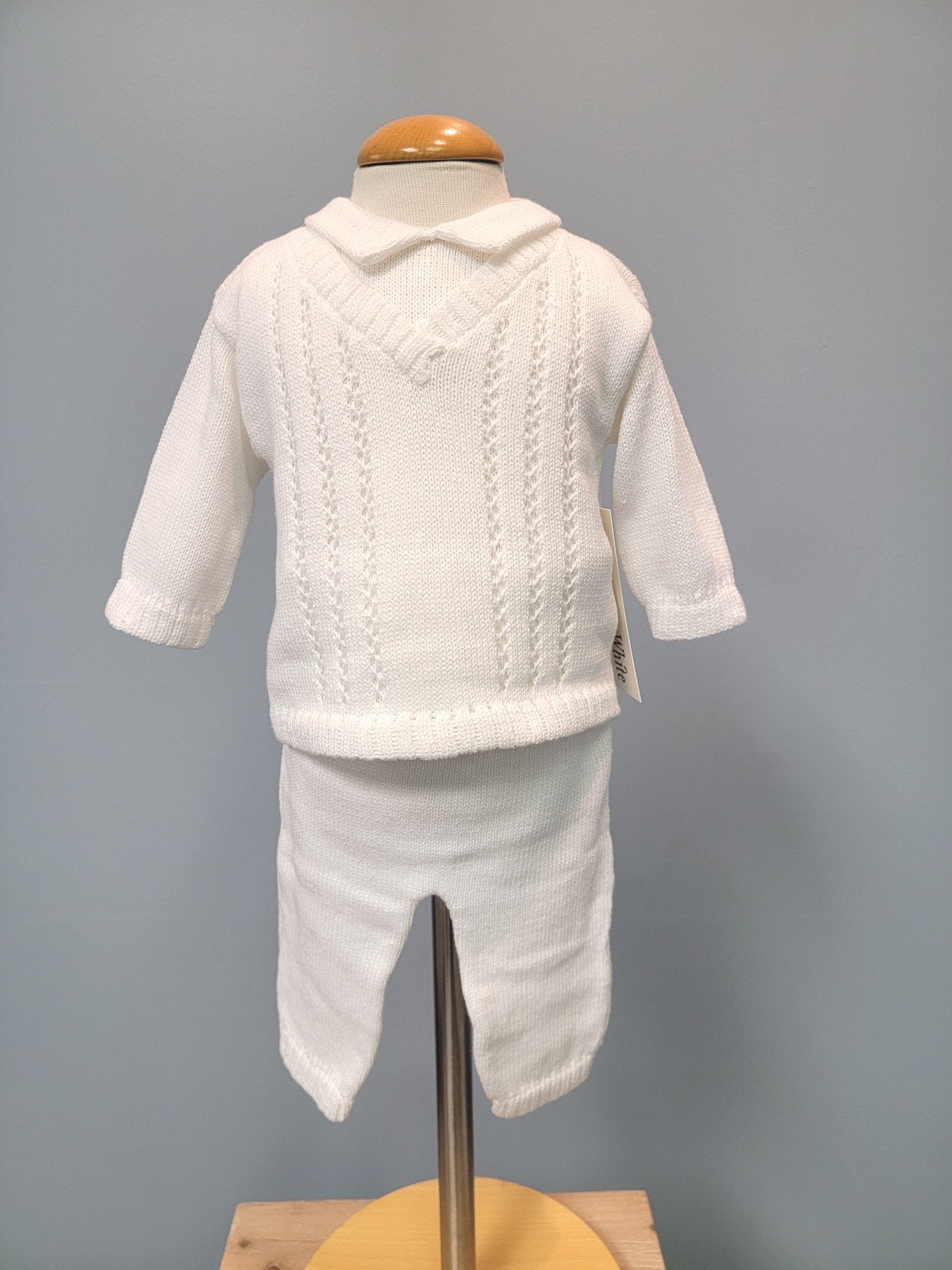 This baby boy set is ideal for baby blessings or christenings. It is a 2 piece set that comes with long pants, a simple cap, and top. The top features a vest-like front with decorative vertical stripes, a small collar, and two buttons in the back for easy on and off. The pants have an elastic waistband. Made from a comfortable and soft knit fabric. Hand wash. Imported.