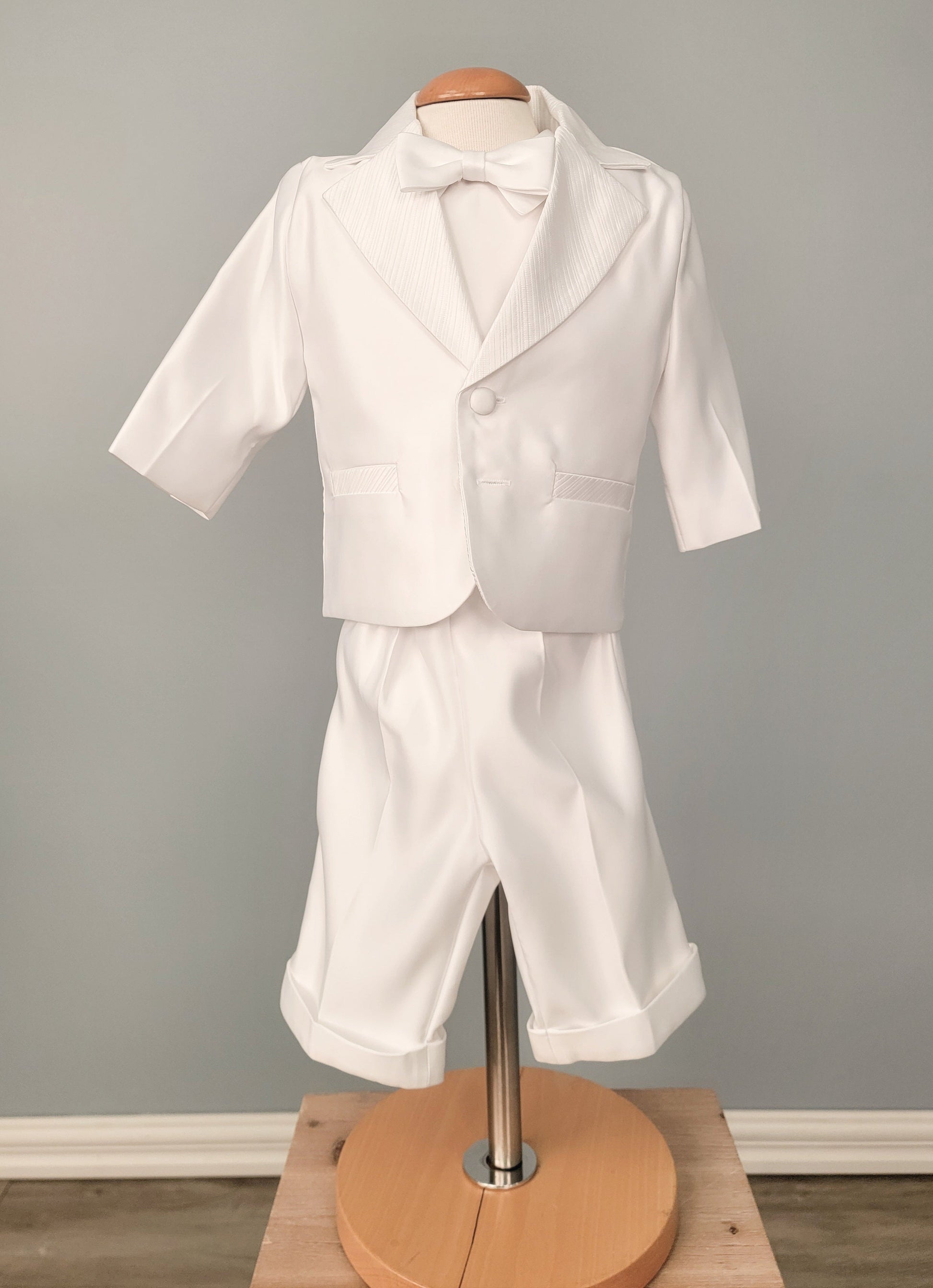 This versatile satin tuxedo can be used for a baby blessing, christening, wedding, or any formal event. This is a 5 piece outfit that includes pants, a shirt, a cummerbund and a cap. Pants have an elastic waist and are cuffed at the hem. The suit jacket has two real pockets, buttons on the front, and decorative buttons at the wrists. The cummerbund is pleated and has Velcro at the back. The shirt has a sewn on bowtie with a collar, and decorative buttons at the cuffs. Imported.