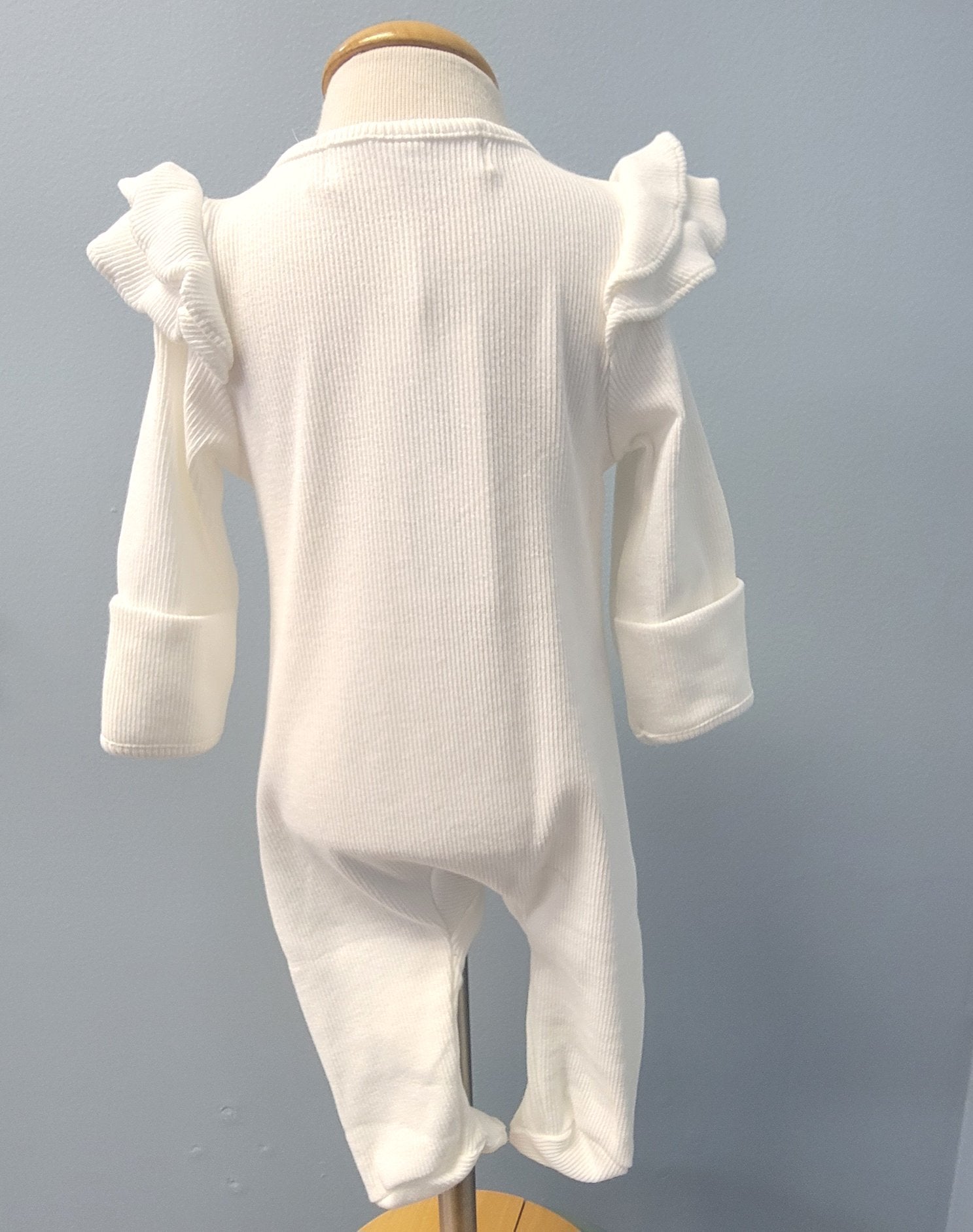 The Sophie Romper has a stretchy ribbed design over the entire surface. It features a full zipper opening in the front and cute long sleeves with ruffles on the shoulders. It has covers for the feet and covers for the hands that fold back. This versatile white Romper is perfect to be worn for a special occasion, such as a christening or baby blessing, or for casual everyday wear.