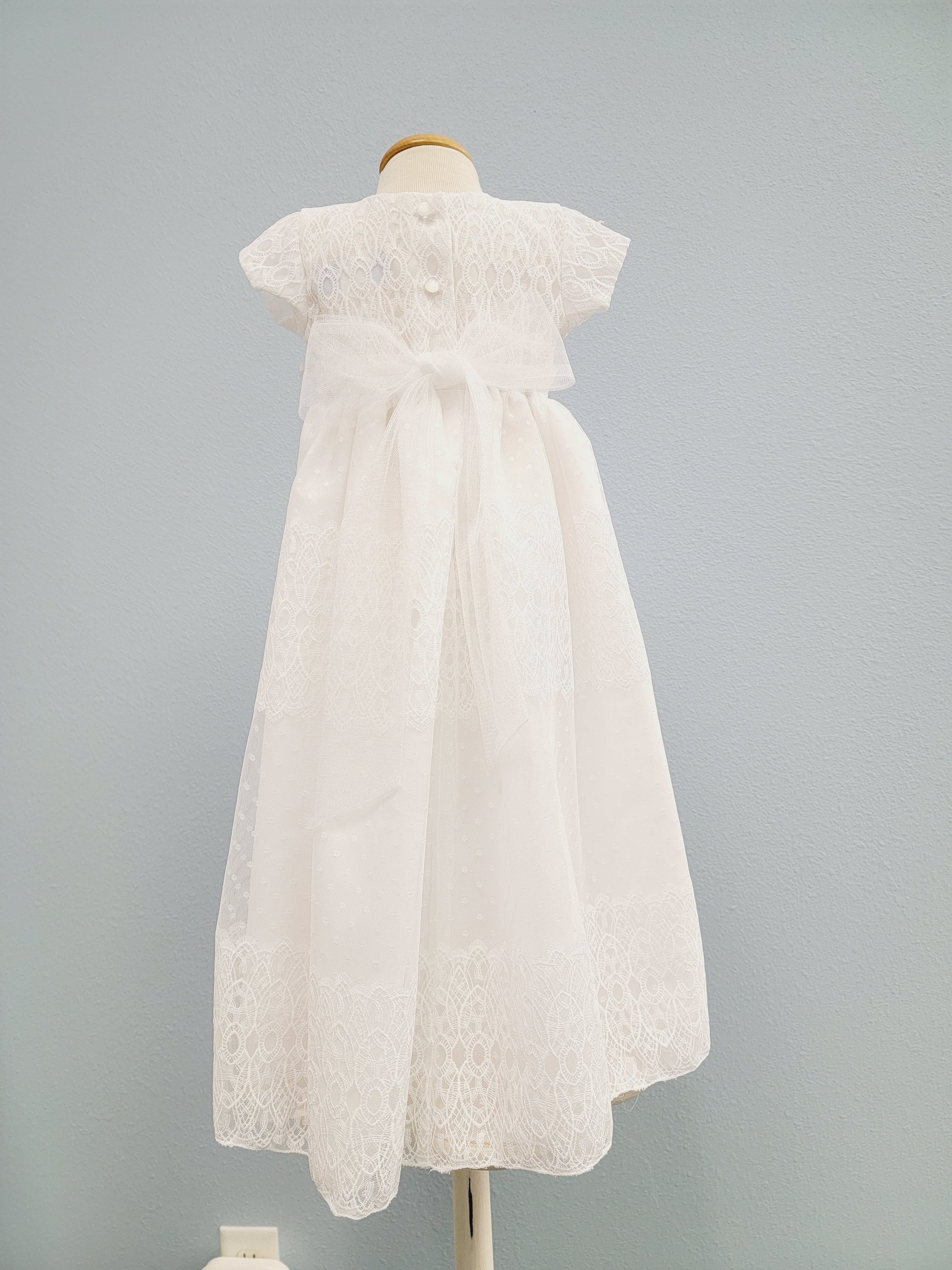 This darling dress has an embroidered tulle and swiss dot overlay, and layers under the skirt for fullness. It has a lace bodice with a ribbon at the waist, pearl button back closure and tulle tie in the back. Perfect to be worn as a Girls Christening dress or a Baby Blessing Dress. Includes a cute matching bonnet. Made in the USA.