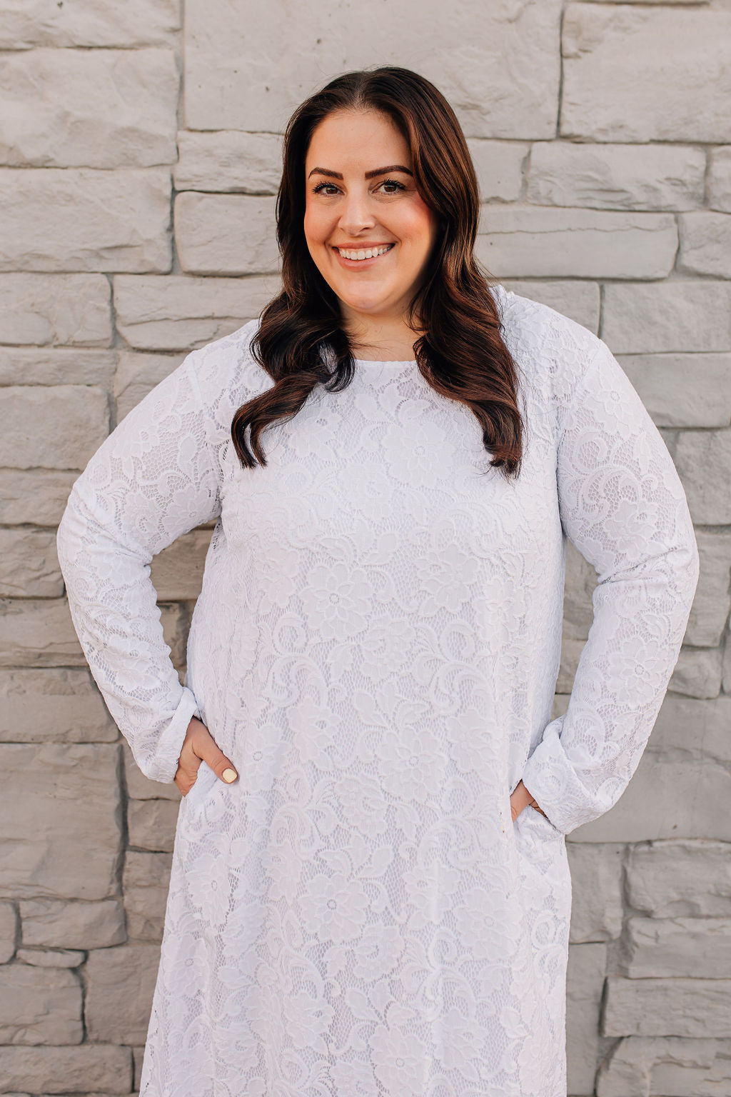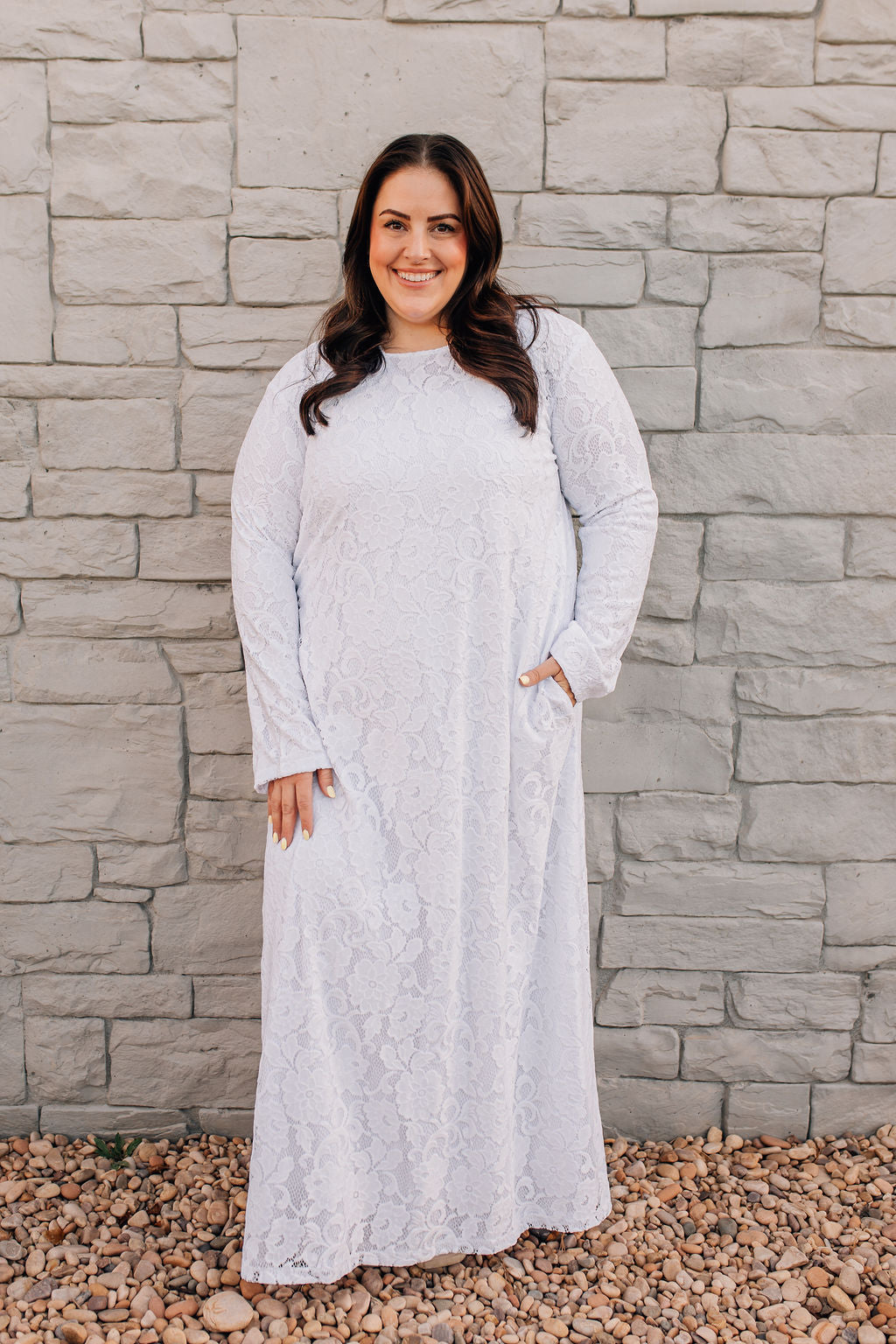 This lace dress is both beautiful and comfortable. The straight silhouette and lace design is flattering to any figure. There are two side seam pockets that are hidden from view. The entire dress is lined, and there is no back zipper or opening. Wear it as an LDS temple dress or for any special occasions.