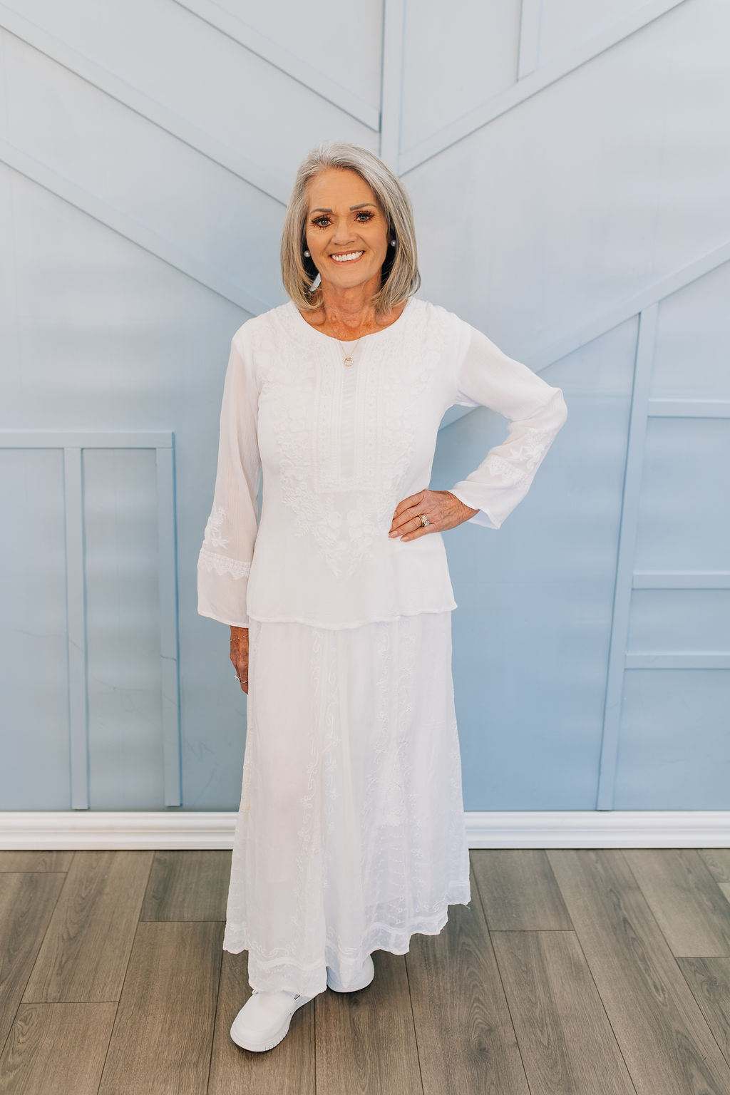 This lightweight skirt has an embroidered floral pattern trailing throughout. The ruffle hem and godets add fullness without adding weight or extra bulk. Features a pocket on the elastic waistline with button closure. This skirt pairs beautifully with our Gauze Blouse. This skirt is lined.