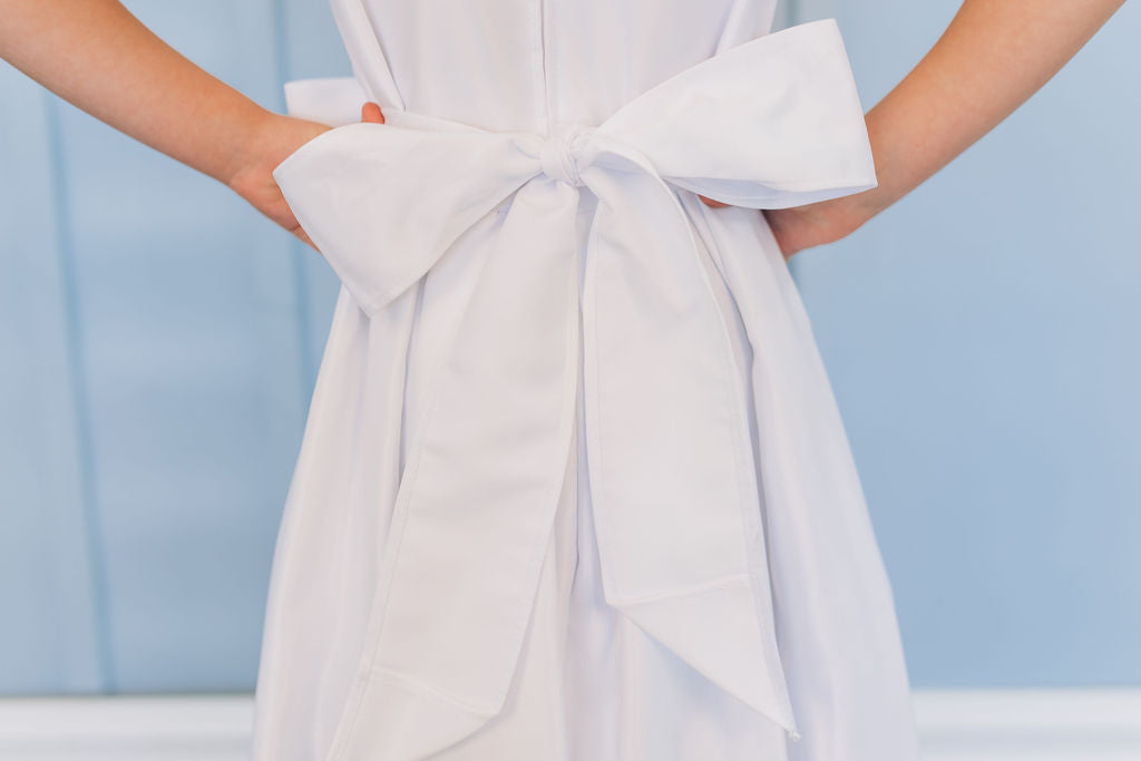 This adorable satin dress is perfect for any LDS baptism or communion. The flutter sleeves and bow on the front are the perfect adorable accents. This dress zips up the back and has a satin tie in the back. Imported. Made in the USA.