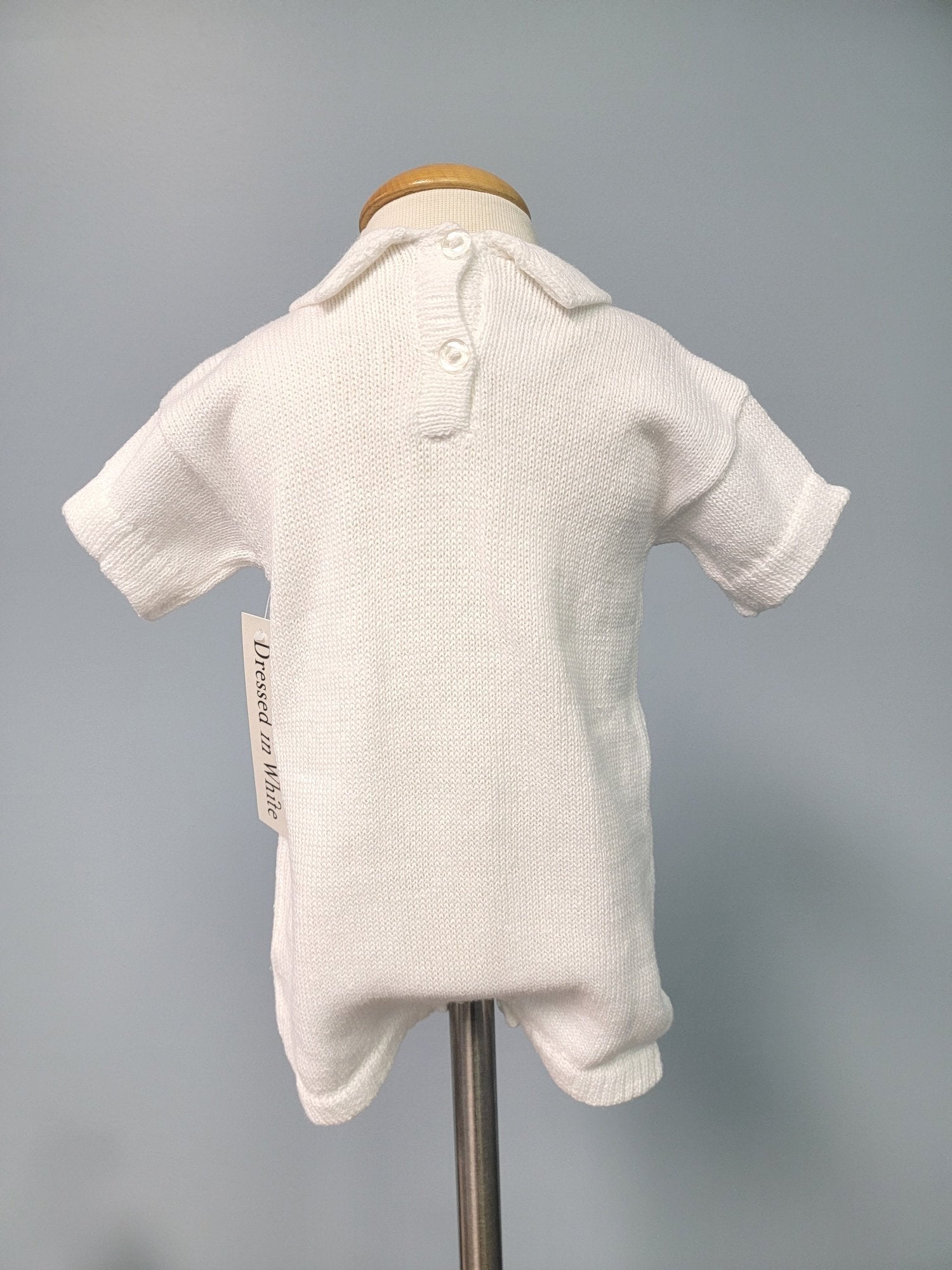 This adorable romper is a one piece outfit that slips over the head with bottom buttons for diaper changing and back neck buttons on the top. It has cute imitation pocket designs and is perfect for baby blessings or christenings.